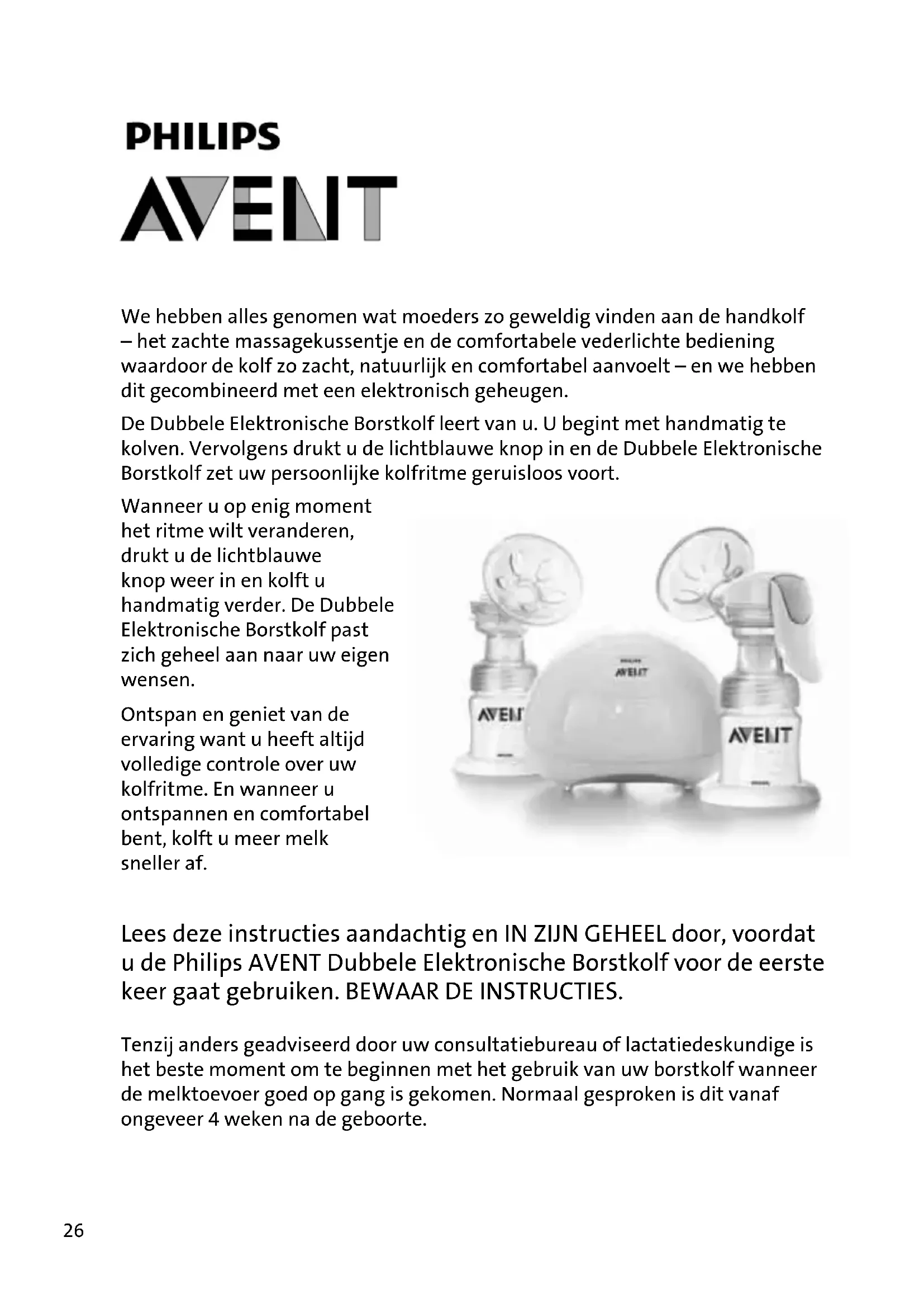 - Kontinuierliches Blinken: das Steuerkabel ist nicht korrekt angebracht worden oder defekt. 25We hebben alles genomen wat moeders zo geweldig vinden aan de handkolf – het zachte massagekussentje en de comfortabele vederlichte bediening waardoor de kolf zo zacht, natuurlijk en comfortabel aanvoelt – en we hebben dit gecombineerd met een elektronisch geheugen. De Dubbele Elektronische Borstkolf leert van u. U begint met handmatig te kolven. Vervolgens drukt u de lichtblauwe knop in en de Dubbele Elektronische Borstkolf zet uw persoonlijke kolfritme geruisloos voort. Wanneer u op enig moment het ritme wilt veranderen, drukt u de lichtblauwe knop weer in en kolft u handmatig verder. De Dubbele Elektronische Borstkolf past zich geheel aan naar uw eigen wensen. Ontspan en geniet van de ervaring want u heeft altijd volledige controle over uw kolfritme. En wanneer u ontspannen en comfortabel bent, kolft u meer melk sneller af. Lees deze instructies aandachtig en IN ZIJN GEHEEL door, voordat u de Philips AVENT Dubbele Elektronische Borstkolf voor de eerste keer gaat gebruiken. BEWAAR DE INSTRUCTIES. Tenzij anders geadviseerd door uw consultatiebureau of lactatiedeskundige is het beste moment om te beginnen met het gebruik van uw borstkolf wanneer de melktoevoer goed op gang is gekomen. Normaal gesproken is dit vanaf ongeveer 4 weken na de geboorte. 26Bedieningskolf en tweede kolf (afbeeldingen A1 en A2) 1 x Bedieningshendel 2 x Siliconen membranen 2 x Witte ventielen 2 x Trechters/kolfgedeeltes 2 x Bewaarflessen voor moedermelk (2 x 125ml) / Adapterring 2 x Houders/Trechterafdekkingen 2 x Siliconen massagekussentjes 1 x Verbindingskabel 2 x Transparante slangetjes 1 x Dubbele slangetjes 1 x Aansluiting voor dubbel kolven 1 x Kolfmotor 1 x Elektrische adapter 1 x Elektriciteitssnoer Bedieningshendel* (afbeelding B)