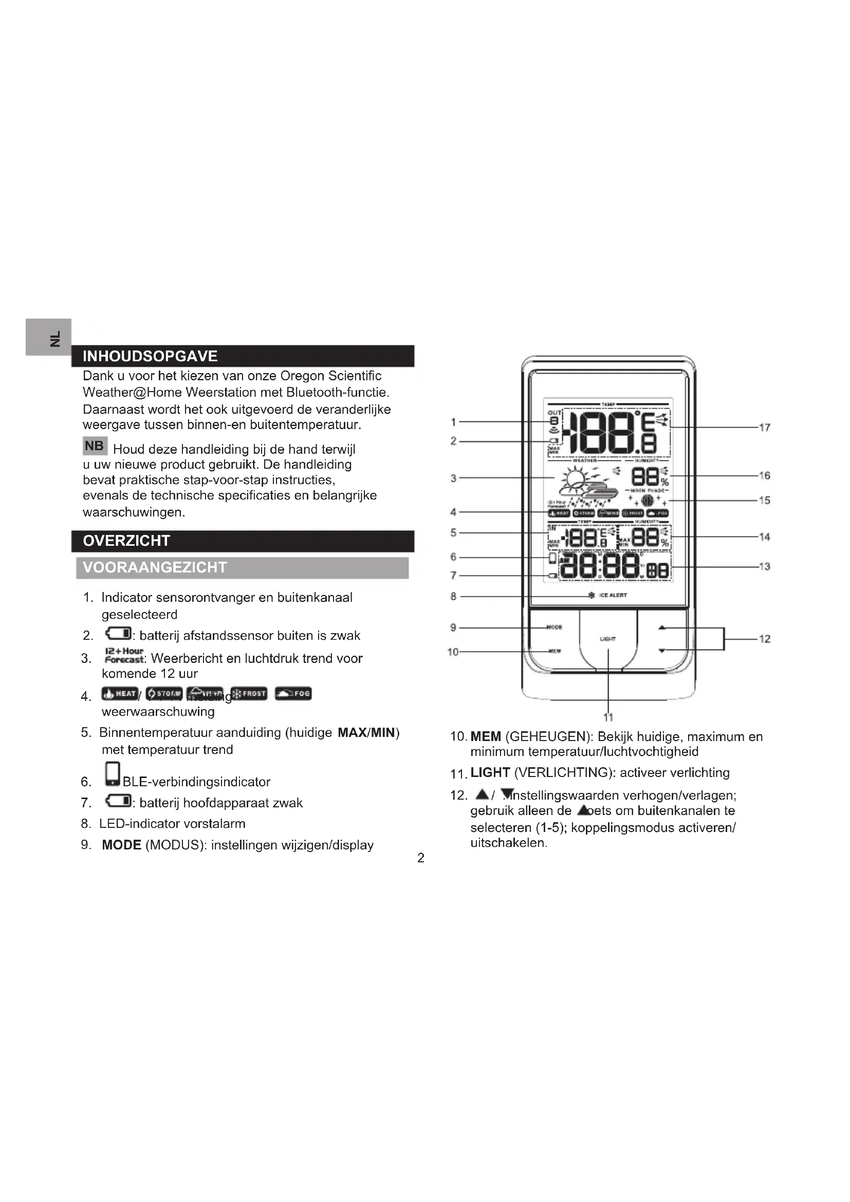 INHOUDSOPGAVE Dank u voor het kiezen van onze Oregon Scientic Weather@Home Weerstation met Bluetooth-functie. Daarnaast wordt het ook uitgevoerd de veranderlijke weergave tussen binnen-en buitentemperatuur.