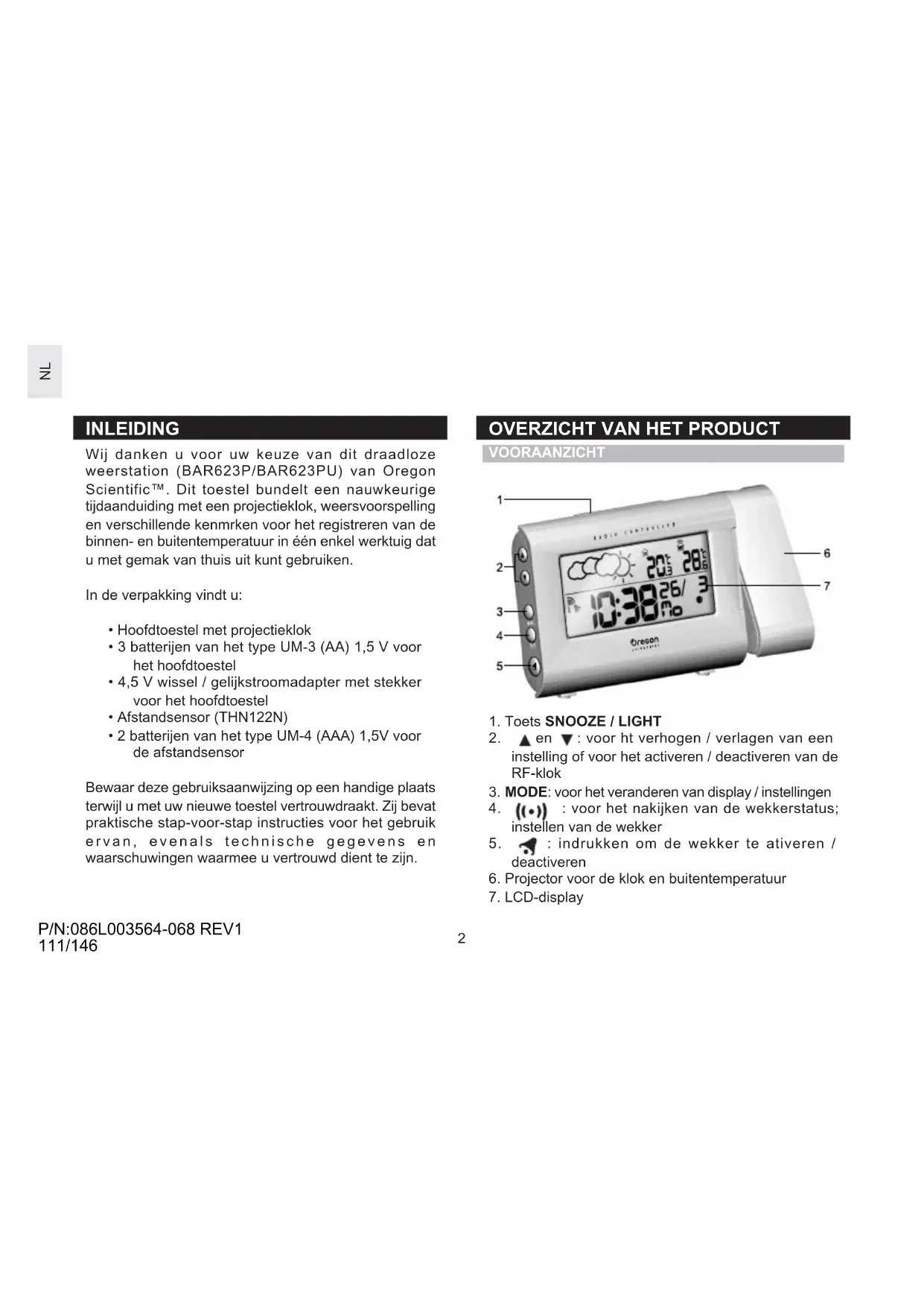 INLEIDING Wij danken u voor uw keuze van dit draadloze weerstation (BAR623P/BAR623PU) van Oregon Scientific™. Dit toestel bundelt een nauwkeurige tijdaanduiding met een projectieklok, weersvoorspelling en verschillende kenmrken voor het registreren van de binnen- en buitentemperatuur in één enkel werktuig dat u met gemak van thuis uit kunt gebruiken. In de verpakking vindt u: