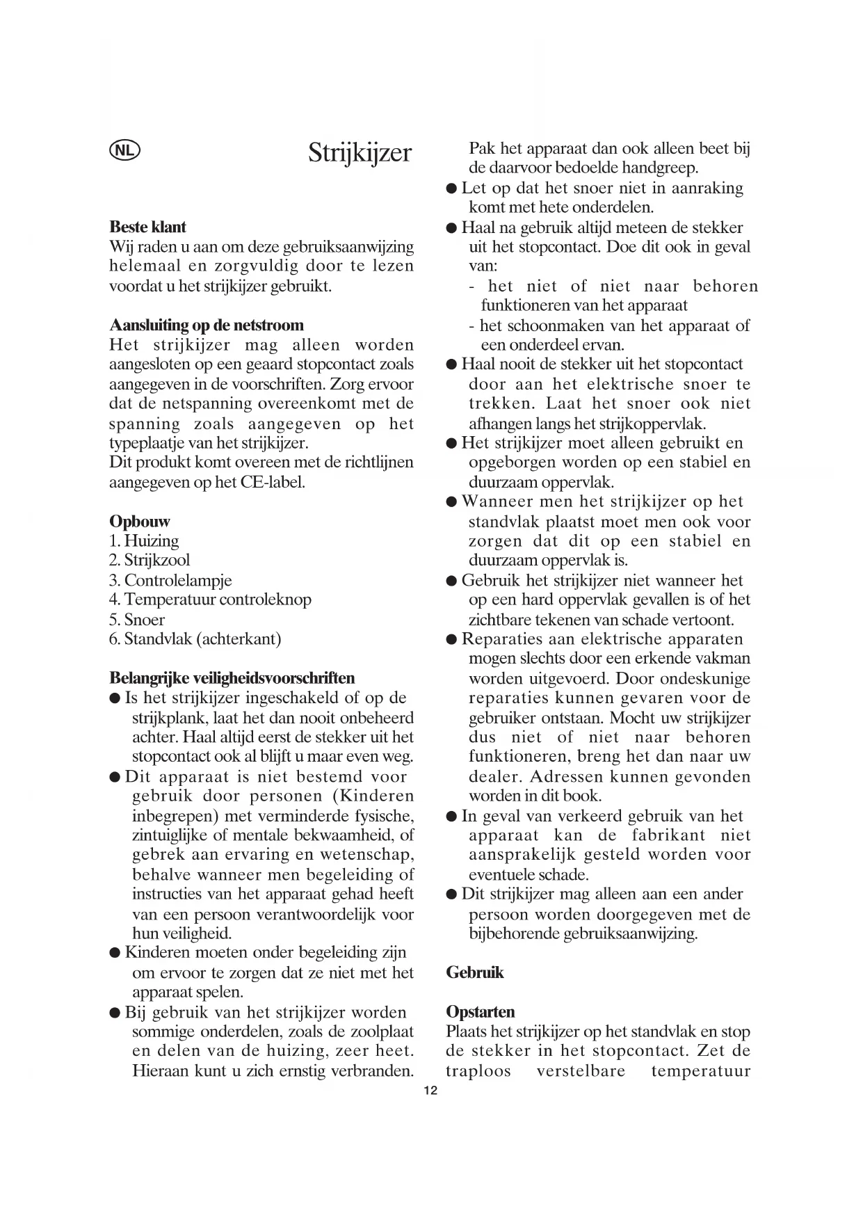 Belangrijke veiligheidsvoorschriften ● Is het strijkijzer ingeschakeld of op de strijkplank, laat het dan nooit onbeheerd achter. Haal altijd eerst de stekker uit het stopcontact ook al blijft u maar even weg. ● Dit apparaat is niet bestemd voor gebruik door personen (Kinderen inbegrepen) met verminderde fysische, zintuiglijke of mentale bekwaamheid, of gebrek aan ervaring en wetenschap, behalve wanneer men begeleiding of instructies van het apparaat gehad heeft van een persoon verantwoordelijk voor hun veiligheid. ● Kinderen moeten onder begeleiding zijn om ervoor te zorgen dat ze niet met het apparaat spelen. ● Bij gebruik van het strijkijzer worden sommige onderdelen, zoals de zoolplaat en delen van de huizing, zeer heet. Hieraan kunt u zich ernstig verbranden. Pak het apparaat dan ook alleen beet bij de daarvoor bedoelde handgreep. ● Let op dat het snoer niet in aanraking komt met hete onderdelen. ● Haal na gebruik altijd meteen de stekker uit het stopcontact. Doe dit ook in geval van: - het niet of niet naar behoren funktioneren van het apparaat - het schoonmaken van het apparaat of een onderdeel ervan. ● Haal nooit de stekker uit het stopcontact door aan het elektrische snoer te trekken. Laat het snoer ook niet afhangen langs het strijkoppervlak. ● Het strijkijzer moet alleen gebruikt en opgeborgen worden op een stabiel en duurzaam oppervlak. ● Wanneer men het strijkijzer op het standvlak plaatst moet men ook voor zorgen dat dit op een stabiel en duurzaam oppervlak is. ● Gebruik het strijkijzer niet wanneer het op een hard oppervlak gevallen is of het zichtbare tekenen van schade vertoont. ● Reparaties aan elektrische apparaten mogen slechts door een erkende vakman worden uitgevoerd. Door ondeskunige reparaties kunnen gevaren voor de gebruiker ontstaan. Mocht uw strijkijzer dus niet of niet naar behoren funktioneren, breng het dan naar uw dealer. Adressen kunnen gevonden worden in dit book. ● In geval van verkeerd gebruik van het apparaat kan de fabrikant niet aansprakelijk gesteld worden voor eventuele schade. ● Dit strijkijzer mag alleen aan een ander persoon worden doorgegeven met de bijbehorende gebruiksaanwijzing. Gebruik Opstarten Plaats het strijkijzer op het standvlak en stop de stekker in het stopcontact. Zet de traploos verstelbare temperatuur