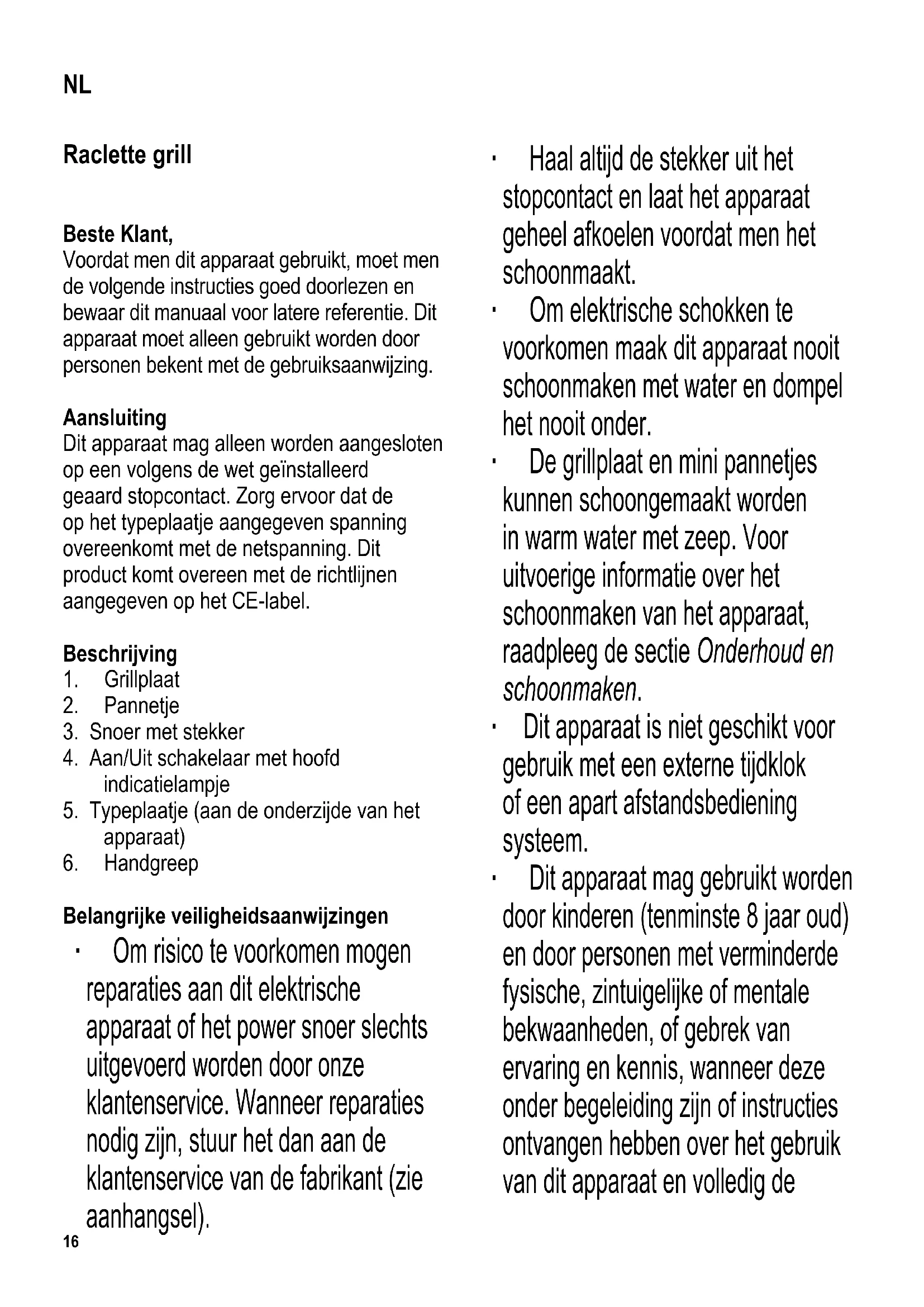 Belangrijke veiligheidsaanwijzingen ∙ Om risico te voorkomen mogen reparaties aan dit elektrische apparaat of het power snoer slechts uitgevoerd worden door onze klantenservice. Wanneer reparaties nodig zijn, stuur het dan aan de klantenservice van de fabrikant (zie aanhangsel). ∙ Haal altijd de stekker uit het stopcontact en laat het apparaat geheel afkoelen voordat men het schoonmaakt. ∙ Om elektrische schokken te voorkomen maak dit apparaat nooit schoonmaken met water en dompel het nooit onder. ∙ De grillplaat en mini pannetjes kunnen schoongemaakt worden in warm water met zeep. Voor uitvoerige informatie over het schoonmaken van het apparaat, raadpleeg de sectie Onderhoud en schoonmaken. ∙ Dit apparaat is niet geschikt voor gebruik met een externe tijdklok of een apart afstandsbediening systeem. ∙ Dit apparaat mag gebruikt worden door kinderen (tenminste 8 jaar oud) en door personen met verminderde fysische, zintuigelijke of mentale bekwaanheden, of gebrek van ervaring en kennis, wanneer deze onder begeleiding zijn of instructies ontvangen hebben over het gebruik van dit apparaat en volledig de NL17 gevaren en veiligheidsvoorschriften begrijpen. ∙ Kinderen mogen niet met het apparaat spelen. ∙ Kinderen mogen in geen geval dit apparaat schoonmaken of onderhoudswerkzaamheden uitvoeren behalve wanneer onder toezicht van een volwassene en ze tenminste 8 jaar oud zijn. ∙ Het apparaat en het snoer moeten altijd goed weggehouden worden van kinderen jonger dan 8 jaar. ∙ Waarschuwing: houdt kinderen weg van inpakmateriaal, daar deze een bron van gevaar zijn b.v. door verstikking. ∙ Voordat het apparaat wordt gebruikt moet zowel de hoofdeenheid als gelijk welk hulpstuk, dat wordt aangebracht, eerst zorgvuldig op eventuele defecten worden gecontroleerd. Ingeval het apparaat, bij voorbeeld, op een hard oppervlak is gevallen mag het niet meer worden gebruikt: zelfs onzichtbare beschadigingen kunnen ongewenste effecten hebben op de gebruiksveiligheid van het apparaat. ∙ Het snoer moet regelmatig op eventuele beschadiging worden gecontroleerd. Wanneer een beschadiging wordt geconstateerd mag het apparaat niet meer worden gebruikt. ∙ Het snoer moet vrijgehouden worden van hete onderdelen van het apparaat. ∙ Waarschuwing: er is gevaar voor verbranding. De oppervlaktes van de huizing, grill areas en mini pannetjes worden heet tijdens gebruik. ∙ Laat dit apparaat nooit onbeheerd achter. ∙ Tijdens gebruik moet het apparaat altijd op een hittebestendige ondergrond geplaatst zijn die tevens bestand is tegen spetteren en vlekken. Wanneer men voedsel roostert met een hoog vetgehalte kan spetteren niet altijd voorkomen worden. ∙ De grill niet bij een muur of in een hoek plaatsen, en zorg ervoor dat in de buurt ervan geen ontvlambare materialen worden opgeslagen. ∙ De grillplaat moet boven op het apparaat en over het verwarmingselement geplaatst en vergrendeld worden voordat hij gebruikt wordt. ∙ Pas op: Gebruik dit apparaat niet buitenshuis. ∙ Verwijder altijd de stekker uit het stopcontact: - na gebruik, - wanneer het apparaat niet werkt, - wanneer men het apparaat schoonmaakt. ∙ Trek de stekker niet aan het snoer uit het stopcontact, trek aan de stekker zelf. ∙ Dit apparaat mag alleen gebruikt worden met de door de fabrikant bijgeleverde hulpstukken. ∙ Geef het apparaat altijd voldoende tijd om af te koelen voordat men de grillplaat verwijdert, en voordat men de unit schoonmaakt of opbergt. ∙ De fabrikant heeft geen verantwoordelijkheid wanneer dit apparaat verkeerd gebruikt word of wanneer de veiligheidsinstructies niet gevolgd worden. ∙ Dit apparaat is bestemt voor huishoudelijk18 of gelijkwaardig gebruik, zoals - in kantoren of andere bedrijfsruimtes, - in agrarische instellingen, - door klanten in hotels, motels enz. en gelijkwaardige etablissementen, - in bed-en-ontbijt gasthuizen. Eerste ingebruikname ∙ Verwijder al het verpakkingsmateriaal. ∙ Voordat men het apparaat voor de eerste keer gebruikt, moet men eerst de grillplaat en mini pannetjes schoonmaken met een vochtige doek. ∙ Verwarm het apparaat en de pannetjes voor ongeveer 15 minuten zonder voedsel, om de typische reuk, welke van de grill afkomt wanneer men deze voor de eerste keer aanzet, te laten verdwijnen (een lichte rookontwikkeling kan zichtbaar zijn). Zorg voor voldoende ventilatie door het openen van ramen en balkondeuren. ∙ Laat de grill weer afkoelen. ∙ Maak het schoon zoals beschreven in de sectie Onderhoud en schoonmaken. Grillplaat Voordat het apparaat ingeschakeld wordt, de grillplaat bovenop het apparaat en over het verwarmingselement plaatsen en vergrendelen. Om te vergrendelen, de grillplaat naar beneden duwen en naar het symbool bewegen zodat de uitstekende tapeinden goed ingrijpen. Om te ontgrendelen, de grillplaat naar het symbool duwen. Gebruik ∙ Plaats de grillplaat op de unit zoals hierboven beschreven. Steek de stekker in het stopcontact en zet het apparaat aan. ∙ Na ongeveer 10 minuten voorverwarmen, zal het apparaat klaar zijn voor gebruik. Plaats het te koken voedsel op de grillplaat. Wij bevelen aan dat men eerst een licht laagje olie aanbrengt op de plaat om aanbakken te voorkomen. ∙ Plaats de raclette kaas in de mini pannetjes. Plaats de mini pannetjes in het apparaat, onder het verwarmingselement, en laat ze daar totdat de kaas gesmolten is. Waarschuwing: Plaats nooit lege mini pannetjes in het apparaat wanneer het is aangezet, maat plaats deze op een hittebestendig oppervlak. ∙ Na gebruik het apparaat uitschakelen en de stekker uit het stopcontact halen. Voorbereiden van raclette kaas Snij per persoon ca. 200-300 gram zachte kaas in plakken van 3-5 mm. Doe deze plakken in de pannetjes. Bijzonder geschikt zijn raclette kaas, Tilsiter en Appenzeller. Praktische tips ∙ Ontdooi diepgevroren. ∙ Om schade aan de coating van de mini pannetjes en grillplaat te voorkomen, alleen een houten of hittebestendige plastic spatel gebruiken tijdens het grill