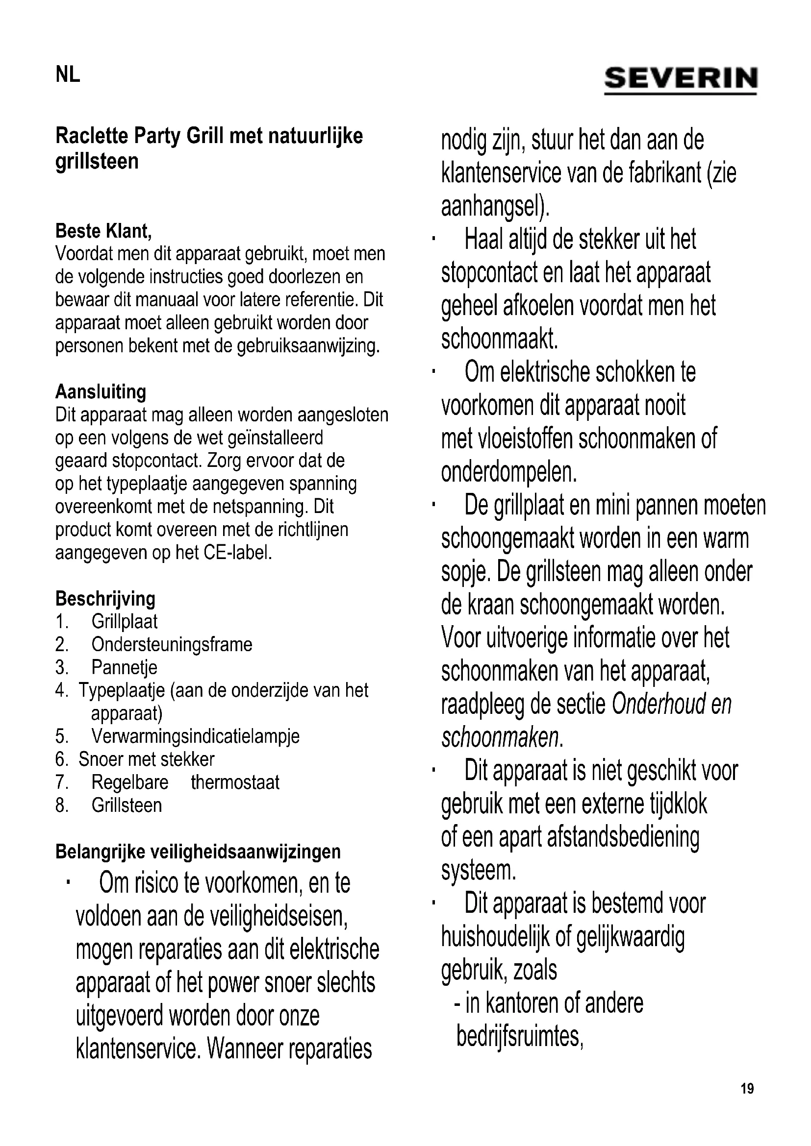Belangrijke veiligheidsaanwijzingen ∙ Om risico te voorkomen, en te voldoen aan de veiligheidseisen, mogen reparaties aan dit elektrische apparaat of het power snoer slechts uitgevoerd worden door onze klantenservice. Wanneer reparaties nodig zijn, stuur het dan aan de klantenservice van de fabrikant (zie aanhangsel). ∙ Haal altijd de stekker uit het stopcontact en laat het apparaat geheel afkoelen voordat men het schoonmaakt. ∙ Om elektrische schokken te voorkomen dit apparaat nooit met vloeistoffen schoonmaken of onderdompelen. ∙ De grillplaat en mini pannen moeten schoongemaakt worden in een warm sopje. De grillsteen mag alleen onder de kraan schoongemaakt worden. Voor uitvoerige informatie over het schoonmaken van het apparaat, raadpleeg de sectie Onderhoud en schoonmaken. ∙ Dit apparaat is niet geschikt voor gebruik met een externe tijdklok of een apart afstandsbediening systeem. ∙ Dit apparaat is bestemd voor huishoudelijk of gelijkwaardig gebruik, zoals - in kantoren of andere bedrijfsruimtes, NL20 - in agrarische instellingen, - door klanten in hotels, motels enz. en gelijkwaardige etablissementen, - in bed-en-ontbijt gasthuizen. ∙ Dit apparaat mag gebruikt worden door kinderen (tenminste 8 jaar oud) en door personen met verminderde fysische, zintuiglijke of mentale bekwaamheden, of gebrek van ervaring en kennis, wanneer deze onder begeleiding zijn of instructies ontvangen hebben over het gebruik van dit apparaat en volledig de gevaren en veiligheidsvoorschriften begrijpen. ∙ Kinderen mogen niet met het apparaat spelen. ∙ Kinderen mogen in geen geval dit apparaat schoonmaken of onderhoudswerkzaamheden uitvoeren behalve wanneer onder toezicht van een volwassene en ze tenminste 8 jaar oud zijn. ∙ Het apparaat en het snoer moeten altijd goed weggehouden worden van kinderen jonger dan 8 jaar. ∙ Waarschuwing: Houdt kinderen weg van inpakmateriaal, daar deze een bron van gevaar zijn bv. door verstikking. ∙ Voordat het apparaat gebruikt wordt moet het hoofddeel inclusief het snoer evenals welk hulpstuk dan ook dat wordt aangebracht, zorgvuldig gecontroleerd worden op eventuele gebreken of defecten. Ingeval het apparaat, bijvoorbeeld, op een hard oppervlak is gevallen, of wanneer men met overdadige kracht aan het power snoer getrokken heeft, mag men het niet meer gebruiken: zelfs onzichtbare beschadiging kan ongewenste effecten hebben op de gebruiksveiligheid van het apparaat. ∙ Het snoer moet vrijgehouden worden van hete onderdelen van het apparaat. ∙ Waarschuwing: Er is gevaar voor verbranding. De oppervlaktes van de behuizing, het grill gebied en mini pannetjes worden heet tijdens gebruik. ∙ Laat dit apparaat nooit onbeheerd achter. ∙ Tijdens gebruik moet het apparaat altijd op een hittebestendige ondergrond geplaatst zijn die tevens bestand is tegen spetteren en vlekken. Wanneer men voedsel roostert met een hoog vetgehalte kan spetteren niet altijd voorkomen worden. ∙ De grill niet bij een muur of in een hoek plaatsen, en zorg ervoor dat in de buurt ervan geen ontvlambare materialen worden opgeslagen. ∙ Voor gebruik, moet men de grillsteen en grillplaat boven op het apparaat geplaatst worden, over het verwarmingselement. ∙ Pas op: Gebruik dit apparaat niet buitenshuis. ∙ Verwijder altijd de stekker uit het stopcontact: - na gebruik, - wanneer het apparaat niet werkt, - wanneer men het apparaat schoonmaakt.21 ∙ Trek de stekker niet aan het snoer uit het stopcontact, trek aan de stekker zelf. ∙ Dit apparaat mag alleen gebruikt worden met de door de fabrikant bijgeleverde hulpstukken. ∙ Geef het apparaat altijd voldoende tijd om af te koelen voordat men de grillsteen en grillplaat verwijdert, en voordat men de unit schoonmaakt of opbergt. ∙ De fabrikant heeft geen verantwoordelijkheid wanneer dit apparaat verkeerd gebruikt word of wanneer de veiligheidsinstructies niet gevolgd worden. Gebruik Eerste ingebruikname Verwijder al het verpakkingsmateriaal. Voordat men het apparaat voor de eerste keer gebruikt, moet men de grillsteen, grillplaat en mini pannetjes schoonmaken met een vochtige doek. Wij adviseren u om voor het eerste gebruik het apparaat en de mini pannetjes ca. 10 minuten op max. stand zonder vlees te verwarmen, zodat de reuk, van het apparaat zelf, kan verdwijnen (hierbij kan een lichte rookontwikkeling ontstaan, zorg voor goede ventilatie). Steen ∙ Breng de steen op het apparaat aan boven het verwarmingselement, met de gepolijste kant naar boven gericht. Het dikkere middengedeelte van de steen moet men stevig tussen de twee rails van het frame plaatsten zodanig dat het goed in positie blijft. ∙ Let wel: Een koude steen mag niet op een heet element worden aangebracht. ∙ De steen kan, naar wens, worden gebruikt voor het koken van groenten, van in schijven gesneden vlees of vis, etc. ∙ Deze steen is gemaakt van natuurlijk materiaal. Kleine barsten erin zijn het resultaat van het natuurlijk uitzetten en krimpen ervan tijdens het verwarmen en afkoelen, terwijl ook een verandering in een donkerder kleur normaal is; een en ander heeft echter geen nadelige effecten. ∙ Plaats geen diepgevroren voedsel of items die azijn bevatten (zoals zure augurken of mosterd) op de steen. Grillplaat Voordat men het apparaat aanzet, moet men de plaat boven op het apparaat plaatsen, over het verwarmingselement met de geribbelde kant boven. Zorg ervoor dat de inkepingen aan de onderkant over de rails van het frame passen zodanig dat de plaat niet kan schuiven. ∙ De grillplaat kan gebruikt worden voor het koken van groenten, vlees of vis. Regelbare thermostaat ∙ De verstelbare thermostaat controleert de gebruikstijd van het verwarmingselement, met het indicatielampje wat de huidige gebruiksstatus aangeeft. Verwarmingselement aan = indicatielampje aan Verwarmingselement uit = indicatielampje uit ∙ Voor het smelten van kaas en voor grillen, moet de maximale zetting gebruikt worden (thermostaat controle geheel naar rechts draaien). Om het voe