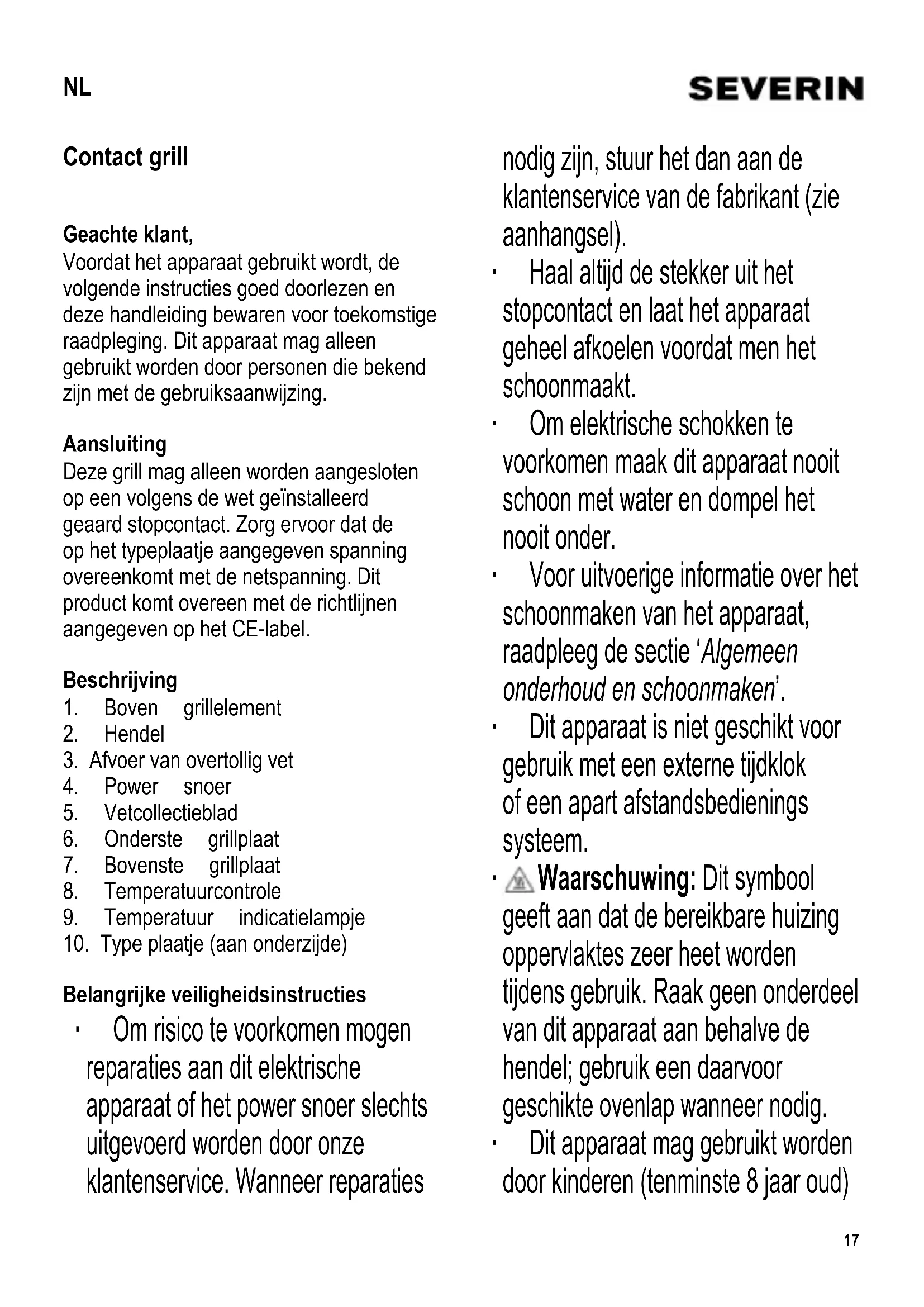 Waarschuwing: Dit symbool geeft aan dat de bereikbare huizing oppervlaktes zeer heet worden tijdens gebruik. Raak geen onderdeel van dit apparaat aan behalve de hendel; gebruik een daarvoor geschikte ovenlap wanneer nodig. ∙ Dit apparaat mag gebruikt worden door kinderen (tenminste 8 jaar oud) NL18 en door personen met verminderde fysische, zintuigelijke of mentale bekwaanheden, of gebrek van ervaring en kennis, wanneer deze onder begeleiding zijn of instructies ontvangen hebben over het gebruik van dit apparaat en volledig de gevaren en veiligheidsvoorschriften begrijpen. ∙ Kinderen mogen niet met het apparaat spelen. ∙ Kinderen mogen in geen geval dit apparaat schoonmaken of onderhoudswerkzaamheden uitvoeren behalve wanneer onder toezicht van een volwassene en ze tenminste 8 jaar oud zijn. ∙ Het apparaat en het snoer moeten altijd goed weggehouden worden van kinderen jonger dan 8 jaar. ∙ Waarschuwing: houdt kinderen weg van inpakmateriaal, daar deze een bron van gevaar zijn b.v. door verstikking. ∙ Voordat het apparaat wordt gebruikt moet zowel de hoofdeenheid inclusief het powersnoer als gelijk welk hulpstuk, dat wordt aangebracht, eerst zorgvuldig op eventuele defecten worden gecontroleerd. Ingeval het apparaat, bijvoorbeeld, op een hard oppervlak is gevallen, of wanneer men met overdadige kracht aan het power snoer getrokken heeft, mag men het niet meer gebruiken: zelfs onzichtbare beschadiging kan ongewenste effecten hebben op de gebruiksveiligheid van het apparaat. ∙ Zorg dat de huizing of het snoer niet in aanraking komen met hete oppervlaktes (zoals kookplaten) of in contact komen met andere hittebronnen. ∙ Gebruik de grill nooit zonder dat de kookplaten geïnstalleerd zijn. ∙ Tijdens gebruik moet de grill altijd op een hittebestendige ondergrond geplaatst zijn die tevens bestand is tegen spetteren en vlekken. Wanneer men voedsel grilt met een hoog vetgehalte kan spetteren niet altijd voorkomen worden. ∙ Schakel het apparaat altijd uit en verwijder de stekker uit het stopcontact: - na gebruik, - wanneer het apparaat niet werkt, - wanneer men het apparaat schoonmaakt. ∙ Trek de stekker niet aan het snoer uit het stopcontact, trek aan de stekker zelf. ∙ Voordat men het apparaat verplaatst of opbergt moet men ervoor zorgen dat het altijd volledig afgekoeld is. ∙ Gebruik de hendel niet om het apparaat te dragen. ∙ Wordt dit apparaat op een verkeerde manier gebruikt of worden de veiligheidsregels niet gevolgd, dan kan de fabrikant niet aansprakelijk worden gesteld voor eventuele schades. ∙ Dit apparaat is bestemd voor huishoudelijk of gelijkwaardig gebruik, zoals - in winkels, kantoren of andere bedrijfsruimtes, - in agrarische instellingen,19 - door klanten in hotels, motels enz. en gelijkwaardige etablissementen, - in bed-and breakfast gasthuizen. Indicatielampje Het rode hoofdindicatielampje zal aanblijven terwijl het apparaat aan het opwarmen is. Temperatuurcontrole De benodigde grilltemperatuur kan onafgebroken versteld worden van MIN (warmhouden) naar MAX (grillen). Voor het eerste gebruik ∙ Maak de geplaatste grillplaten schoon met een vochtige, pluisvrije doek en veeg hierna goed droog. ∙ Sluit nu het apparaat. ∙ Stop de stekker in het stopcontact. Zet de temperatuurcontrole naar de MAX positie. ∙ Het is aanbevolen om de grill op te warmen voor tenminste 15 minuten zonder voedsel. Dit zal de geur verwijderen die normaal aanwezig is wanneer men de grill voor het eerst aanzet. (Een kleine hoeveelheid rook kan afgegeven worden, dit is normaal, maar zorg voor voldoende ventilatie). ∙ Laat he apparaat afkoelen. ∙ Maak de grillplaten hierna schoon zoals beschreven in de sectie ‚Algemeen onderhoud en schoonmaken’. Gebruik ∙ Zet het apparaat in de gewenste gebruikspositie. Contact grillen B.v. karbonade of escalope, sandwich, panini enz.: Vouw het bovenste grillelement direct omlaag op het te grillen voedsel. Koken ‘au gratin’ B.v. geroosterde schotels: Plaats het bovenste grillelement in een loodrechte positie, trek het omhoog, breng het weer omlaag en naar voren (zie foto I), zodanig dat het boven de onderste plaat is. Barbecue-type grillen B.v. biefstuk, karbonade of escalope: Plaats het bovenste grillelement in een loodrechte positie, trek het omhoog, breng het weer omlaag en naar achteren (zie foto II), zodanig dat de grillplaten horizontaal en gelijkrichten met elkaar. ∙ Zorg dat de grillplaten juist geplaatst zijn. ∙ Zorg ervoor dat het vetcollectieblad juist geplaatst is onder de vetafvoer; leeg deze altijd regelmatig tijdens gebruik. (met BBQ-type grillen, beide vetcollectiebladen moeten in positie zijn.) ∙ Stop de stekker in het stopcontact. ∙ Gebruik de temperatuurcontrole om de gewenste temperatuurlevel in te stellen. ∙ Wacht totdat het voorverwarmen klaar is en het temperatuur indicatielampje uit gaat. ∙ De kookplaten met antiaanbaklaag behoeven maar lichtelijk ingevet te worden wanneer men deze voor het eerst gebruikt. ∙ De grill is nu klaar voor gebruik. ∙ Open de bovenste grillplaat wanneer nodig. ∙ Plaats het voedsel dat men wil koken op de grill. De kook of grilltijd hangt af van het soort voedsel dat men gebruikt. ∙ Om te voorkomen dat men de antiaanbaklaag van de bakplaten beschadigd mag men geen scherpe of puntige voorwerpen gebruiken voor het plaatsen of verwijderen van voedsel.20 ∙ Nadat men klaar is met koken, verwijder de stekker uit het stopcontact en laat de unit geheel afkoelen. Algemeen onderhoud en schoonmaken ∙ Voordat men het apparaat schoonmaakt, verwijder de stekker uit het stopcontact en zorg ervoor dat de grill volledig afgekoeld is. ∙ Om elektrische schokken te voorkomen maak dit apparaat nooit schoon met water en dompel het nooit onder. ∙ De buitenkant van de grill mag alleen schoongemaakt worden met een zachte vochtige doek. Maak het apparaat hierna droog met een droge doek. ∙ Schoonmaken van de antiaanbak grillplaten: ∙ De platen kunnen verwijdert worden voor ge