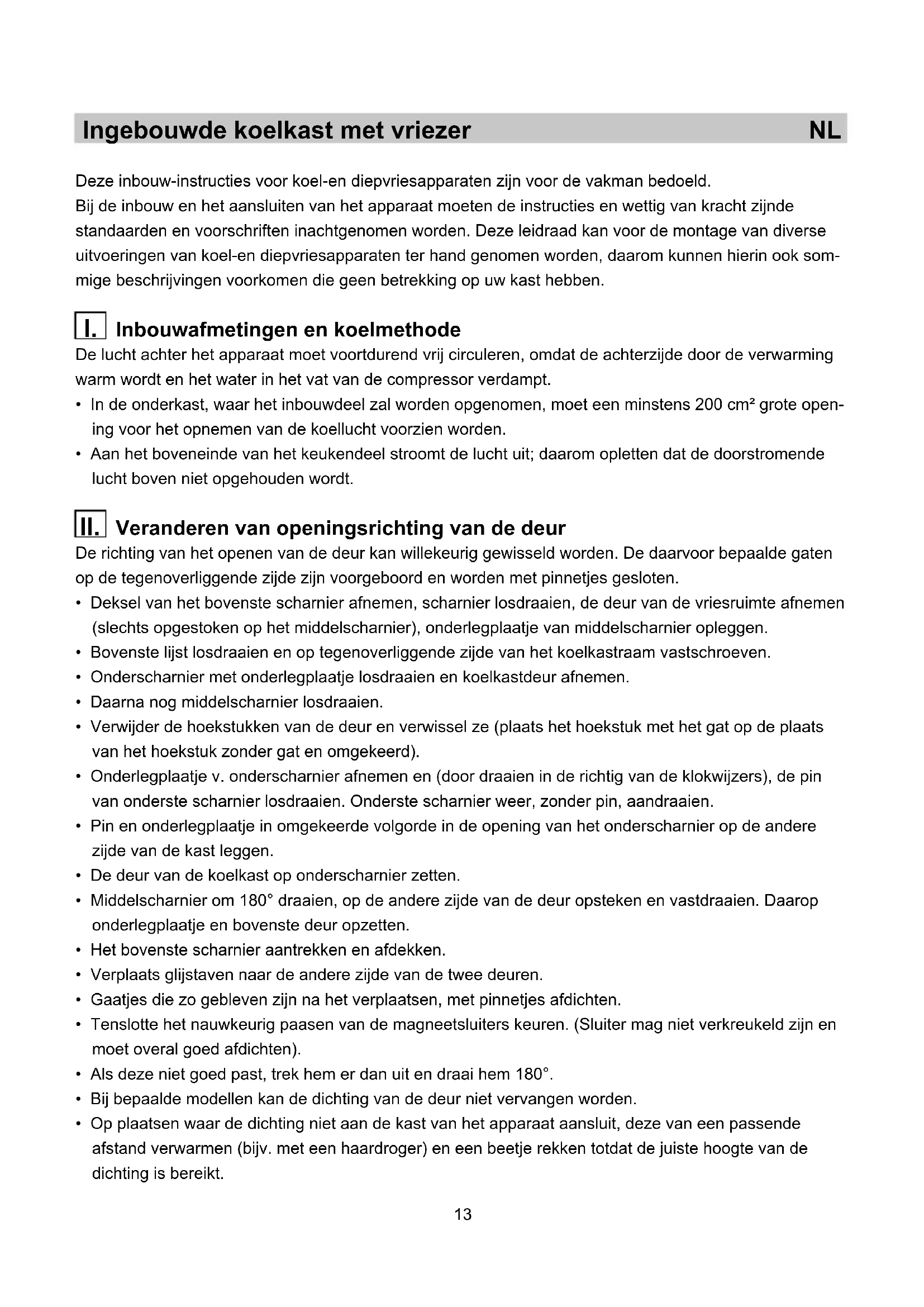 - Aan het boveneinde van het keukendeel stroomt de lucht uit; daarom opletten dat de doorstromende lucht boven niet opgehouden wordt. Veranderen van openingsrichting van de deur De richting van het openen van de deur kan willekeurig gewisseld worden. De daarvoor bepaalde gaten op de tegenoverliggende zijde zijn voorgeboord en worden met pinnetjes gesloten.