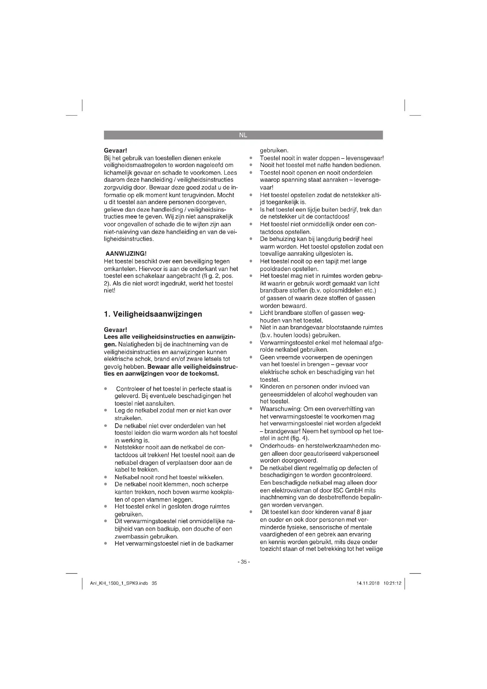 Dit toestel kan door kinderen vanaf 8 jaar en ouder en ook door personen met ver- minderde fysieke, sensorische of mentale vaardigheden of een gebrek aan ervaring en kennis worden gebruikt, mits deze onder toezicht staan of met betrekking tot het veilige Anl_KH_1500_1_SPK9.indb 35Anl_KH_1500_1_SPK9.indb 35 14.11.2018 10:21:1214.11.2018 10:21:12NL