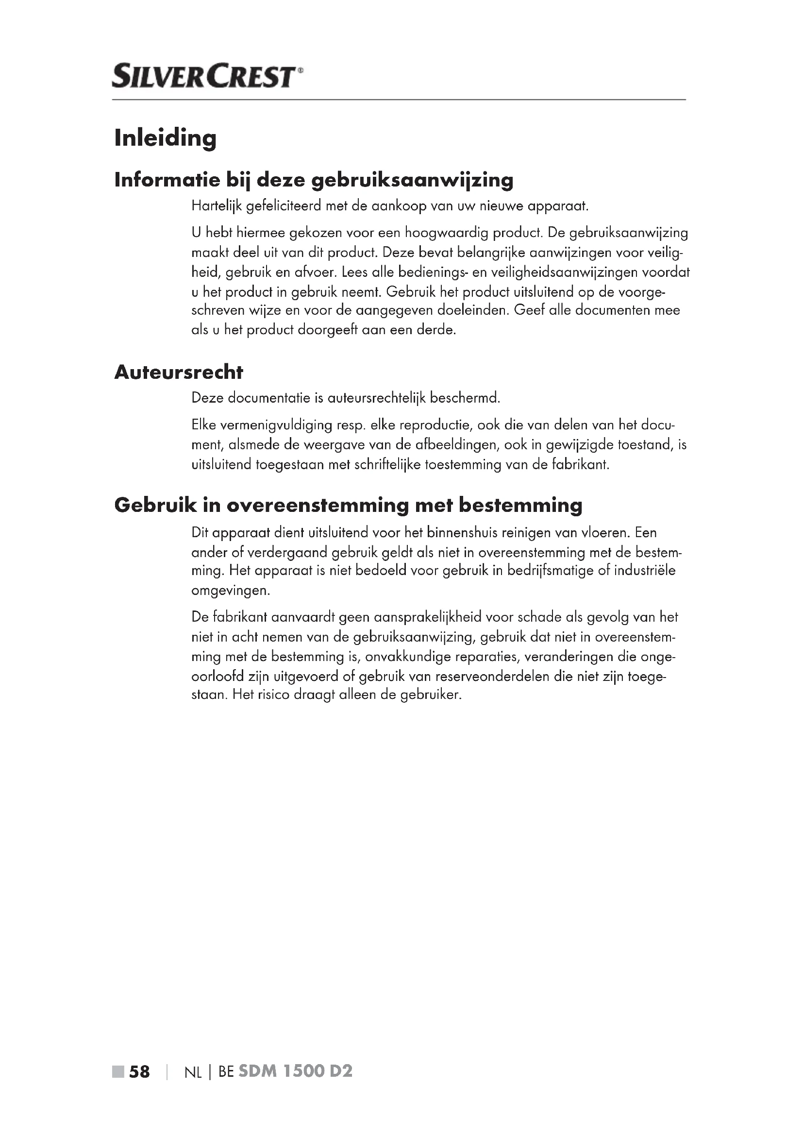 Inleiding Informatie bij deze gebruiksaanwijzing Hartelijk gefeliciteerd met de aankoop van uw nieuwe apparaat. U hebt hiermee gekozen voor een hoogwaardig product. De gebruiksaanwijzing maakt deel uit van dit product. Deze bevat belangrijke aanwijzingen voor veilig- heid, gebruik en afvoer. Lees alle bedienings- en veiligheidsaanwijzingen voordat u het product in gebruik neemt. Gebruik het product uitsluitend op de voorge- schreven wijze en voor de aangegeven doeleinden. Geef alle documenten mee als u het product doorgeeft aan een derde. Auteursrecht Deze documentatie is auteursrechtelijk beschermd. Elke vermenigvuldiging resp. elke reproductie, ook die van delen van het docu- ment, alsmede de weergave van de afbeeldingen, ook in gewijzigde toestand, is uitsluitend toegestaan met schriftelijke toestemming van de fabrikant. Gebruik in overeenstemming met bestemming Dit apparaat dient uitsluitend voor het binnenshuis reinigen van vloeren. Een ander of verdergaand gebruik geldt als niet in overeenstemming met de bestem- ming. Het apparaat is niet bedoeld voor gebruik in bedrijfsmatige of industriële omgevingen. De fabrikant aanvaardt geen aansprakelijkheid voor schade als gevolg van het niet in acht nemen van de gebruiksaanwijzing, gebruik dat niet in overeenstem- ming met de bestemming is, onvakkundige reparaties, veranderingen die onge- oorloofd zijn uitgevoerd of gebruik van reserveonderdelen die niet zijn toege- staan. Het risico draagt alleen de gebruiker.NL