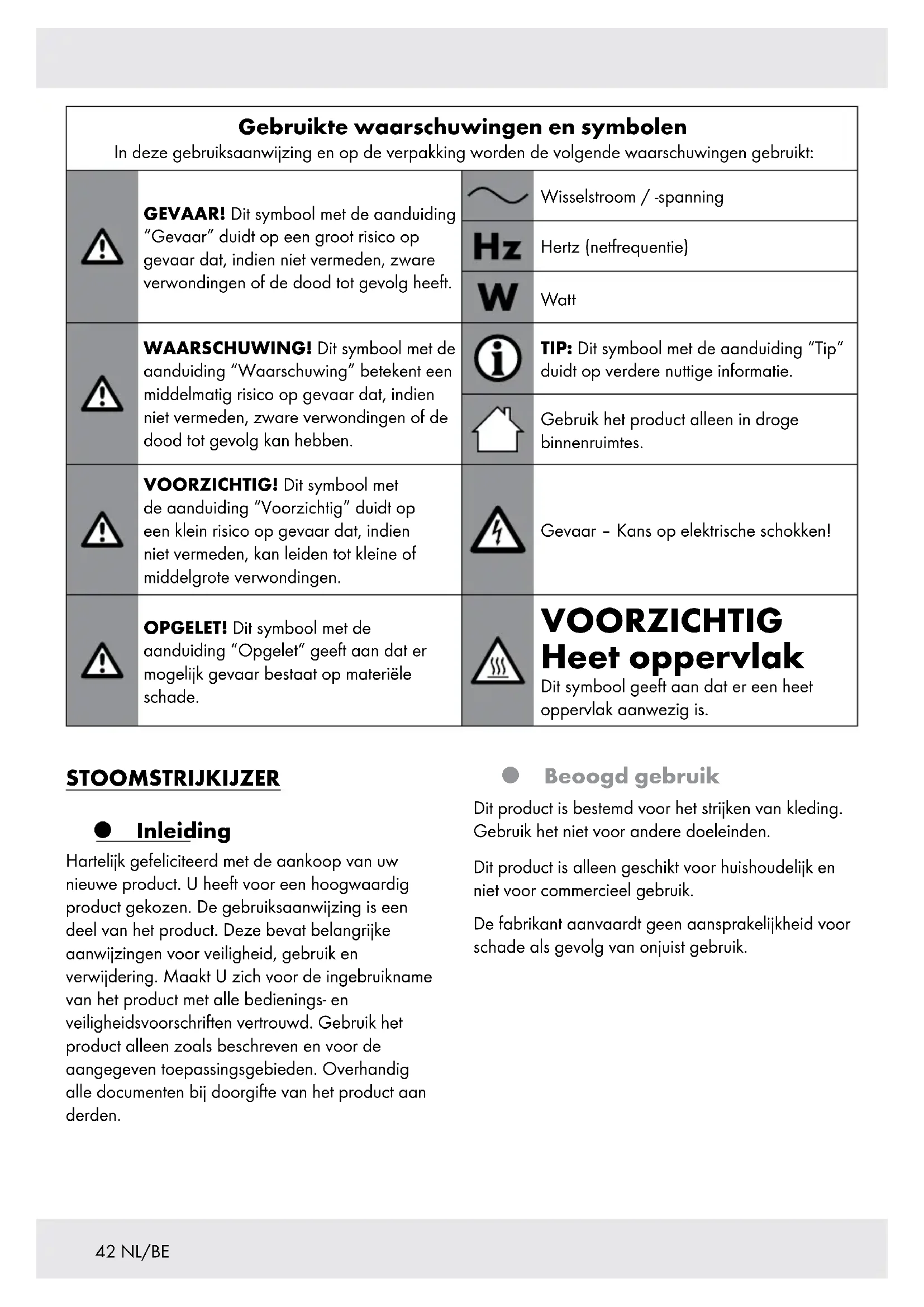 PEUTERS EN KINDEREN! Laat kinderen nooit zonder toezicht achter met het verpakkingsmateriaal. Het verpakkingsmateriaal vormt een verstikkingsgevaar. Kinderen onderschatten vaak de daaraan verbonden gevaren. Houd kinderen altijd uit de buurt van verpakkingsmateriaal.44 NL/BE mGEVAAR! Kans op elektrische schokken! Probeer het product niet zelf te repareren. In geval van een storing mogen reparaties alleen door gekwalificeerde vaklieden worden uitgevoerd. mWAARSCHUWING! Kans op elektrische schokken! Dompel de elektrische onderdelen van het product nooit onder in water of andere vloeistoffen. Houd het product nooit onder stromend water. mVOORZICHTIG! Kans op elektrische schokken! Gebruik het product nooit als het is beschadigd. Koppel het product los van het elektriciteitsnet en neem contact op met uw verkoper als het beschadigd is. mWAARSCHUWING! Gevaar voor verwondingen! Zet het product uit en koppel het los van het elektriciteitsnet voordat u het product schoonmaakt en zorg ervoor dat het op dat moment niet gebruikt wordt. mWAARSCHUWING! Onjuist gebruik kan tot verwondingen leiden. Gebruik het product uitsluitend zoals aangegeven in de handleiding. Probeer niet het product op een of andere wijze te veranderen. Dit product mag door kinderen vanaf 8jaar alsmede door personen met verminderde fysieke, sensorische of geestelijke vermogens of gebrek aan ervaring en kennis alleen gebruikt worden als ze onder supervisie staan of geïnstrueerd zijn wat betreft veilig gebruik van het product en begrepen hebben welke gevaren uit dat gebruik voortvloeien.45NL/BE Kinderen mogen niet met het product spelen. Schoonmaken en onderhoud door de gebruiker mogen niet door kinderen worden uitgevoerd, tenzij ze onder toezicht staan. Het product moet onder toezicht blijven zolang het op het elektriciteitsnet is aangesloten. Voordat de watertank met water wordt gevuld, moet de stekker uit het stopcontact worden getrokken. Het product mag uitsluitend op een vlak, stabiel oppervlak gebruikt of neergezet worden. Als het product op zijn voet neergezet wordt, moet die voet geplaatst zijn op een stabiel oppervlak. Het product mag niet gebruikt worden als het is gevallen, zichtbaar is beschadigd of als het lekt. Het product mag alleen gebruikt worden met de meegeleverde voet. Er hoeven door de gebruiker geen maatregelen te worden getroffen, om het product op 50of 60Hz in te stellen. Het product stelt zich automatisch in op 50of 60Hz. Let erop dat de nominale spanning die op het typeplaatje is aangegeven, overeenstemt met de netspanning van uw elektriciteitsnet. Het product gebruikt veel energie. Sluit geen andere apparaten (bijv. verwarmingsapparaten, airconditioners, etc.) aan op dezelfde elektrische groep. Gebruik van verlengsnoeren wordt afgeraden. Als er toch absoluut een verlengsnoer nodig is, moet dit geschikt zijn voor een stroomsterkte van ten minste 10A. Leg het verlengsnoer zo dat niemand erover kan struikelen en dat het ook niet op een andere manier kan worden beschadigd. Gebruik het product niet als het aansluitsnoer of de stekker beschadigd is, als het product niet werkt of op een of andere wijze beschadigd is.46 NL/BE Gebruik het product alleen in droge binnenruimtes. Bedien het product niet met natte handen of als u op een natte ondergrond staat. Raak de stekker nooit met natte handen aan. Bescherm het product tegen hitte. Zet het product niet neer in de buurt van open vlammen of hittebronnen zoals kachels of verwarmingsapparatuur. Controleer de stekker en het aansluitsnoer regelmatig op beschadigingen. Als het elektrische aansluitsnoer van dit product beschadigd is, moet dit, om gevaar te vermijden, door de fabrikant, zijn klantendienst of een vergelijkbaar gekwalificeerd persoon vervangen worden. Bescherm het aansluitsnoer tegen beschadiging. Laat het niet over scherpe randen hangen en plet of buig het niet. Houd het aansluitsnoer uit de buurt van hete oppervlakken en open vuur. Let erop dat niemand er per ongeluk aan kan trekken of erover kan struikelen. Gebruik het product niet langer als de knikbescherming van het aansluitsnoer is beschadigd! Trek de stekker niet aan het aansluitsnoer uit het stopcontact en wikkel het aansluitsnoer niet om het product. Bescherm het product, het aansluitsnoer en de stekker tegen stof, direct zonlicht, waterdruppels en opspattend water. Zet het product altijd uit voordat u de stekker uit het stopcontact trekt.47NL/BE Houd het product minstens 50cm verwijderd van andere objecten (gordijnen, muren, etc.). Berg het product op een droge, koele plaats op, waar het beschermd is tegen vocht en het zich buiten bereik van kinderen bevindt Gevaar voor brandwonden Pak het product als het warm is alleen vast aan de handgreep. Stoom is zeer heet. Houd uw handen nooit voor de stoomopening. Raak de strijkzool nooit aan als het product gebruikt wordt of opgewarmd is (bijv. om de temperatuur te controleren). Houd het strijkijzer en het aansluitsnoer buiten bereik van kinderen die jonger zijn dan 8 aar als het product aangesloten is of als het afkoelt. Voor het eerste gebruik Verwijder het verpakkingsmateriaal. Controleer of alle onderdelen aanwezig zijn. Strijk om eventuele productie- of transportschade te verwijderen voor het eerste gebruik een eenvoudig stuk stof (bijv. een doek of lap). TIP: Bij het eerste gebruik is het mogelijk dat u wat ruikt of dat er wat rook uit het product komt. Dit zijn productie- of transportresten die snel verdwijnen. Ook kunt u zachte geluiden horen zoals knappen of knisperen. Deze verdwijnen ook snel nadat de onderdelen van kunststof zich definitief aan de gebruiksomstandigheden aangepast hebben. Bediening Temperatuur instellen De pijl achter de thermostaat [] geeft de temperatuurinstelling van dat moment aan. Draai de thermostaat [] met de wijzers van de klok mee van de minimuminstelling MIN naar de gewenste temperatuur. De thermostaat [] heeft 3standen. Grofweg zijn dit de aanbevelingen voor de verschillende soorten stof: Symbool Instelling Lage temper