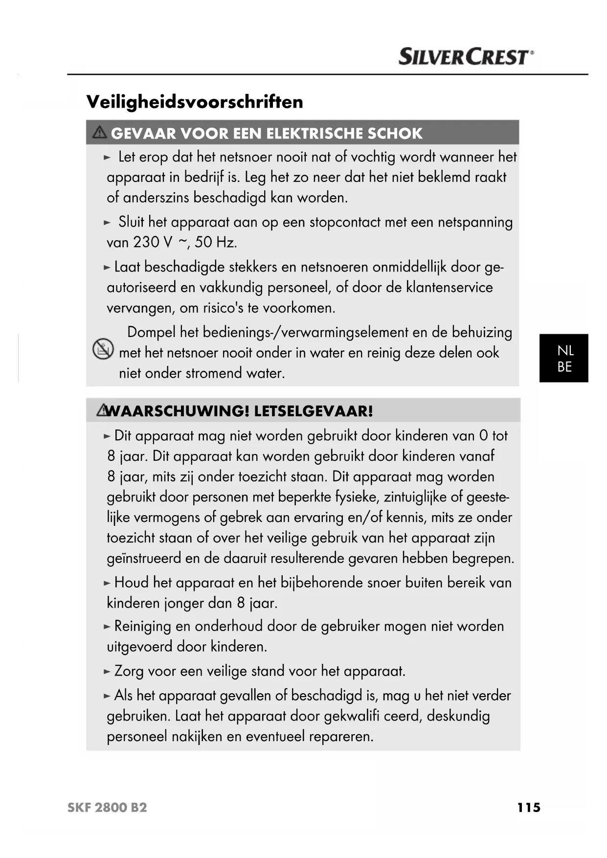 , 50 Hz. ► Laat beschadigde stekkers en netsnoeren onmiddellijk door ge- autoriseerd en vakkundig personeel, of door de klantenservice vervangen, om risico's te voorkomen. Dompel het bedienings-/verwarmingselement en de behuizing met het netsnoer nooit onder in water en reinig deze delen ook niet onder stromend water. WAARSCHUWING! LETSELGEVAAR! ► Dit apparaat mag niet worden gebruikt door kinderen van 0 tot 8 jaar. Dit apparaat kan worden gebruikt door kinderen vanaf 8 jaar, mits zij onder toezicht staan. Dit apparaat mag worden gebruikt door personen met beperkte fysieke, zintuiglijke of geeste- lijke vermogens of gebrek aan ervaring en/of kennis, mits ze onder toezicht staan of over het veilige gebruik van het apparaat zijn geïnstrueerd en de daaruit resulterende gevaren hebben begrepen. ► Houd het apparaat en het bijbehorende snoer buiten bereik van kinderen jonger dan 8 jaar. ► Reiniging en onderhoud door de gebruiker mogen niet worden uitgevoerd door kinderen. ► Zorg voor een veilige stand voor het apparaat. ► Als het apparaat gevallen of beschadigd is, mag u het niet verder gebruiken. Laat het apparaat door gekwalifi ceerd, deskundig personeel nakijken en eventueel repareren. IB_107216_SKF2800B2_FI_SE_DK_BE_NL.indb 115 23.01.15 12:20116 SKF 2800 B2