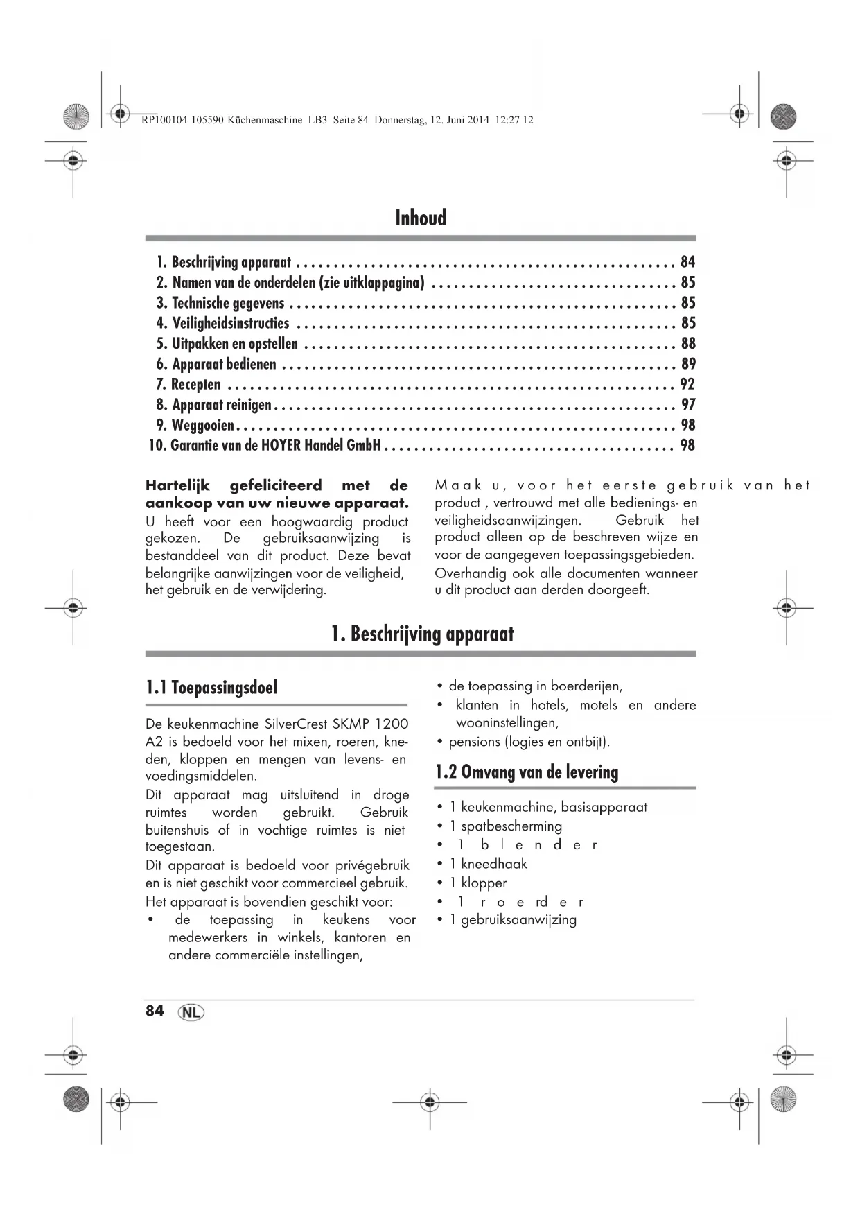 - Een als defect geregistreerd product kunt u vervolgens onder toevoeging van de kassabon en de beschrijving van het defect en wanneer dit is opgetreden franco aan het u meegedeelde serviceadres opsturen. Op www.lidl-service.com kunt u dit handboek en vele andere handboeken, productvideo’s en software downloaden. Service-center Service Nederland Tel.: 0900 0400223 (0,10 EUR/Min.) E-Mail: hoyer@lidl.nl Service België Tel.: 070 270 171 (0,15 EUR/Min.) E-Mail: hoyer@lidl.be IAN: 100104: rood 105590: crème RP100104-105590-Küchenmaschine LB3 Seite 99 Donnerstag, 12. Juni 2014 12:27 12100 Leverancier Let op dat het volgende adres geen service-adres is. Neem eerst contact op met het bovengenoemde service-center. HOYER Handel GmbH Kühnehöfe 5 22761 Hamburg Duitsland RP100104-105590-Küchenmaschine LB3 Seite 100 Donnerstag, 12. Juni 2014 12:27 12SKMP 1200 A2 101 Inhalt 1. Gerätebeschreibung . . . . . . . . . . . . . . . . . . . . . . . . . . . . . . . . . . . . . . . . . . . . . . . . . . . 101