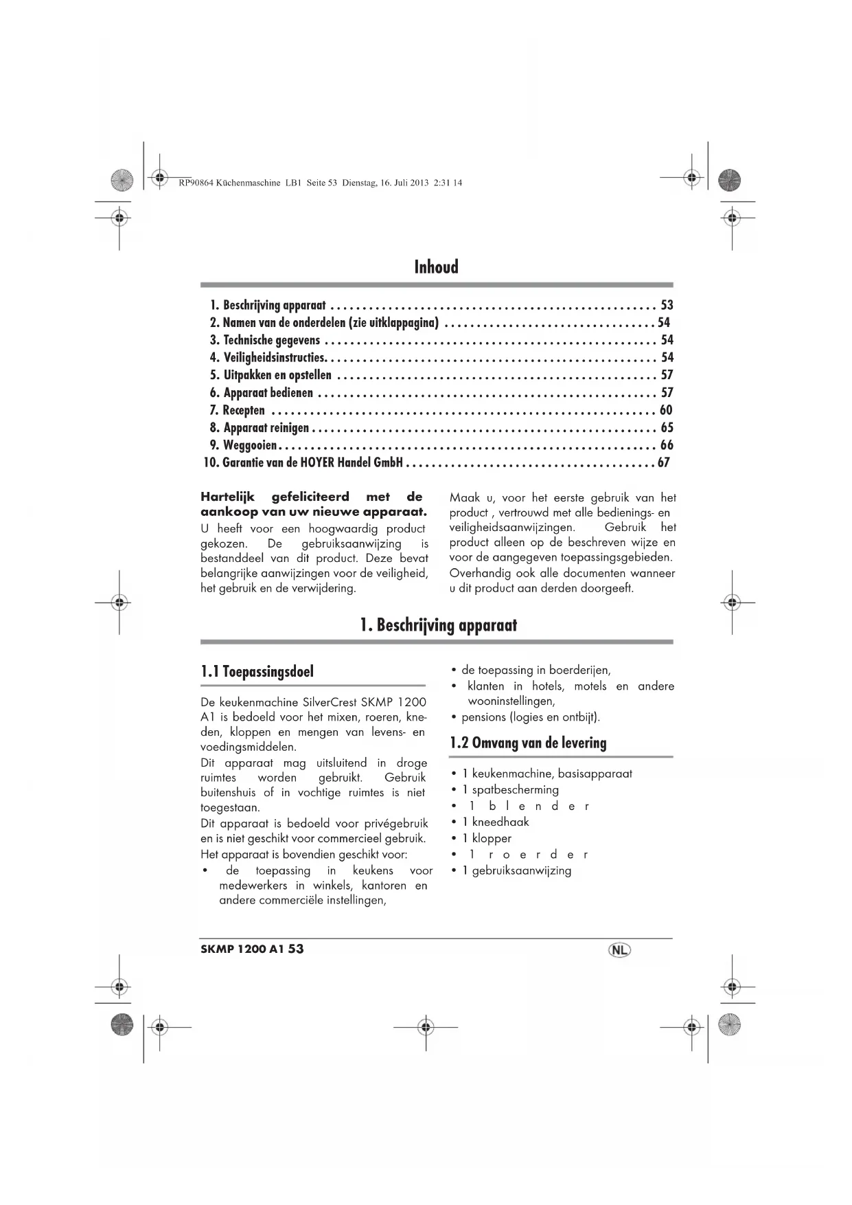 Geachte klant, Op dit apparaat verlenen wij 3 jaar garantie vanaf de koopdatum. In geval van defecten aan dit product heeft u wettelijke rechten tegenover de verkoper van het product. Deze wettelijke rechten worden door onze hierna beschreven garantie niet beperkt. Garantievoorwaarden De garantieperiode begint vanaf de koopdatum. Bewaar de originele kassabon op een veilige plaats. Deze bon heeft u nodig om de koopdatum aan te tonen. Indien binnen drie jaar vanaf de koopdatum van het product een materiaal- of fabricagefout optreedt, wordt het product door ons (naar onze keuze) of kosteloos voor u gerepareerd of vervangen. De voorwaarde voor deze garantieprestatie is dat binnen de periode van drie jaar het defecte apparaat en de koopkwitantie (kassabon) wordt ingeleverd en schriftelijk kort wordt beschreven waaruit het gebrek bestaat en wanneer dit is opgetreden. Wanneer het defect door onze garantie wordt gedekt, ontvangt u het gerepareerde of een nieuw product terug. Door de reparatie of vervanging van het product begint geen nieuwe garantieperiode. Garantieperiode en wettelijke aanspraak op garantie De garantieperiode wordt door de garantie niet verlengd. Dit geldt ook voor vervangen en gerepareerde onderdelen. Eventueel al bij de koop aanwezige schade en gebreken moeten direct na het uitpakken worden gemeld. Aan reparaties die na afloop van de garantieperiode noodzakelijk worden, zijn kosten verbonden. Omvang van de garantie Het apparaat werd volgens strenge kwaliteitsrichtlijnen geproduceerd en vóór de levering zorgvuldig gecontroleerd. De garantie geldt voor materiaal- of fabricagefouten. Deze garantie wordt niet verleend voor productonderdelen die blootgesteld zijn aan normale slijtage en daarom als slijtonderdelen worden beschouwd of voor beschadigingen aan breekbare onderdelen, bijvoorbeeld schakelaars, accu’s en onderdelen die van glas zijn gemaakt. Deze garantie vervalt wanneer het product werd beschadigd, niet vakkundig werd gebruikt of onderhouden. Voor een vakkundig gebruik van het product moeten alle aanwijzingen in de gebruiksaanwijzing nauwkeurig worden opgevolgd. Toepassingsdoelen en handelingen waarvan in de gebruiksaanwijzing wordt afgeraden of waarvoor wordt gewaarschuwd, moeten beslist worden vermeden. Het product is enkel voor particulier gebruik en niet voor commercieel gebruik bedoeld. Bij misbruik of onvakkundige behandeling, gebruik van geweld en bij ingrepen die niet door ons geautoriseerde servicecenter worden uitgevoerd, vervalt de garantie. Afwikkeling in geval van garantie Om een snelle bewerking van uw aangelegenheid te garanderen, dient u de volgende aanwijzingen op te volgen: RP90864 Küchenmaschine LB1 Seite 67 Dienstag, 16. Juli 2013 2:31 1468