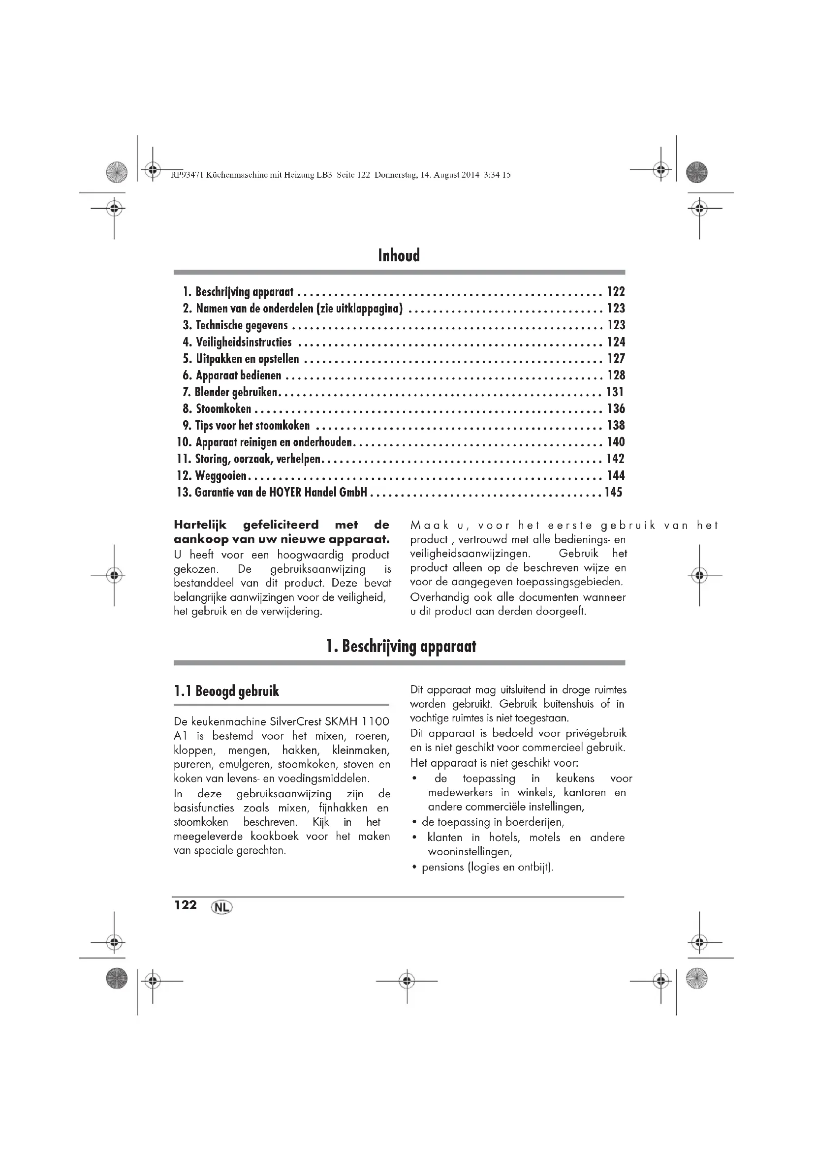 - Gebruik het apparaat uitsluitend voor de beschreven toepassing (zie „1.1 Beoogd gebruik“ op pagina 122). RP93471 Küchenmaschine mit Heizung LB3 Seite 124 Donnerstag, 14. August 2014 3:34 15SKMH 1100 A1 125