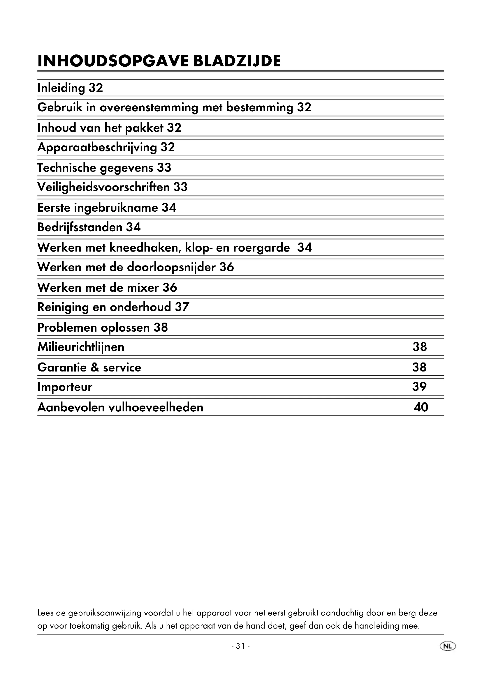 di frullatura: 6 min. 2, 3, 4 Albumi montati a neve 8 albumi 2 3 min. 4 Panna montata (30% di materia grassa) 600 ml ca. 3 min. 4- 31 - INHOUDSOPGAVE BLADZIJDE Inleiding 32 Gebruik in overeenstemming met bestemming 32 Inhoud van het pakket 32 Apparaatbeschrijving 32 Technische gegevens 33 Veiligheidsvoorschriften 33 Eerste ingebruikname 34 Bedrijfsstanden 34 Werken met kneedhaken, klop- en roergarde 34 Werken met de doorloopsnijder 36 Werken met de mixer 36 Reiniging en onderhoud 37 Problemen oplossen 38 Milieurichtlijnen 38 Garantie & service 38 Importeur 39 Aanbevolen vulhoeveelheden 40 Lees de gebruiksaanwijzing voordat u het apparaat voor het eerst gebruikt aandachtig door en berg deze op voor toekomstig gebruik. Als u het apparaat van de hand doet, geef dan ook de handleiding mee.- 32 - KEUKENMACHINE Inleiding Gefeliciteerd met de aankoop van uw nieuwe ap paraat. U hebt hiermee gekozen voor een hoogwaardig product. De bedieningshandleiding maakt deel uit van dit product. Deze bevat belangrijke aanwijzin gen voor veiligheid, gebruik en afvoeren. Maak uzelf voorafgaand aan het gebruik van het product vertrouwd met alle bedienings en veiligheidsvoor schriften. Gebruik het product uitsluitend op de voorgeschreven wijze en voor de aangegeven doe leinden. Geef alle documenten mee als u het pro duct doorgeeft aan een derde. Gebruik in overeenstemming met bestemming Dit apparaat is uitsluitend bestemd voor het verwer ken van levensmiddelen in huishoudelijk gebruikelij ke hoeveelheden. Dit apparaat is uitsluitend bestemd voor het gebruik in privé huishoudens. Gebruik het niet bedrijfsmatig! Het apparaat is alleen bestemd voor privégebruik in gesloten, tegen regen afgeschermde ruimtes. Ge bruik het niet in de openlucht! Het apparaat mag alleen worden gebruikt met de originele accessoires. Inhoud van het pakket Keukenmachine RVS roerkom met deksel Mixer met deksel en trechter Doorloopsnijder met vulhulpstuk Snijschijf (dik en dun) Raspschijf (grof en middelfijn) Maalschijf (fijn) Kneedhaak met deegvanger Klopgarde Roergarde Accessoirehouder Montagemateriaal 2 schroeven (3,5 x 22mm) 2 pluggen (5mm) Gebruiksaanwijzing Opmerking: één van de snijschijven voor de doorloopsnijder is bij de levering al in de door loopsnijder gemonteerd! Apparaatbeschrijving De uitvouwpagina's in de voorste en achterste omslag van deze gebruiksaanwijzing openklappen: Afb. :