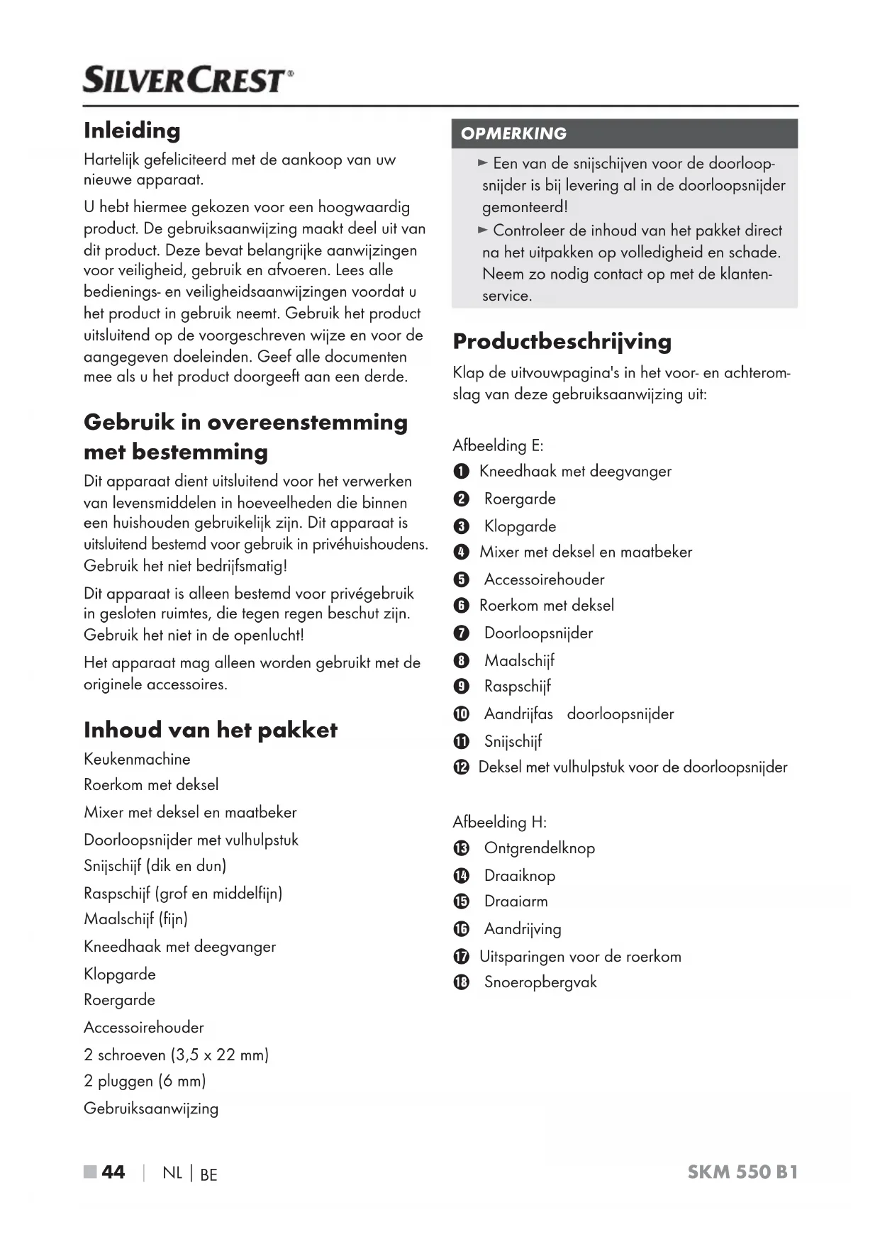 SKM 550 B1 Inleiding Hartelijk gefeliciteerd met de aankoop van uw nieuwe apparaat. U hebt hiermee gekozen voor een hoogwaardig product . De gebr uiksaanwijzing maakt deel uit van dit product. Deze bevat belangrijke aanwijzingen voor veiligheid, gebruik en afvoeren. Lees alle bedienings- en veiligheidsaanwijzingen voordat u het product in gebruik neemt. Gebruik het product uitsluitend op de voorgeschreven wijze en voor de aangegeven doeleinden. Geef alle documenten mee als u het product doorgeeft aan een derde. Gebruik in overeenstemming met bestemming Dit apparaat dient uitsluitend voor het verwerken van levensmiddelen in hoeveelheden die binnen een huishouden gebruikelijk zijn. Dit apparaat is uitsluitend bestemd voor gebruik in privéhuishoudens. Gebruik het niet bedrijfsmatig! Dit apparaat is alleen bestemd voor privégebruik in gesloten ruimtes, die tegen regen beschut zijn. Gebruik het niet in de openlucht! Het apparaat mag alleen worden gebruikt met de originele accessoires. Inhoud van het pakket Keukenmachine Roerkom met deksel Mixer met deksel en maatbeker Doorloopsnijder met vulhulpstuk Snijschijf (dik en dun) Raspschijf (grof en middelfijn) Maalschijf (fijn) Kneedhaak met deegvanger Klopgarde Roergarde Accessoirehouder 2 schroeven (3,5 x 22 mm) 2 pluggen (6 mm) Gebruiksaanwijzing OPMERKING ► Een van de snijschijven voor de doorloop- snijder is bij levering al in de doorloopsnijder gemonteerd! ► Controleer de inhoud van het pakket direct na het uitpakken op volledigheid en schade. Neem zo nodig contact op met de klanten- service. Productbeschrijving Klap de uitvouwpagina's in het voor- en achterom- slag van deze gebruiksaanwijzing uit: Afbeelding E: Kneedhaak met deegvanger Roergarde Klopgarde Mixer met deksel en maatbeker Accessoirehouder Roerkom met deksel Doorloopsnijder Maalschijf Raspschijf Aandrijfas doorloopsnijder - Snijschijf 3 Deksel met vulhulpstuk voor de doorloopsnijder Afbeelding H: ! Ontgrendelknop . Draaiknop 0 Draaiarm 6 Aandrijving 1 Uitsparingen voor de roerkom % SnoeropbergvakNL