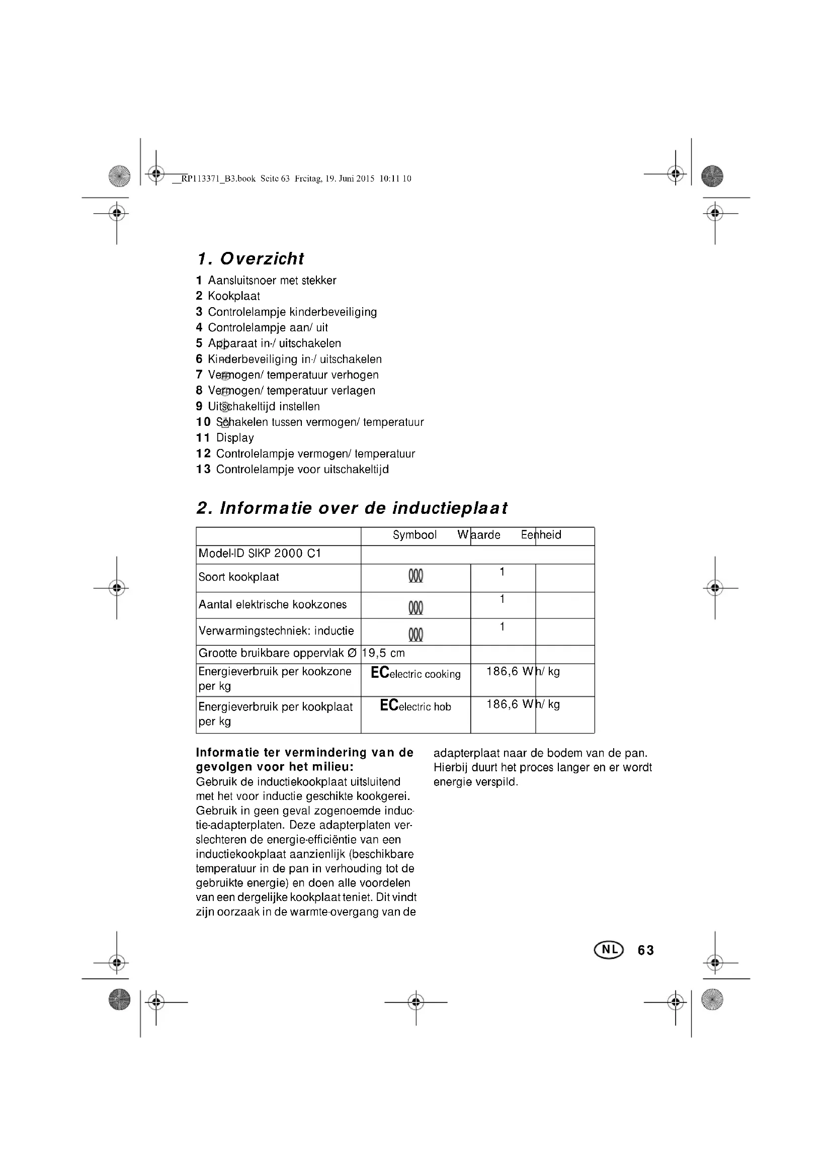 Informatie ter vermindering van de gevolgen voor het milieu: Gebruik de inductiekookplaat uitsluitend met het voor inductie geschikte kookgerei. Gebruik in geen geval zogenoemde induc- tie-adapterplaten. Deze adapterplaten ver- slechteren de energie-efficiëntie van een inductiekookplaat aanzienlijk (beschikbare temperatuur in de pan in verhouding tot de gebruikte energie) en doen alle voordelen van een dergelijke kookplaat teniet. Dit vindt zijn oorzaak in de warmte-overgang van de adapterplaat naar de bodem van de pan. Hierbij duurt het proces langer en er wordt energie verspild. Symbool Waarde Eenheid Model-ID SIKP 2000 C1 Soort kookplaat