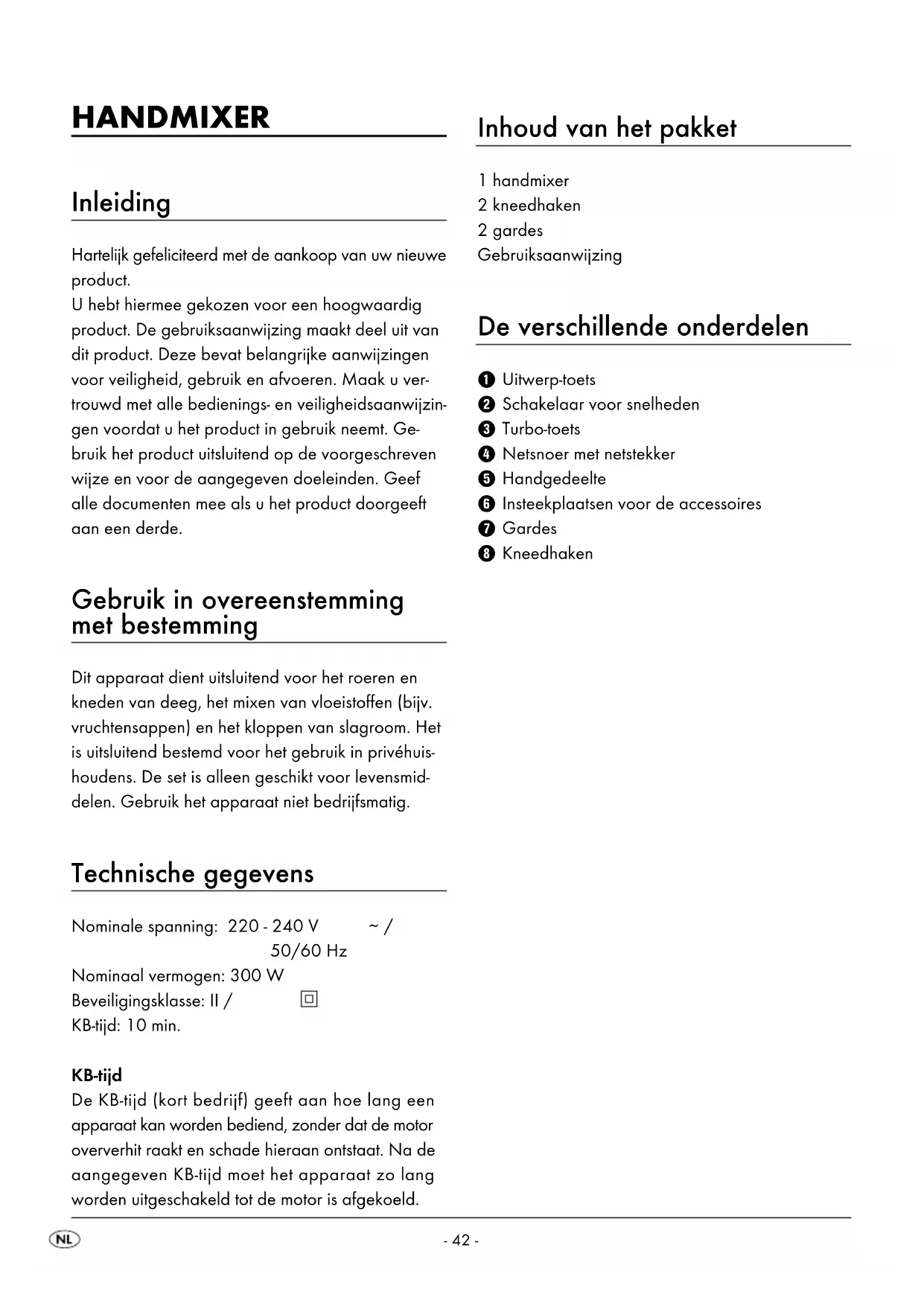50/60 Hz Nominaal vermogen: 300 W Beveiligingsklasse: II / KB-tijd: 10 min. KB-tijd De KB-tijd (kort bedrijf) geeft aan hoe lang een apparaat kan worden bediend, zonder dat de motor oververhit raakt en schade hieraan ontstaat. Na de aangegeven KB-tijd moet het apparaat zo lang worden uitgeschakeld tot de motor is afgekoeld. Inhoud van het pakket 1 handmixer 2 kneedhaken 2 gardes Gebruiksaanwijzing De verschillende onderdelen 1 Uitwerp-toets 2 Schakelaar voor snelheden 3 Turbo-toets 4 Netsnoer met netstekker 5 Handgedeelte 6 Insteekplaatsen voor de accessoires 7 Gardes 8 Kneedhaken- 43 - Belangrijke veiligheidsvoorschriften Gevaar voor een elektrische schok!