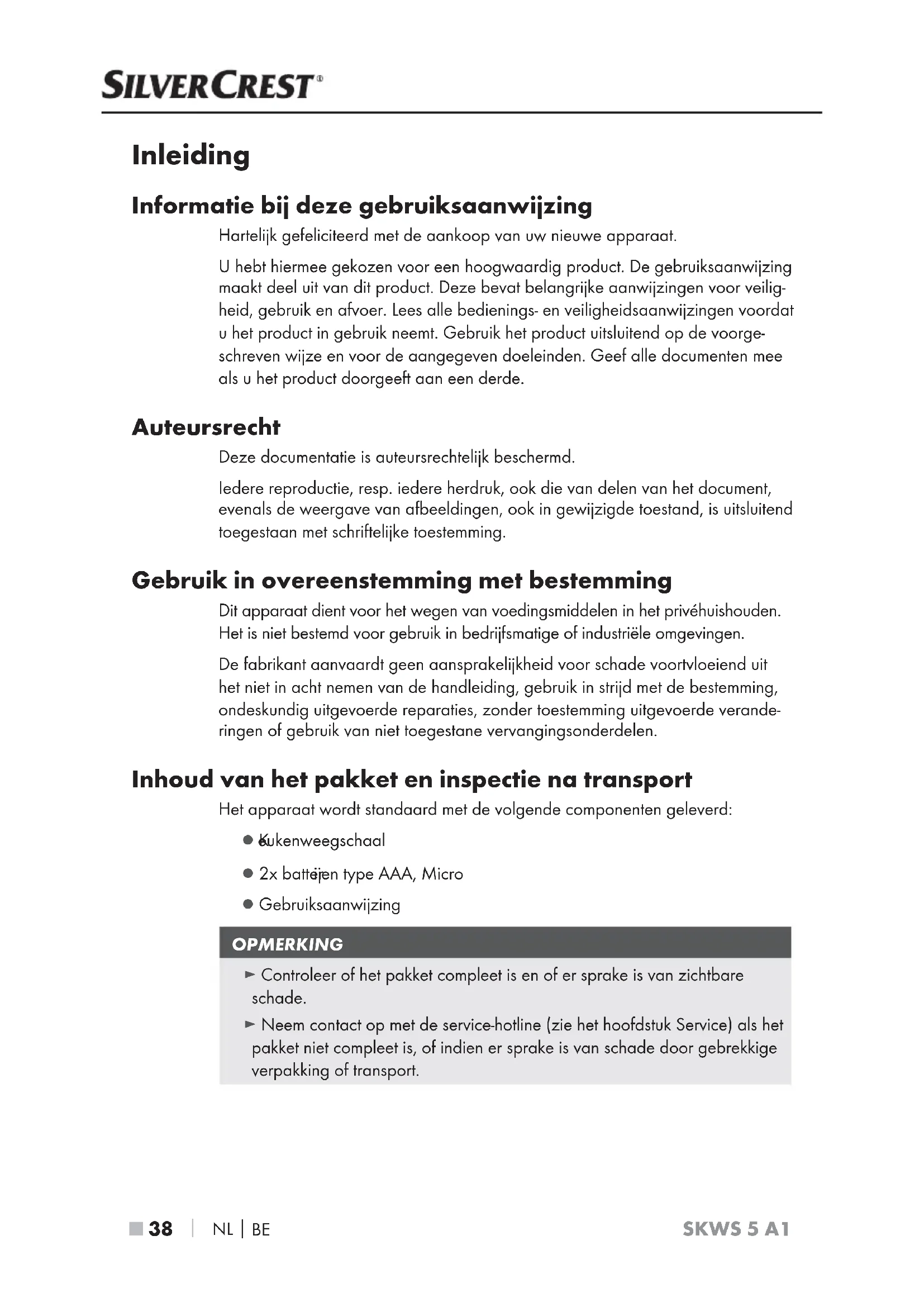 SKWS 5 A1 Inleiding Informatie bij deze gebruiksaanwijzing Hartelijk gefeliciteerd met de aankoop van uw nieuwe apparaat. U hebt hiermee gekozen voor een hoogwaardig product. De gebruiksaanwijzing maakt deel uit van dit product. Deze bevat belangrijke aanwijzingen voor veilig- heid, gebruik en afvoer. Lees alle bedienings- en veiligheidsaanwijzingen voordat u het product in gebruik neemt. Gebruik het product uitsluitend op de voorge- schreven wijze en voor de aangegeven doeleinden. Geef alle documenten mee als u het product doorgeeft aan een derde. Auteursrecht Deze documentatie is auteursrechtelijk beschermd. Iedere reproductie, resp. iedere herdruk, ook die van delen van het document, evenals de weergave van afbeeldingen, ook in gewijzigde toestand, is uitsluitend toegestaan met schriftelijke toestemming. Gebruik in overeenstemming met bestemming Dit apparaat dient voor het wegen van voedingsmiddelen in het privéhuishouden. Het is niet bestemd voor gebruik in bedrijfsmatige of industriële omgevingen. De fabrikant aanvaardt geen aansprakelijkheid voor schade voortvloeiend uit het niet in acht nemen van de handleiding, gebruik in strijd met de bestemming, ondeskundig uitgevoerde reparaties, zonder toestemming uitgevoerde verande- ringen of gebruik van niet toegestane vervangingsonderdelen. Inhoud van het pakket en inspectie na transport Het apparaat wordt standaard met de volgende componenten geleverd: ● K eukenweegschaal ● 2x batter ijen type AAA, Micro ● Gebruiksaanwijzing OPMERKING ► Controleer of het pakket compleet is en of er sprake is van zichtbare schade. ► Neem contact op met de service-hotline (zie het hoofdstuk Service) als het pakket niet compleet is, of indien er sprake is van schade door gebrekkige verpakking of transport.NL