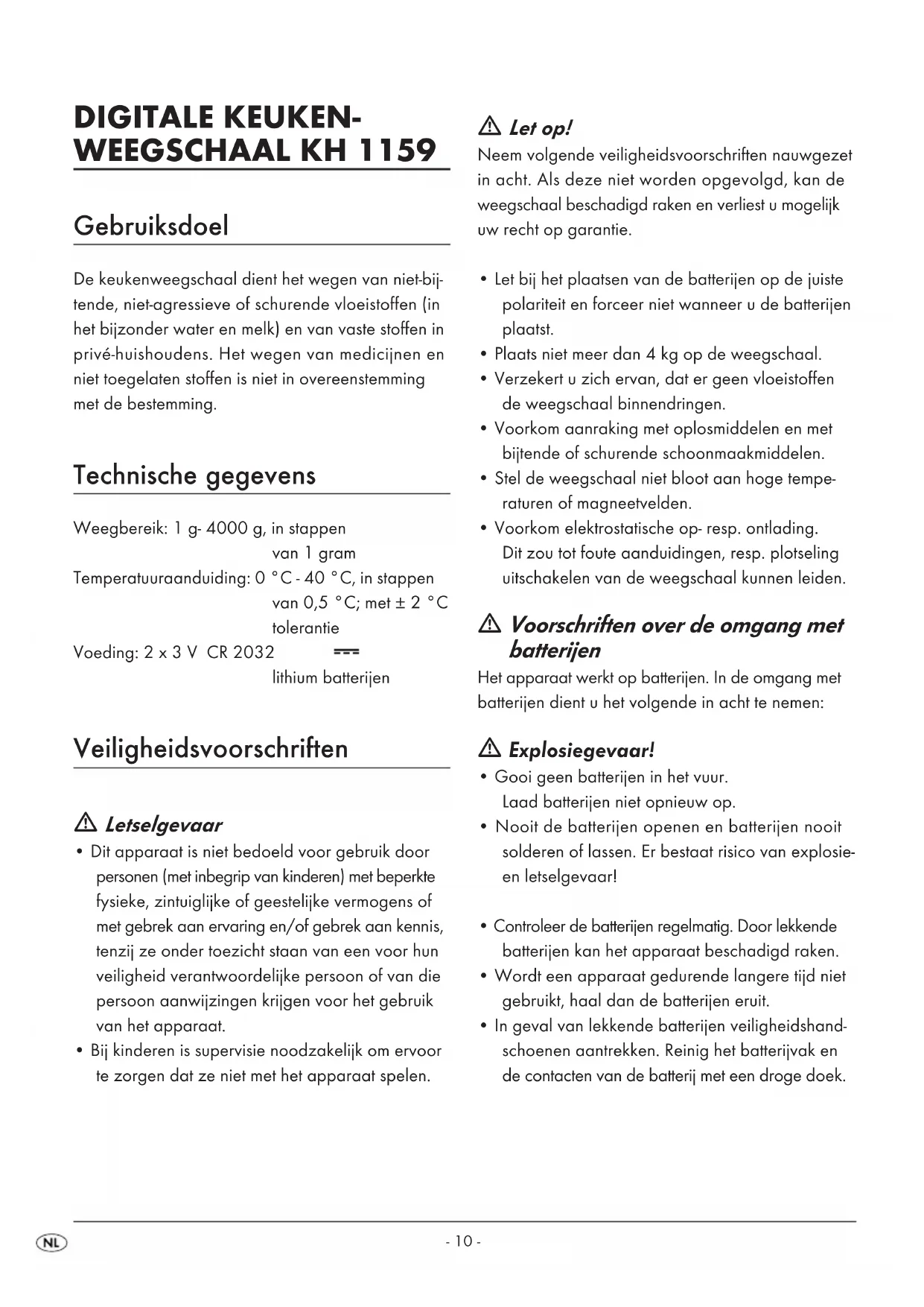- Gooi geen batterijen in het vuur. Laad batterijen niet opnieuw op.• Nooit de batterijen openen en batterijen nooitsolderen of lassen. Er bestaat risico van explosie-en letselgevaar!• Controleer de batterijen regelmatig. Door lekkendebatterijen kan het apparaat beschadigd raken.• Wordt een apparaat gedurende langere tijd nietgebruikt, haal dan de batterijen eruit.• In geval van lekkende batterijen veiligheidshand-schoenen aantrekken. Reinig het batterijvak ende contacten van de batterij met een droge doek.IB_KH1159_E30067_LB2 14.04.2009 14:05 Uhr Seite 10- 11 -