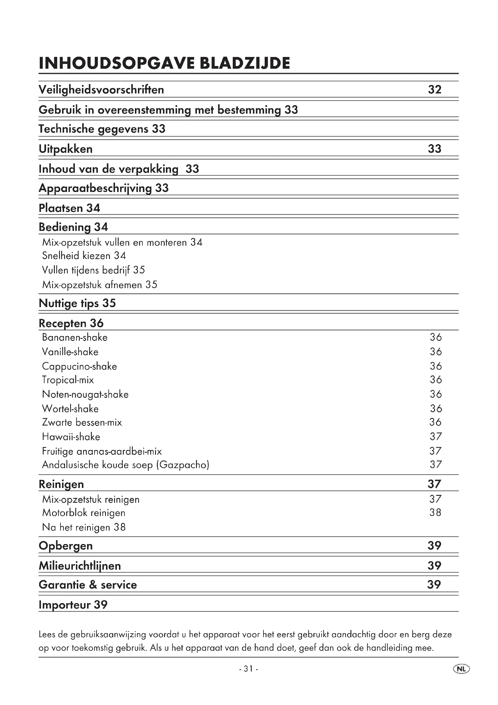 Conservare il frullatore in un luogo fresco e asciutto. Smaltimento Non gettare per alcun motivo l’appa- recchio insieme ai normali rifiuti domestici. Questo prodotto sottostà alla direttiva europea 2002/96/EC. Smaltire l’apparecchio presso un’azienda auto- rizzata o presso l’ente comunale di smaltimento. Rispettare le norme attualmente in vigore. In caso di dubbi, contattare l’azienda di smaltimento competente. Smaltire tutti i materiali d’imballo in confor- mità alle norme per il rispetto dell’ambiente. IB_66711_SSM550A1_LB1 28.04.2011 13:29 Uhr Seite 29loading-circle-1- 31 - INHOUDSOPGAVE BLADZIJDE Veiligheidsvoorschriften 32 Gebruik in overeenstemming met bestemming 33 Technische gegevens 33 Uitpakken 33 Inhoud van de verpakking 33 Apparaatbeschrijving 33 Plaatsen 34 Bediening 34 Mix-opzetstuk vullen en monteren 34 Snelheid kiezen 34 Vullen tijdens bedrijf 35 Mix-opzetstuk afnemen 35 Nuttige tips 35 Recepten 36 Bananen-shake 36 Vanille-shake 36 Cappucino-shake 36 Tropical-mix 36 Noten-nougat-shake 36 Wortel-shake 36 Zwarte bessen-mix 36 Hawaii-shake 37 Fruitige ananas-aardbei-mix 37 Andalusische koude soep (Gazpacho) 37 Reinigen 37 Mix-opzetstuk reinigen 37 Motorblok reinigen 38 Na het reinigen 38 Opbergen 39 Milieurichtlijnen 39 Garantie & service 39 Importeur 39 Lees de gebruiksaanwijzing voordat u het apparaat voor het eerst gebruikt aandachtig door en berg deze op voor toekomstig gebruik. Als u het apparaat van de hand doet, geef dan ook de handleiding mee. IB_66711_SSM550A1_LB1 28.04.2011 13:29 Uhr Seite 31- 32 - BLENDER Veiligheidsvoorschriften Om levensgevaar door een elek- trische schok te vermijden: