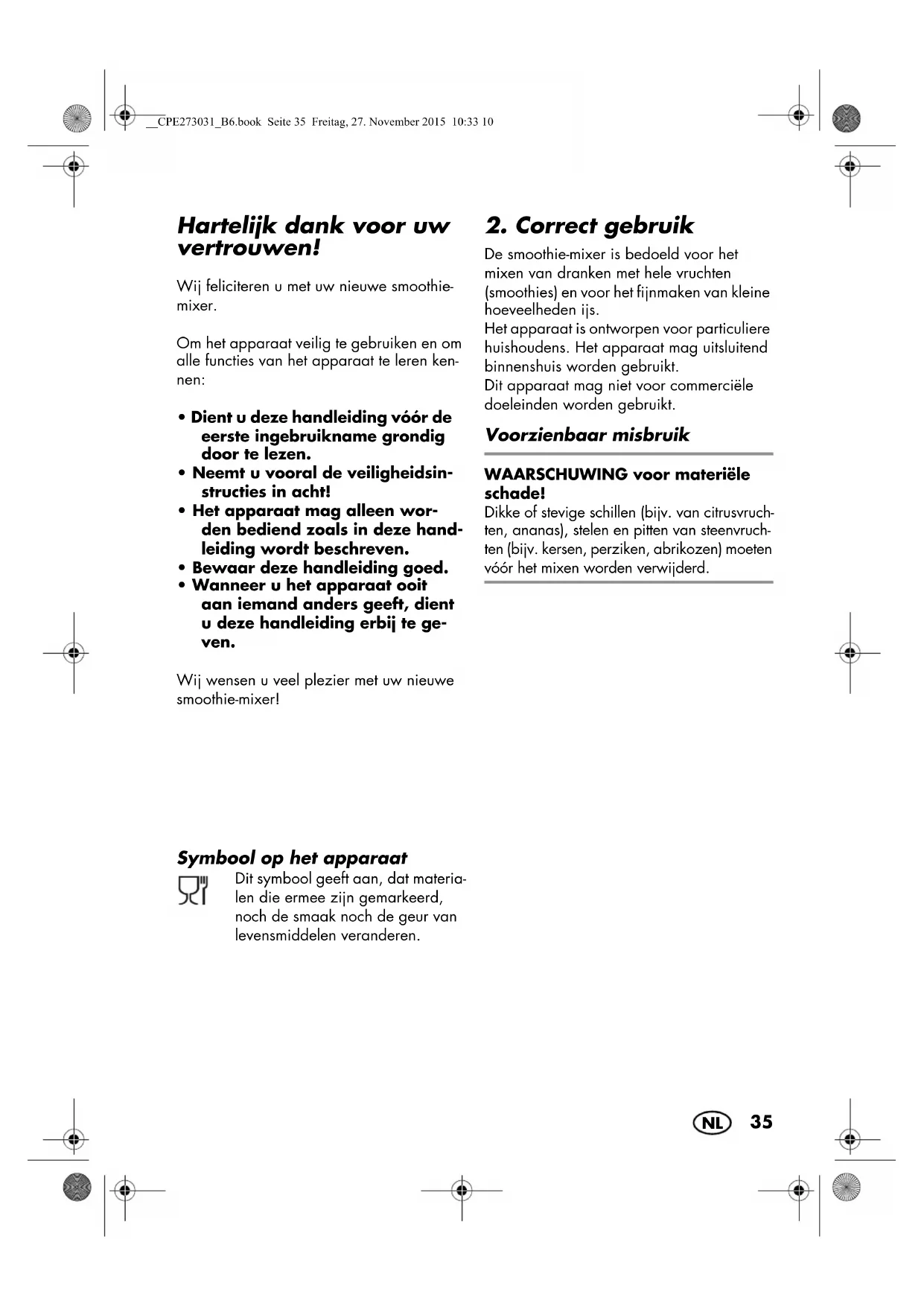 - Wanneer u het apparaat ooit aan iemand anders geeft, dient u deze handleiding erbij te ge- ven. Wij wensen u veel plezier met uw nieuwe smoothie-mixer! Symbool op het apparaat Dit symbool geeft aan, dat materia- len die ermee zijn gemarkeerd, noch de smaak noch de geur van levensmiddelen veranderen.