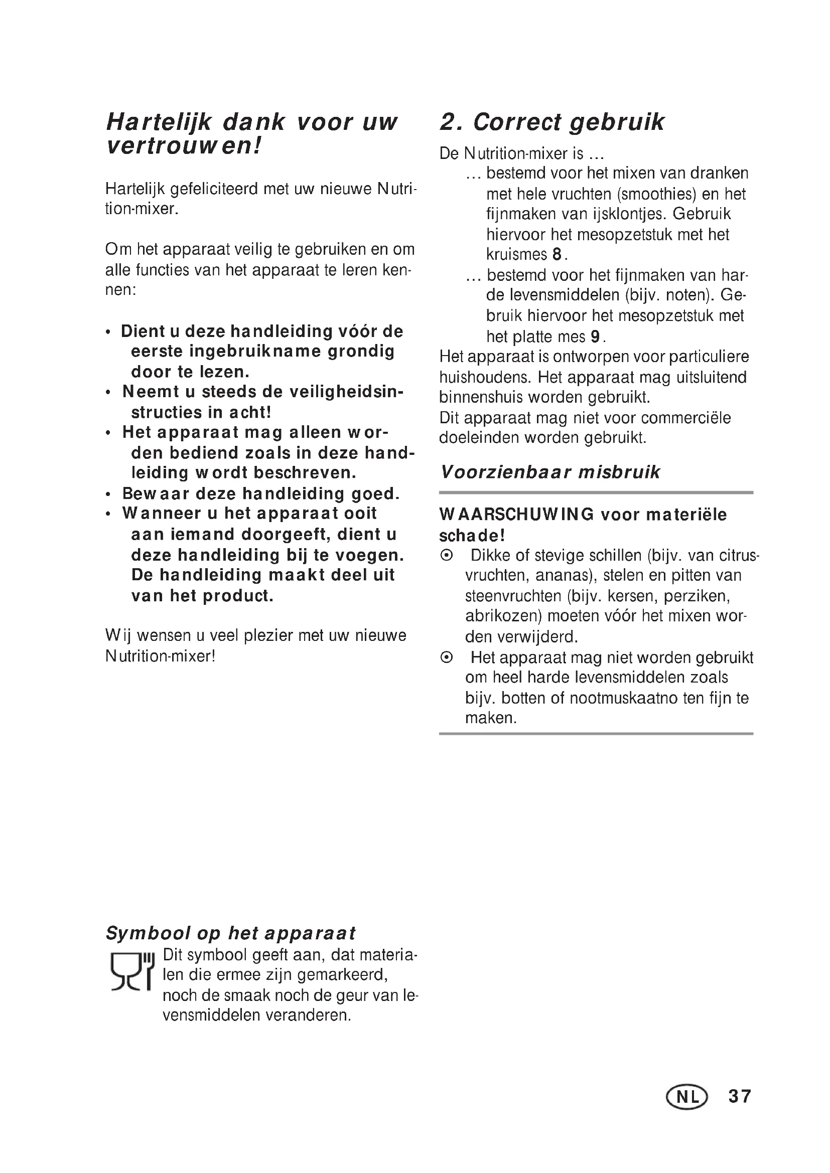 - Wanneer u het apparaat ooit aan iemand doorgeeft, dient u deze handleiding bij te voegen. De handleiding maakt deel uit van het product. Wij wensen u veel plezier met uw nieuwe Nutrition-mixer! Symbool op het apparaat Dit symbool geeft aan, dat materia- len die ermee zijn gemarkeerd, noch de smaak noch de geur van le- vensmiddelen veranderen.
