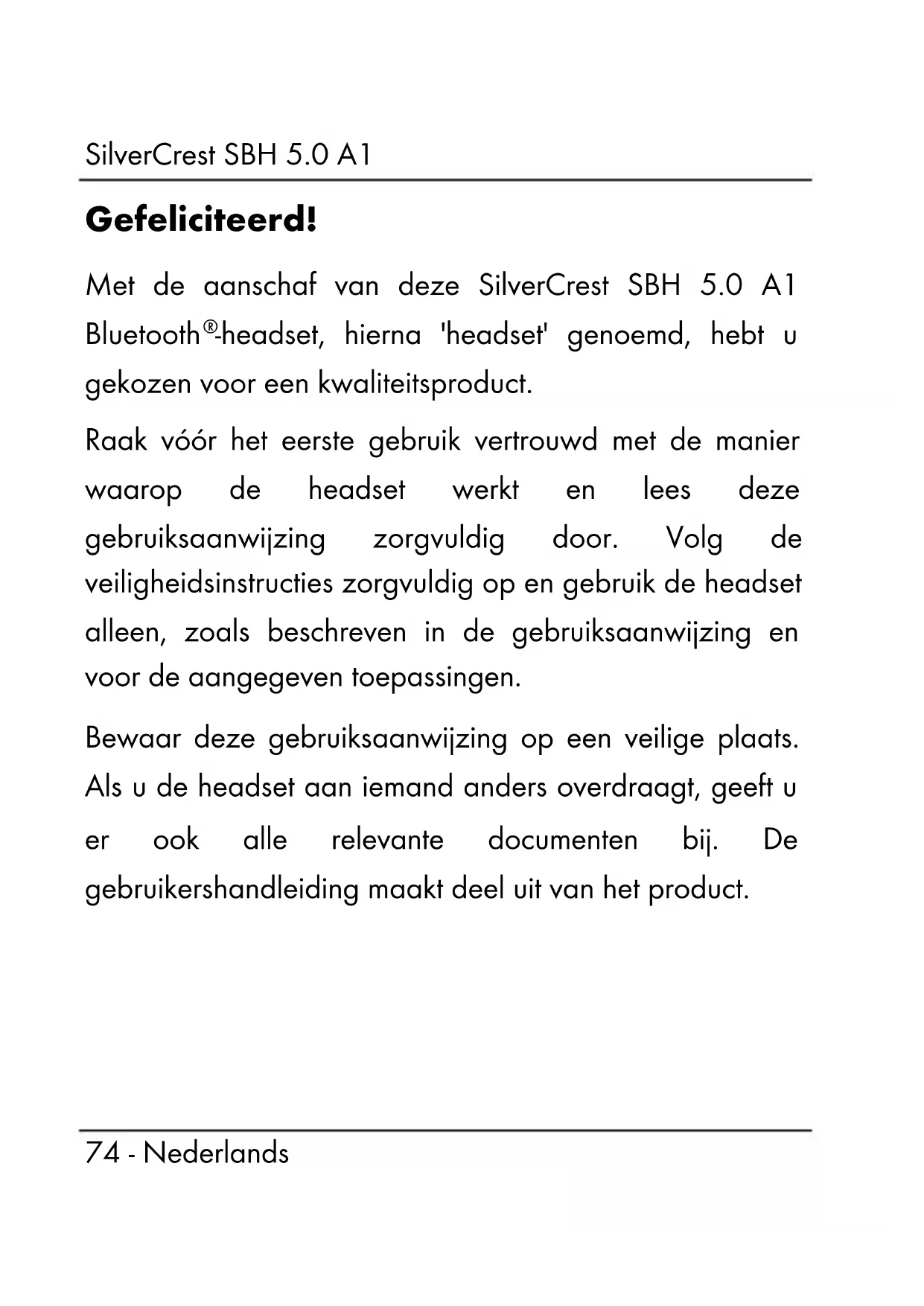 -headset, hierna 'headset' genoemd, hebt u gekozen voor een kwaliteitsproduct. Raak vóór het eerste gebruik vertrouwd met de manier waarop de headset werkt en lees deze gebruiksaanwijzing zorgvuldig door. Volg de veiligheidsinstructies zorgvuldig op en gebruik de headset alleen, zoals beschreven in de gebruiksaanwijzing en voor de aangegeven toepassingen. Bewaar deze gebruiksaanwijzing op een veilige plaats. Als u de headset aan iemand anders overdraagt, geeft u er ook alle relevante documenten bij. De gebruikershandleiding maakt deel uit van het product.SilverCrest SBH 5.0 A1 Nederlands - 75