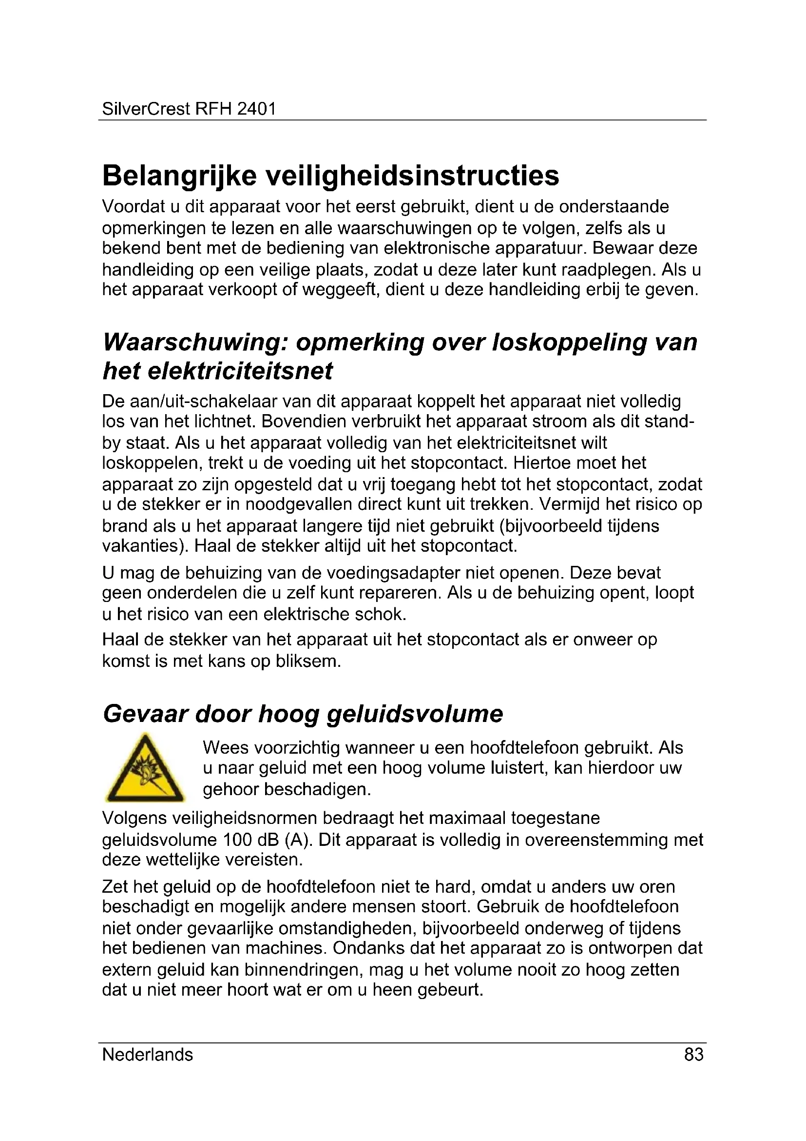 - Si è superata la distanza massima dal trasmettitore. Avvicinarsi al trasmettitore.SilverCrest RFH 2401 Italiano 79 Specifiche Tecniche Modello Cuffie stereo wireless con radio FM RFH2401 Risposta in frequenza 22 - 20.000 Hz Rapporto segnale- rumore 50 dB Separazione dei canali R/L (Sin/Dx) 30 dB Frequenza portante 2,40 – 2,48 GHz (WLAN-Hopping method) Modulazione digitale Potenza di trasmissione massima 9,9 dBm Banda di sintonizzazione radio FM Radio da 87,5 MHz a 108 MHz Intervallo di trasmissione 50 m (in condizioni ottimali) Tensione banda larga 327mV Connettori e porte 1 x entrata audio stereo da 3,5 mm (cuffie) 1 x entrata audio stereo da 3,5 mm (trasmettitore) 1 x 5V DC-In Alimentazione Alimentatore a corrente (per trasmettitore) Produttore: Taiytech Tipo EU: TYT70500030EU Tipo UK: TYT70500030UK Entrata: 100-240VCA, 50/60Hz, 0,2A Uscita: 5V 300 mA Batteria ricaricabile/funziona- mento a batterie Batteria ai polimeri di litio ricaricabile, 3,7 V, 900 mAh (incorporata nelle cuffie) Alimentazione alternativa per le cuffie: 2 Batterie AAA R03/LR03 (non accluse alla confezione). Alimentazione alternativa per il trasmettitore: 3 Batterie AAA R03/LR03 (non accluse alla confezione). Peso Cuffie: 260g Trasmettitore: 240g Dimensioni (L x H x P) Trasmettitore: 215 x 134 x 73 mm Trasmettitore/cuffie: 216 x 237 x 134 mmSilverCrest RFH 2401 80 Italiano Non conformità della banda di frequenza del sintonizzatore radio Il design tecnico di questo prodotto consente la ricezione di una banda di frequenza più ampia dei limiti consentiti nei paesi specifici. In alcuni paesi, si potrebbero applicare leggi in materia diverse relativamente alle bande di frequenza assegnate. Attenzione! Non è consentito ricevere, elaborare, passare a terzi o utilizzare qualsiasi informazione ricevuta al di fuori dei limiti assegnati.SilverCrest RFH 2401 Italiano 81 Informazioni sulla garanziaSilverCrest RFH 2401 82 ItalianoSilverCrest RFH 2401 Nederlands 83 Belangrijke veiligheidsinstructies Voordat u dit apparaat voor het eerst gebruikt, dient u de onderstaande opmerkingen te lezen en alle waarschuwingen op te volgen, zelfs als u bekend bent met de bediening van elektronische apparatuur. Bewaar deze handleiding op een veilige plaats, zodat u deze later kunt raadplegen. Als u het apparaat verkoopt of weggeeft, dient u deze handleiding erbij te geven. Waarschuwing: opmerking over loskoppeling van het elektriciteitsnet De aan/uit-schakelaar van dit apparaat koppelt het apparaat niet volledig los van het lichtnet. Bovendien verbruikt het apparaat stroom als dit stand- by staat. Als u het apparaat volledig van het elektriciteitsnet wilt loskoppelen, trekt u de voeding uit het stopcontact. Hiertoe moet het apparaat zo zijn opgesteld dat u vrij toegang hebt tot het stopcontact, zodat u de stekker er in noodgevallen direct kunt uit trekken. Vermijd het risico op brand als u het apparaat langere tijd niet gebruikt (bijvoorbeeld tijdens vakanties). Haal de stekker altijd uit het stopcontact. U mag de behuizing van de voedingsadapter niet openen. Deze bevat geen onderdelen die u zelf kunt repareren. Als u de behuizing opent, loopt u het risico van een elektrische schok. Haal de stekker van het apparaat uit het stopcontact als er onweer op komst is met kans op bliksem. Gevaar door hoog geluidsvolume Wees voorzichtig wanneer u een hoofdtelefoon gebruikt. Als u naar geluid met een hoog volume luistert, kan hierdoor uw gehoor beschadigen. Volgens veiligheidsnormen bedraagt het maximaal toegestane geluidsvolume 100 dB (A). Dit apparaat is volledig in overeenstemming met deze wettelijke vereisten. Zet het geluid op de hoofdtelefoon niet te hard, omdat u anders uw oren beschadigt en mogelijk andere mensen stoort. Gebruik de hoofdtelefoon niet onder gevaarlijke omstandigheden, bijvoorbeeld onderweg of tijdens het bedienen van machines. Ondanks dat het apparaat zo is ontworpen dat extern geluid kan binnendringen, mag u het volume nooit zo hoog zetten dat u niet meer hoort wat er om u heen gebeurt.SilverCrest RFH 2401 84 Nederlands Gebruiksomgeving Plaats het apparaat op een stabiele, vlakke ondergrond en plaats geen voorwerpen op het apparaat. Het apparaat is niet bedoeld voor gebruik in omgevingen met een hoge temperatuur of vochtigheid (zoals een badkamer) en moet stofvrij worden gehouden. Gebruikstemperatuur en -vochtigheid: 5°C tot 40°C, max. 90% relatieve luchtvochtigheid Tref altijd de volgende voorzorgsmaatregelen:
