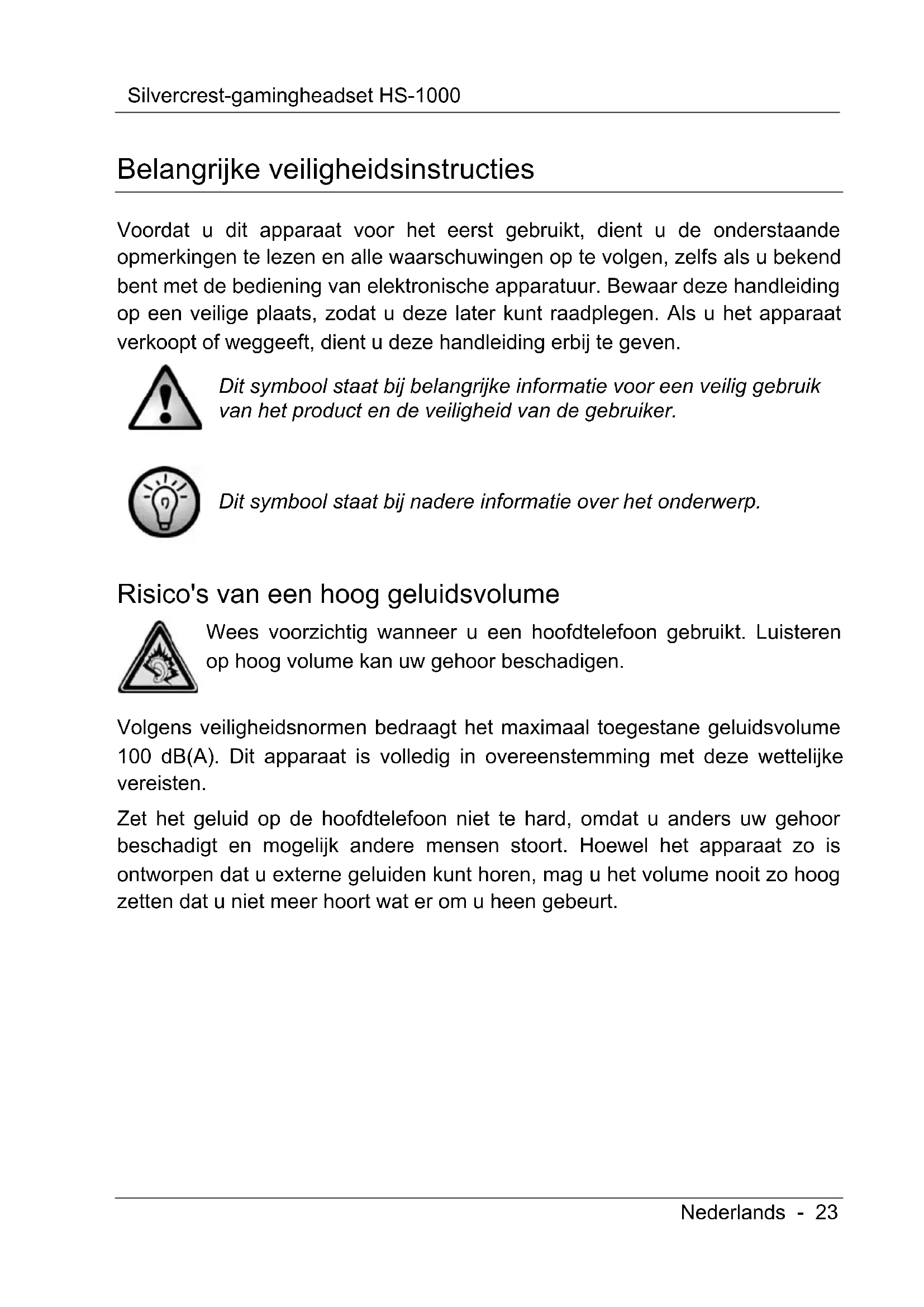 Dit symbool staat bij nadere informatie over het onderwerp. Risico's van een hoog geluidsvolume Wees voorzichtig wanneer u een hoofdtelefoon gebruikt. Luisteren op hoog volume kan uw gehoor beschadigen. Volgens veiligheidsnormen bedraagt het maximaal toegestane geluidsvolume 100 dB(A). Dit apparaat is volledig in overeenstemming met deze wettelijke vereisten. Zet het geluid op de hoofdtelefoon niet te hard, omdat u anders uw gehoor beschadigt en mogelijk andere mensen stoort. Hoewel het apparaat zo is ontworpen dat u externe geluiden kunt horen, mag u het volume nooit zo hoog zetten dat u niet meer hoort wat er om u heen gebeurt.Silvercrest-gamingheadset HS-1000