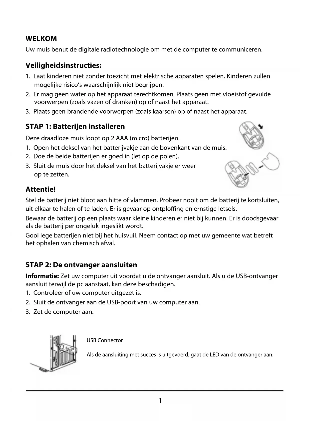 op te zetten. Attentie! Stel de batterij niet bloot aan hitte of vlammen. Probeer nooit om de batterij te kortsluiten, uit elkaar te halen of te laden. Er is gevaar op ontploffing en ernstige letsels. Bewaar de batterij op een plaats waar kleine kinderen er niet bij kunnen. Er is doodsgevaar als de batterij per ongeluk ingeslikt wordt. Gooi lege batterijen niet bij het huisvuil. Neem contact op met uw gemeente wat betreft het ophalen van chemisch afval. STAP 2: De ontvanger aansluiten Informatie: Zet uw computer uit voordat u de ontvanger aansluit. Als u de USB-ontvanger aansluit terwijl de pc aanstaat, kan deze beschadigen.