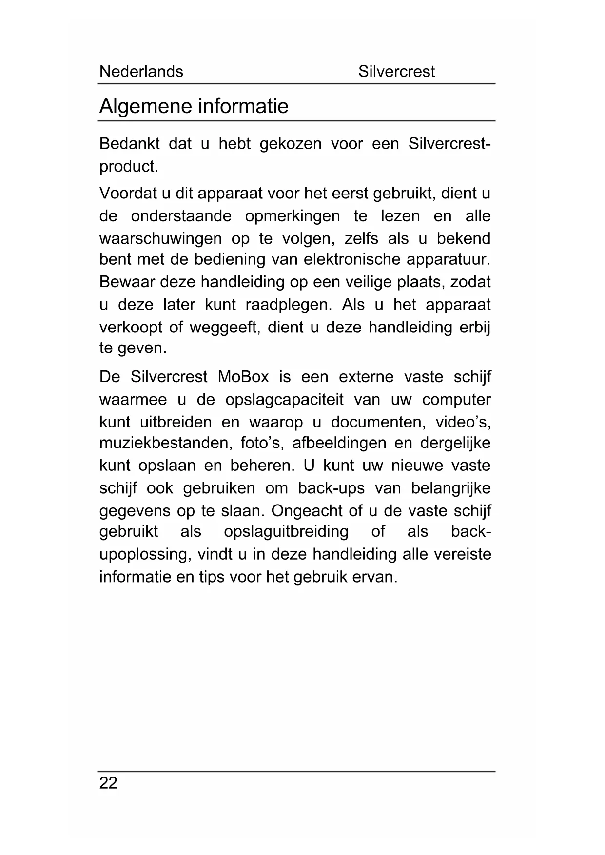 Algemene informatie Bedankt dat u hebt gekozen voor een Silvercrest- product. Voordat u dit apparaat voor het eerst gebruikt, dient u de onderstaande opmerkingen te lezen en alle waarschuwingen op te volgen, zelfs als u bekend bent met de bediening van elektronische apparatuur. Bewaar deze handleiding op een veilige plaats, zodat u deze later kunt raadplegen. Als u het apparaat verkoopt of weggeeft, dient u deze handleiding erbij te geven. De Silvercrest MoBox is een externe vaste schijf waarmee u de opslagcapaciteit van uw computer kunt uitbreiden en waarop u documenten, video’s, muziekbestanden, foto’s, afbeeldingen en dergelijke kunt opslaan en beheren. U kunt uw nieuwe vaste schijf ook gebruiken om back-ups van belangrijke gegevens op te slaan. Ongeacht of u de vaste schijf gebruikt als opslaguitbreiding of als back- upoplossing, vindt u in deze handleiding alle vereiste informatie en tips voor het gebruik ervan.Silvercrest MoBox Nederlands