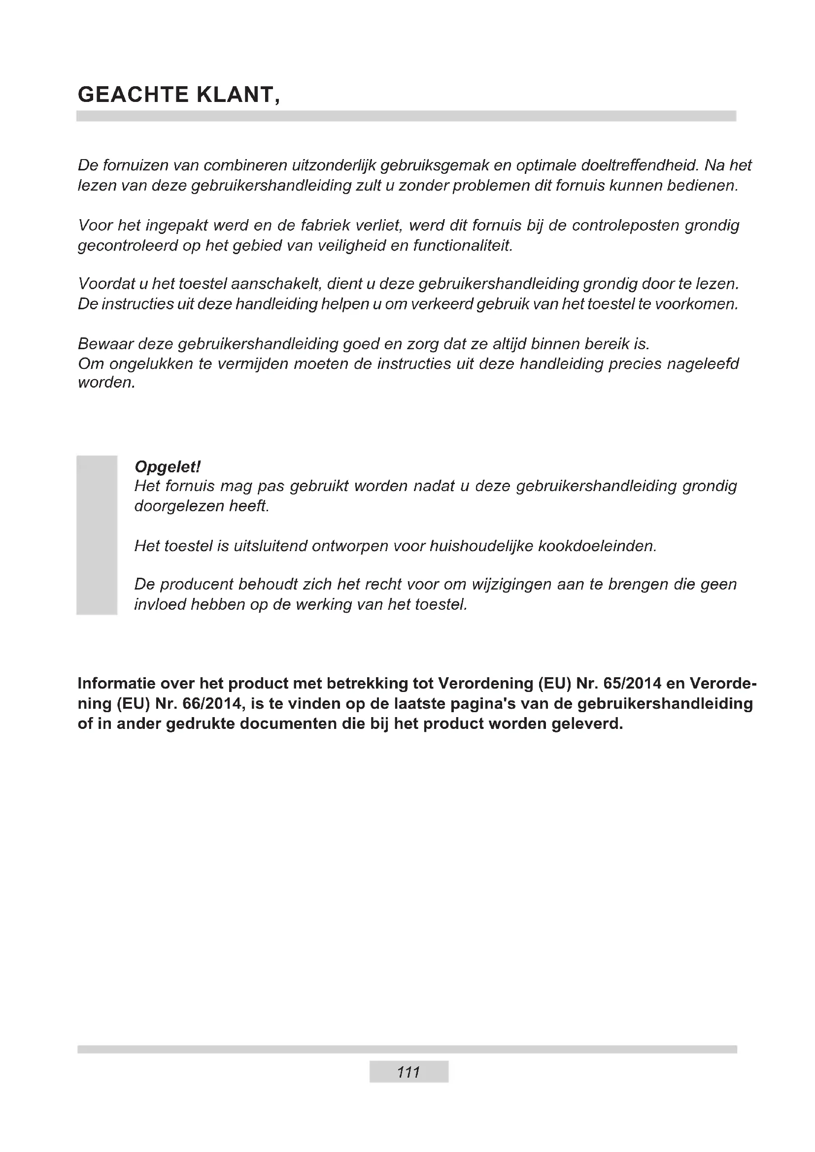 work. The bulb is loose or damaged. Tighten up or replace the blown bulb (see ‘Cleaning and Maintenance’).110 Voltage rating 230/400V~50 Hz Power rating max. 10,3 kW Cooker dimensions H/W/D 59,5 / 59,5 / 57,5 cm TECHNICAL DATA Certicate of compliance CE The Manufacturer hereby declares that this product complies with the general requirements pursuant to the following European Directives: The Low Voltage Directive 2014/35/EC, Electromagnetic Compatibility Directive 2014/30/EC, ErP Directive 2009/125/EC, and therefore the product has been marked with the symbol and the Declaration of Conformity has been issued to the manufacturer and is available to the competent authorities regulating the market. Basic Information: The product meets the requirements of European standards EN 60335- 1; EN60335-2-6. The data on the energy labels of electric ovens is given according to standard EN 60350-1 / IEC 60350-1. These values are dened with a standard workload a with the functions active: bottom and top heaters (conventional heating) and fan assisted heating (forced air heating), if these functions are available. The energy eciency class was assigned depending on the function available in the product in accordance with the priority below: During energy consumption test, remove the telescopic runners (if the product is tted with any). Forced air circulation ECO (ring heater + fan) Forced air circulation ECO (bottom heater + top + roaster + fan) Conventional mode ECO (bottom heater + top)111 GEACHTE KLANT, De fornuizen van combineren uitzonderlijk gebruiksgemak en optimale doeltreendheid. Na het lezen van deze gebruikershandleiding zult u zonder problemen dit fornuis kunnen bedienen. Voor het ingepakt werd en de fabriek verliet, werd dit fornuis bij de controleposten grondig gecontroleerd op het gebied van veiligheid en functionaliteit. Voordat u het toestel aanschakelt, dient u deze gebruikershandleiding grondig door te lezen. De instructies uit deze handleiding helpen u om verkeerd gebruik van het toestel te voorkomen. Bewaar deze gebruikershandleiding goed en zorg dat ze altijd binnen bereik is. Om ongelukken te vermijden moeten de instructies uit deze handleiding precies nageleefd worden. Opgelet! Het fornuis mag pas gebruikt worden nadat u deze gebruikershandleiding grondig doorgelezen heeft. Het toestel is uitsluitend ontworpen voor huishoudelijke kookdoeleinden. De producent behoudt zich het recht voor om wijzigingen aan te brengen die geen invloed hebben op de werking van het toestel. Informatie over het product met betrekking tot Verordening (EU) Nr. 65/2014 en Verorde- ning (EU) Nr. 66/2014, is te vinden op de laatste pagina's van de gebruikershandleiding of in ander gedrukte documenten die bij het product worden geleverd. NL112 VEILIGHEIDSINSTRUCTIES Attentie. Dit apparaat en de bereikbare onderdelen ervan worden tijdens het gebruik heet. Wees bijzonder voorzich- tig bij het aanraken van de verwarmingselementen. Zorg dat kinderen die jonger zijn dan 8 jaar niet bij het apparaat kunnen komen, tenzij ze onder permanent toezicht staan. Dit apparaat mag gebruikt worden door kinderen van 8 jaar en ouder en personen met lichamelijke of geestelijke beperkingen of personen zonder ervaring met of kennis van het apparaat, als dit gebruik plaatsvindt onder toezicht of in overeenstemming met de gebruiksaanwijzing van het apparaat, door personen die verantwoordelijk zijn voor hun veiligheid. Zorg ervoor dat kinderen niet met het apparaat kunnen spelen. Kinderen mogen de kookplaat niet zonder toezicht schoonmaken of onderhoudswerkzaamheden ver- richten. Attentie. Het koken van vetten of olie op de kookplaat zonder toezicht kan erg gevaarlijk zijn en leiden tot brand. Probeer het vuur NOOIT met water te blussen, maar schakel het apparaat uit en bedek de vlammen met een deksel of een niet-brandbare deken. Attentie. Brandgevaar: geen voorwerpen verzamelen op de kookoppervlakte. Attentie. Schakel de stroom uit als de oppervlakte is gebar- sten, om elektrische schokken te voorkomen.113 VEILIGHEIDSINSTRUCTIES Tijdens het gebruik wordt het toestel heet. Wees voorzichtig en raak de hete onderdelen in de oven niet aan. Als dit apparaat gebruikt wordt, kunnen de bereikbare onder- delen heet worden. Laat geen kinderen bij de oven komen. Attentie. Gebruik geen schurende schoonmaakmiddelen of scherpe metalen voorwerpen voor het schoonmaken van het glas van de deur, omdat deze krassen kunnen veroorzaken op het oppervlak. Dit kan leiden tot barsten van het glas. Attentie. Om elektrocutie te vermijden dient u het toestel uit te schakelen vooraleer u het lampje vervangt. Gebruik geen stoomreinigers voor het schoonmaken van het fornuis. Gevaar voor verbranding! Bij het openen van de ovendeur kan hete stoom ontsnappen. Wees voorzichtig met het ope- nen van de deur tijdens of na aoop van het koken. Buig u bij het openen niet over de deur. Vergeet niet dat stoom bij bepaalde temperaturen onzichtbaar kan zijn.114 VEILIGHEIDSINSTRUCTIES ● Wees bijzonder voorzichtig als er kinderen in de buurt van het fornuis zijn, want ze kennen de bedieningsprincipes van het fornuis niet. De hete branders van de gaskookplaat, de ovenkamer, het rooster, de ruit van de deur, en potten en pannen met hete vloeistoen kunnen brandwonden veroorzaken! ● Zorg ervoor dat er geen kleine keukentoestellen of hun kabels in direct contact komen met de hete oven of de kookplaat, want de isolatie van deze toestellen is niet bestand tegen hoge temperaturen. ● Laat het fornuis niet achter zonder toezicht terwijl u kookt. Oliën en vetten kunnen ont- vlammen als gevolg van oververhitting of overkoken. ● Zorg ervoor dat de kookplaat niet vuil wordt of onderloopt door overlopende spijzen. Eventueel vuil moet onmiddellijk verwijderd worden. ● Plaats geen potten of pannen met een natte bodem op de hete kookvelden, want dit kan onomkeerbare wijzigingen aan de plaat veroorzaken (onverwijderbare vlekken). ● Gebruik enkel potten en pannen die volgens de aan