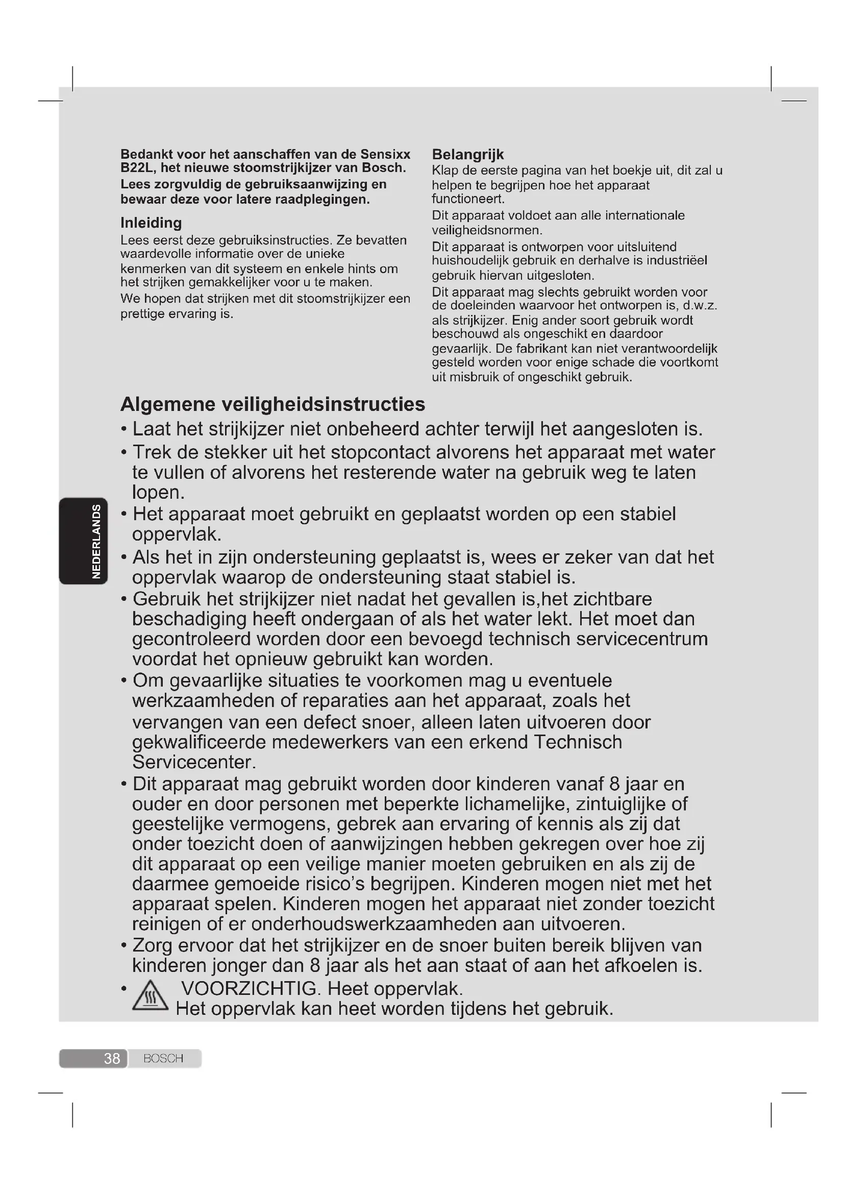 Dit apparaat bereikt hoge temperaturen en produceert stoom gedurende het gebruik. Dit kan brandwonden veroorzaken bij oneigenlijk gebruik. De stoomslang, het basisstation, de metalen plaat aan de onderzijde van de afneembare onderzetter (2) en vooral het strijkijzer zelf kunnen erg heet worden tijdens het gebruik. Dit is normaal. Richt de stoom nooit op mensen of dieren. Voorkom dat het snoer in aanraking komt met de hete zoolplaat. Let erop dat het systeem nog korte tijd kan stoom kan afgeven nadat de stoomhendel wordt losgelaten. Dit is een normale functie.39 B O S C H Klap de eerste pagina van het boekje uit, dit zal u helpen te begrijpen hoe het apparaat functioneert.Dit apparaat voldoet aan alle internationale veiligheidsnormen.Dit apparaat is ontworpen voor uitsluitend huishoudelijk gebruik en derhalve is industriëel gebruik hiervan uitgesloten.Dit apparaat mag slechts gebruikt worden voor de doeleinden waarvoor het ontworpen is, d.w.z. als strijkijzer. Enig ander soort gebruik wordt beschouwd als ongeschikt en daardoor gevaarlijk. De fabrikant kan niet verantwoordelijk gesteld worden voor enige schade die voortkomt uit misbruik of ongeschikt gebruik.
