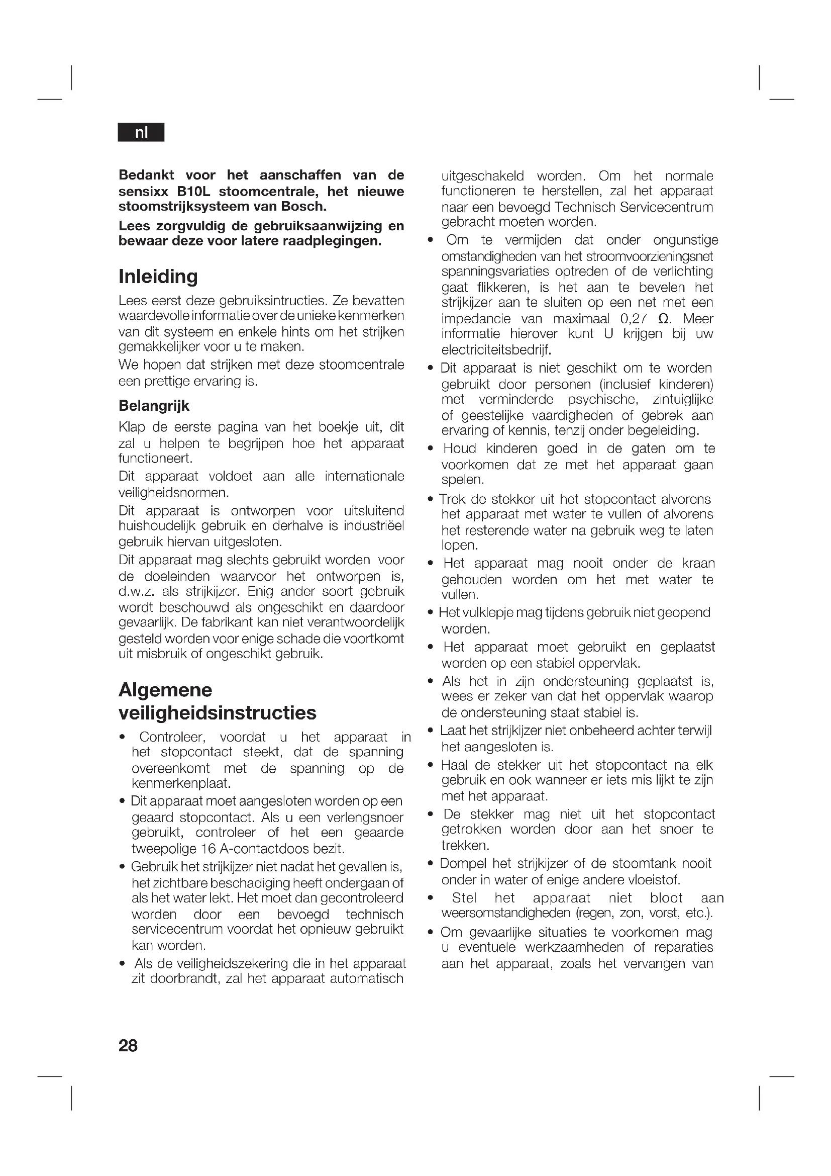 - Pulire la piastra con un panno umido. Perdita di pressione del vapore durante la stiratura Il pulsante di uscita del vapore viene premuto per molto tempo Premere il pulsante del vapore (12) a intervalli. Ciò migliora il risultato della stiratura, dato che il tessuto si asciugherà meglio e rimarrà più morbido Se i suggerimenti sopra menzionati non risolvono il problema, si prega di mettersi in contatto con un servizio di assistenza tecnica autorizzato. Può scaricare il formato digitale di questo manuale nel sito Internet di Bosch.28 Bedankt voor het aanschaffen van de sensixx B10L stoomcentrale, het nieuwe stoomstrijksysteem van Bosch. Lees zorgvuldig de gebruiksaanwijzing en bewaar deze voor latere raadplegingen. Inleiding Lees eerst deze gebruiksintructies. Ze bevatten waardevolle informatie over de unieke kenmerken van dit systeem en enkele hints om het strijken gemakkelijker voor u te maken. We hopen dat strijken met deze stoomcentrale een prettige ervaring is. Belangrijk Klap de eerste pagina van het boekje uit, dit zal u helpen te begrijpen hoe het apparaat functioneert. Dit apparaat voldoet aan alle internationale veiligheidsnormen. Dit apparaat is ontworpen voor uitsluitend huishoudelijk gebruik en derhalve is industriëel gebruik hiervan uitgesloten. Dit apparaat mag slechts gebruikt worden voor de doeleinden waarvoor het ontworpen is, d.w.z. als strijkijzer. Enig ander soort gebruik wordt beschouwd als ongeschikt en daardoor gevaarlijk. De fabrikant kan niet verantwoordelijk gesteld worden voor enige schade die voortkomt uit misbruik of ongeschikt gebruik. Algemene veiligheidsinstructies