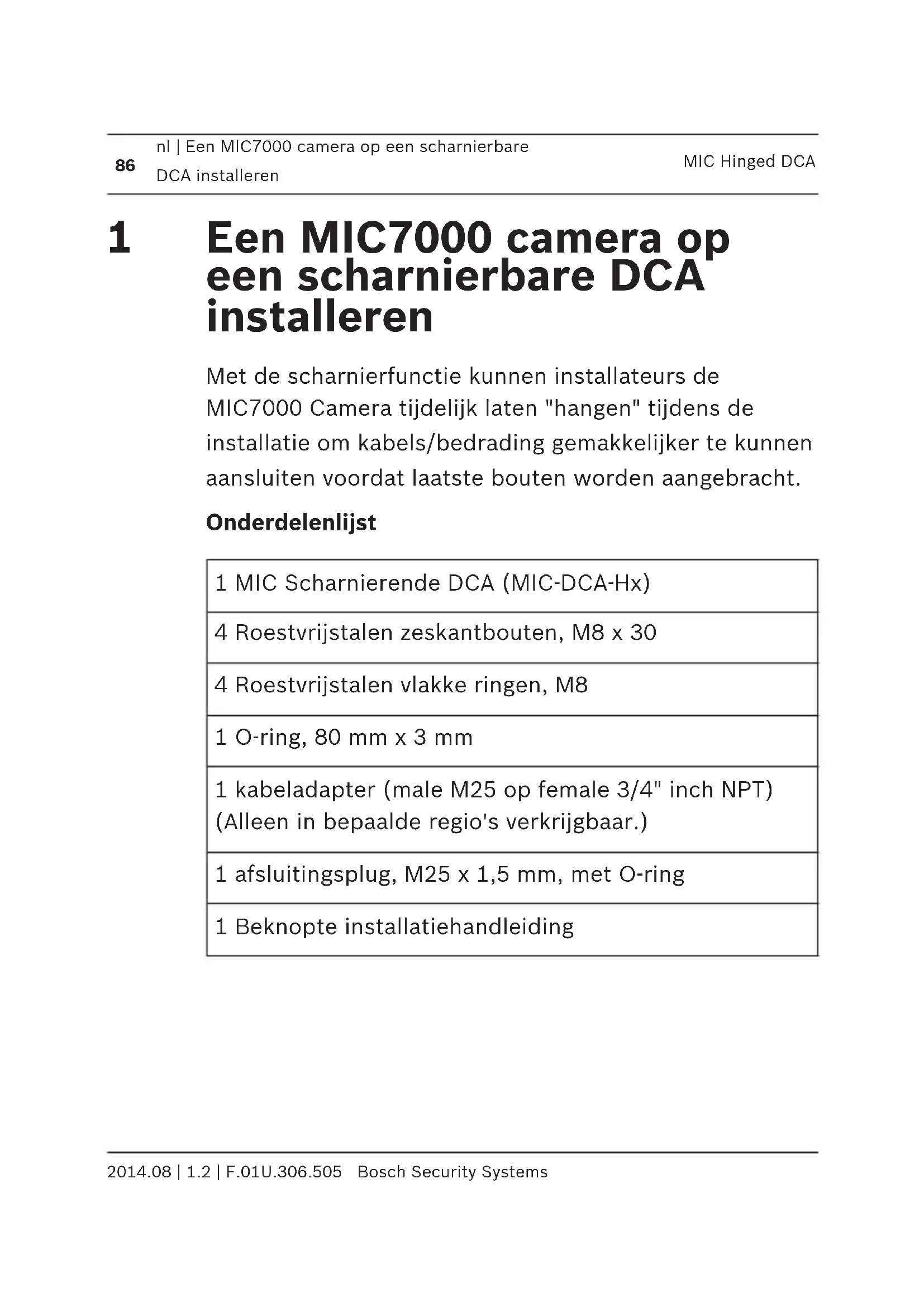 Bosch Security Systems 2014.08 | 1.2 | F.01U.306.505Een MIC7000 camera op een scharnierbare DCA installeren Met de scharnierfunctie kunnen installateurs de MIC7000 Camera tijdelijk laten "hangen" tijdens de installatie om kabels/bedrading gemakkelijker te kunnen aansluiten voordat laatste bouten worden aangebracht. Onderdelenlijst 1 MIC Scharnierende DCA (MIC-DCA-Hx) 4 Roestvrijstalen zeskantbouten, M8 x 30 4 Roestvrijstalen vlakke ringen, M8 1 O-ring, 80 mm x 3 mm 1 kabeladapter (male M25 op female 3/4" inch NPT) (Alleen in bepaalde regio's verkrijgbaar.) 1 afsluitingsplug, M25 x 1,5 mm, met O-ring 1 Beknopte installatiehandleiding