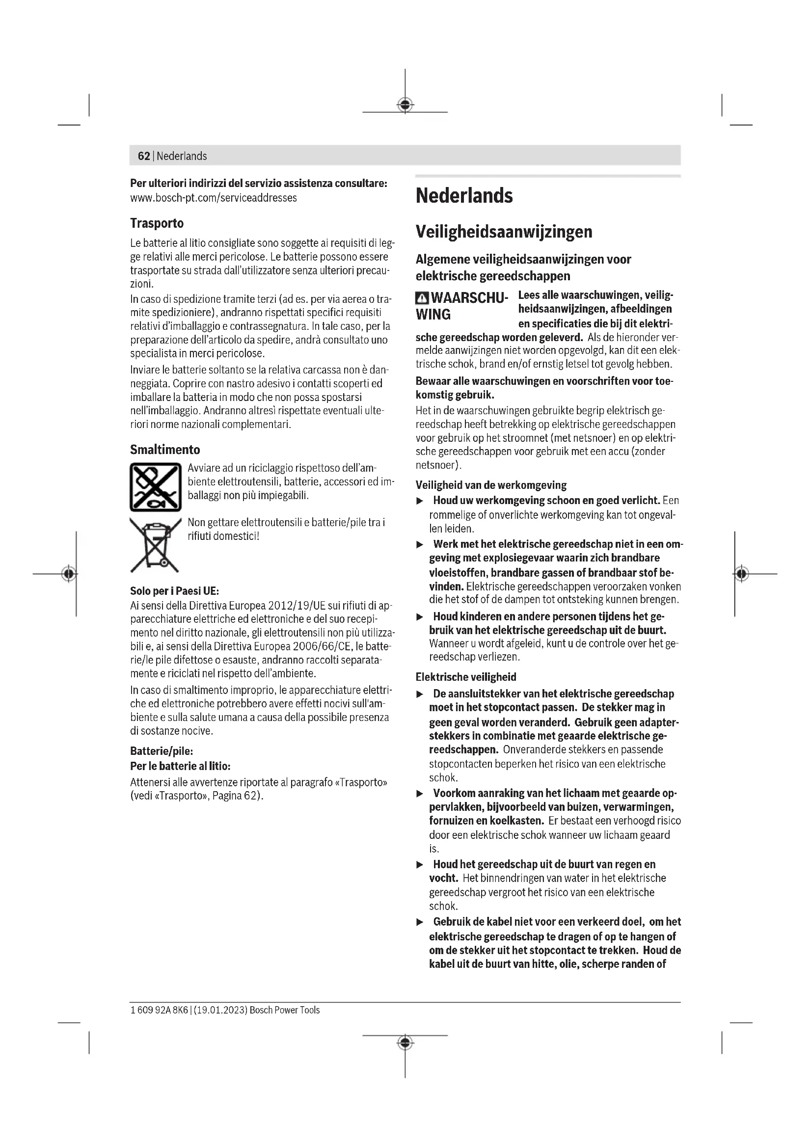 Con l’asta di profondità (20) è possibile determinare la pro- fondità di foratura desiderata X. – Premere il tasto per la regolazione dell’asta di profondità (18) e impostare l’asta di profondità nell’impugnatura supplementare (19). La scanalatura sull’asta di profondità (20) deve essere ri- volta verso il basso. – Spingere l’utensile accessorio SDS-plus fino a battuta nel portautensile SDS-plus (3). in caso contrario, l’utensile SDS-plus potrebbe spostarsi, falsando la regolazione del- la profondità di foratura. – Estrarre l’asta di profondità finché la distanza tra l’estre- mità della punta e l’estremità dell’asta di profondità non corrisponde alla profondità di foratura desiderata X. Frizione di sicurezza contro il sovraccarico u La trasmissione all’alberino filettato si blocca se l’ac- cessorio si inceppa oppure resta bloccato. In conside- razione delle forze che vengono generate, afferrare sempre saldamente l’elettroutensile con entrambe le mani, assumendo una postura stabile. u Nel caso in cui dovesse bloccarsi, spegnere l’elettrou- tensile e rilasciare l’utensile accessorio. In caso di ac- censione con un accessorio di foratura bloccato si svi- luppano alti momenti di reazione. Disinserimento rapido (Kickback Control) La disattivazione rapida (KickBack Control) consente un migliore controllo sull’elettrouten- sile, migliorando così anche la protezione dell’utilizzatore rispetto agli elettroutensili sen- za KickBack Control. In caso di rotazione im- provvisa ed imprevista dell’elettroutensile attorno all’asse della punta, l’elettroutensile si spegnerà automaticamente. – Per rimettere in funzione l’elettroutensile, rilasciare l’in- terruttore di avvio/arresto (13), quindi azionarlo nuova- mente. La disattivazione rapida viene segnalata dal lampeggio della luce di lavoro (17) dell’elettroutensile. Electronic Precision Control (EPC) L’EPC fornisce un valido supporto nella foratura e nei lavori a percussione su materiali sensibili, grazie all’avviamento lento della velocità di lavoro, atto a garantire la massima precisio- ne. Spingere l’interruttore EPC(8) nella posizione desiderata. Posizione per velocità di lavoro massima Posizione per avviamento lento e velocità di la- voro ridotta Sistema di ammortizzazione delle vibrazioni L’apposito sistema integrato riduce le vibrazio- ni. u Non proseguire ad impiegare l’elettroutensile, qualora l’elemento ammortizzante sia danneggiato. Inserimento dei bit cacciavite (vedere figura M) u Applicare l’elettroutensile sul dado/sulla vite esclusi- vamente quando è spento. Gli utensili accessori in rota- zione possono scivolare. Per l’impiego dei bit cacciavite occorre un portabit universa- le (29) con attacco SDS-plus (accessori). – Pulire il codolo dell’attacco e applicarvi un leggero strato di grasso. – Applicare il portabit universale nel portautensile ruotan- dolo fino a farlo bloccare autonomamente. – Controllare il bloccaggio tirando il portabit universale. – Applicare un bit cacciavite nel portabit universale. Usare esclusivamente bit cacciavite che siano adatti alla testa della vite. – Per la rimozione del portabit universale spingere all’indie- tro la bussola di serraggio (5) e prelevare il portabit uni- versale (29) dal portautensile. Manutenzione ed assistenza Manutenzione e pulizia u Prima di qualsiasi intervento sull’elettroutensile (ad es. interventi di manutenzione, sostituzione dell’ac- cessorio ecc.), prelevare la batteria, anche nel caso in cui occorra trasportarlo o conservarlo. In caso di azio- namento accidentale dell’interruttore di avvio/arresto sussiste pericolo di lesioni. u Per poter garantire buone e sicure operazioni di lavo- ro, tenere sempre pulite l’elettroutensile e le fessure di ventilazione. u Se la protezione antipolvere è danneggiata, andrà im- mediatamente sostituita. Si consiglia di affidare l’ope- razione al Servizio Clienti post-vendita. – Pulire l’attacco utensile (3) dopo ogni utilizzo. Servizio di assistenza e consulenza tecnica Il servizio di assistenza risponde alle Vostre domande relati- ve alla riparazione e alla manutenzione del Vostro prodotto nonché concernenti i pezzi di ricambio. Disegni in vista esplosa e informazioni relative ai pezzi di ricambio sono con- sultabili anche sul sito www.bosch-pt.com Il team di consulenza tecnica Bosch sarà lieto di rispondere alle Vostre domande in merito ai nostri prodotti e accessori. In caso di richieste o di ordinazione di pezzi di ricambio, co- municare sempre il codice prodotto a 10cifre riportato sulla targhetta di fabbricazione dell’elettroutensile. Italia Tel.: (02) 3696 2314 E-Mail: pt.hotlinebosch@it.bosch.com Bosch Power Tools 1 609 92A 8K6 | (19.01.2023)62 | Nederlands Per ulteriori indirizzi del servizio assistenza consultare: www.bosch-pt.com/serviceaddresses Trasporto Le batterie al litio consigliate sono soggette ai requisiti di leg- ge relativi alle merci pericolose. Le batterie possono essere trasportate su strada dall’utilizzatore senza ulteriori precau- zioni. In caso di spedizione tramite terzi (ad es. per via aerea o tra- mite spedizioniere), andranno rispettati specifici requisiti relativi d’imballaggio e contrassegnatura. In tale caso, per la preparazione dell’articolo da spedire, andrà consultato uno specialista in merci pericolose. Inviare le batterie soltanto se la relativa carcassa non è dan- neggiata. Coprire con nastro adesivo i contatti scoperti ed imballare la batteria in modo che non possa spostarsi nell’imballaggio. Andranno altresì rispettate eventuali ulte- riori norme nazionali complementari. Smaltimento Avviare ad un riciclaggio rispettoso dell’am- biente elettroutensili, batterie, accessori ed im- ballaggi non più impiegabili. Non gettare elettroutensili e batterie/pile tra i rifiuti domestici! Solo per i Paesi UE: Ai sensi della Direttiva Europea 2012/19/UE sui rifiuti di ap- parecchiature