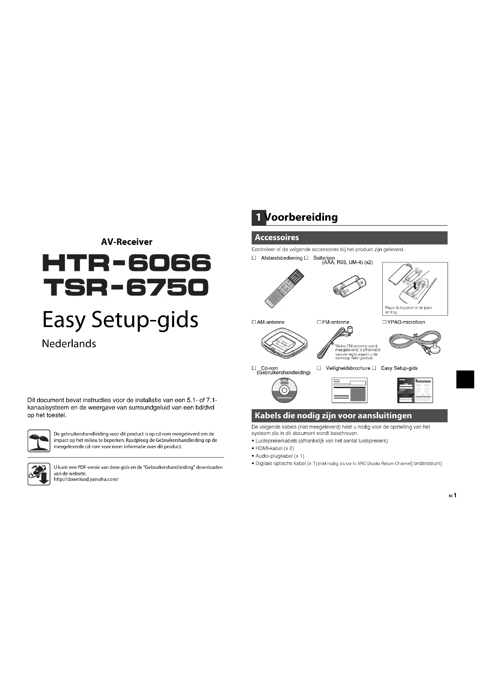 Selección de la fuente de entrada y los ajustes favoritos de una vez Para obtener más información, consulte “Qué puede hacer con la unidad”.Nl 1Controleer of de volgende accessoires bij het product zijn geleverd.De volgende kabels (niet meegeleverd) hebt u nodig voor de opstelling van het systeem die in dit document wordt beschreven.• Luidsprekerkabels (afhankelijk van het aantal luidsprekers)• HDMI-kabel (x 2)• Audio-plugkabel (x 1)• Digitale optische kabel (x 1) (niet nodig als uw tv ARC [Audio Return Channel] ondersteunt) 1 Voorbereiding Accessoires Afstandsbediening Batterijen (AAA, R03, UM-4) (x2)Plaats de batterijen in de juiste richting. AM-antenne FM-antenne YPAO-microfoon Cd-rom (Gebruikershandleiding) Veiligheidsbrochure Easy Setup-gids *Welke FM-antenne wordt meegeleverd, is afhankelijk van de regio waarin u de aankoop hebt gedaan. Kabels die nodig zijn voor aansluitingen Easy Setup-gids Nederlands AV-Receiver Dit document bevat instructies voor de installatie van een 5.1- of 7.1- kanaalsysteem en de weergave van surroundgeluid van een bd/dvd op het toestel. De gebruikershandleiding voor dit product is op cd-rom meegeleverd om de impact op het milieu te beperken. Raadpleeg de Gebruikershandleiding op de meegeleverde cd-rom voor meer informatie over dit product.U kunt een PDF-versie van deze gids en de “Gebruikershandleiding” downloaden van de website.http://download.yamaha.com/2 Nl Plaats de luidsprekers in de kamer zoals afgebeeld in het onderstaande overzicht. Raadpleeg de “Gebruikershandleiding” voor meer informatie over andere luidsprekersystemen. 1 Voorste luidspreker (L) 2 Voorste luidspreker (R) 3 Middelste luidspreker 4 Surroundluidspreker (L) 5 Surroundluidspreker (R) 6 Achterste surroundluidspreker (L) 7 Achterste surroundluidspreker (R) 9 Subwoofer 2 Luidsprekers plaatsen 5.1-kanaalsysteem
