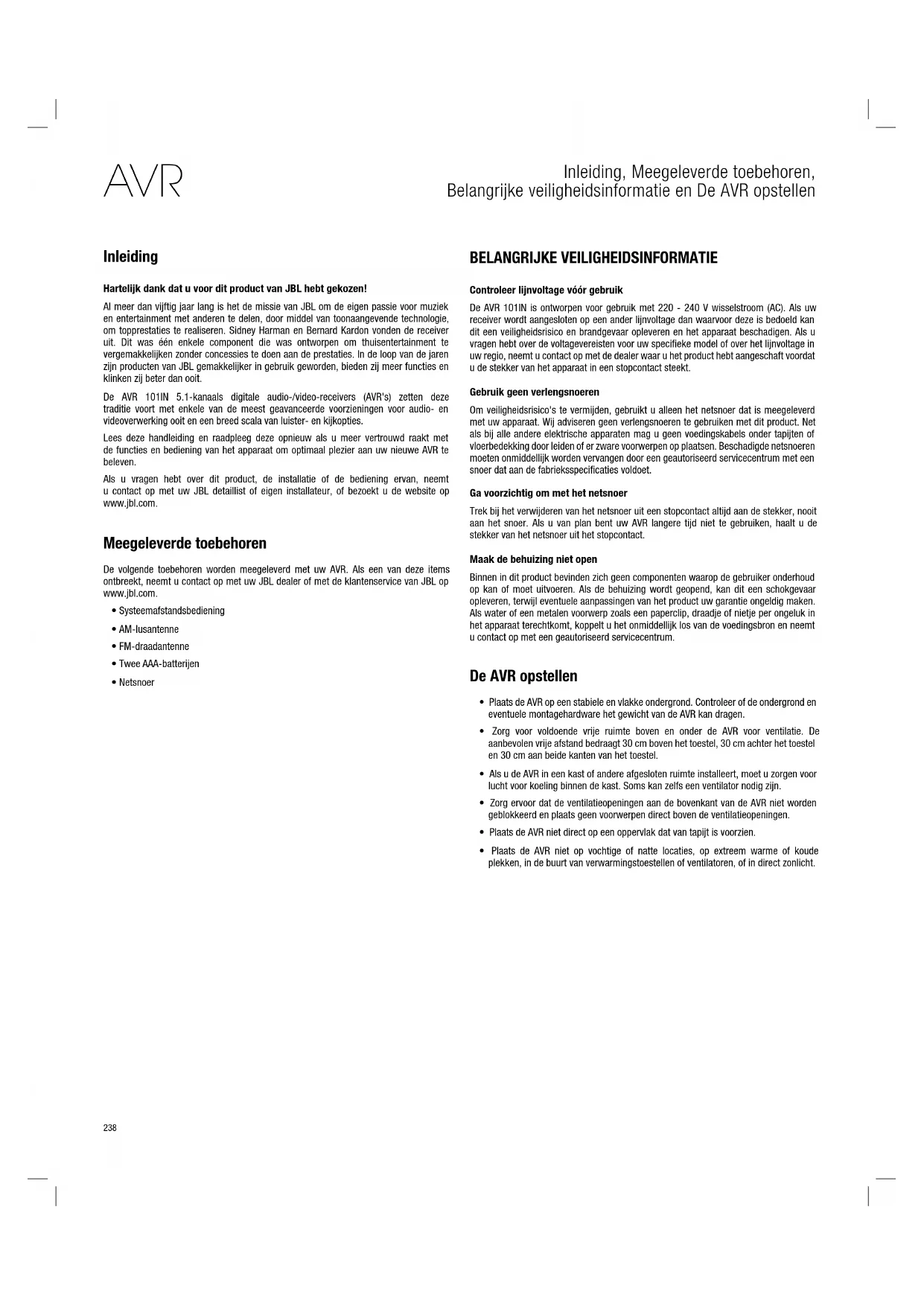 SYSTEEMINSTELLINGEN 264 UITSCHAKELTIMER 264 PROCESSOR RESETTEN 264 PROBLEMEN OPLOSSEN 265 SPECIFICATIES 266 BIJLAGE 267238 AVR Inleiding, Meegeleverde toebehoren, Belangrijke veiligheidsinformatie en De AVR opstellen Inleiding Hartelijk dank dat u voor dit product van JBL hebt gekozen! Al meer dan vijftig jaar lang is het de missie van JBL om de eigen passie voor muziek en entertainment met anderen te delen, door middel van toonaangevende technologie, om topprestaties te realiseren. Sidney Harman en Bernard Kardon vonden de receiver uit. Dit was één enkele component die was ontworpen om thuisentertainment te vergemakkelijken zonder concessies te doen aan de prestaties. In de loop van de jaren zijn producten van JBL gemakkelijker in gebruik geworden, bieden zij meer functies en klinken zij beter dan ooit. De AVR 101IN 5.1-kanaals digitale audio-/video-receivers (AVR's) zetten deze traditie voort met enkele van de meest geavanceerde voorzieningen voor audio- en videoverwerking ooit en een breed scala van luister- en kijkopties. Lees deze handleiding en raadpleeg deze opnieuw als u meer vertrouwd raakt met de functies en bediening van het apparaat om optimaal plezier aan uw nieuwe AVR te beleven. Als u vragen hebt over dit product, de installatie of de bediening ervan, neemt u contact op met uw JBL detaillist of eigen installateur, of bezoekt u de website op www.jbl.com. Meegeleverde toebehoren De volgende toebehoren worden meegeleverd met uw AVR. Als een van deze items ontbreekt, neemt u contact op met uw JBL dealer of met de klantenservice van JBL op www.jbl.com.