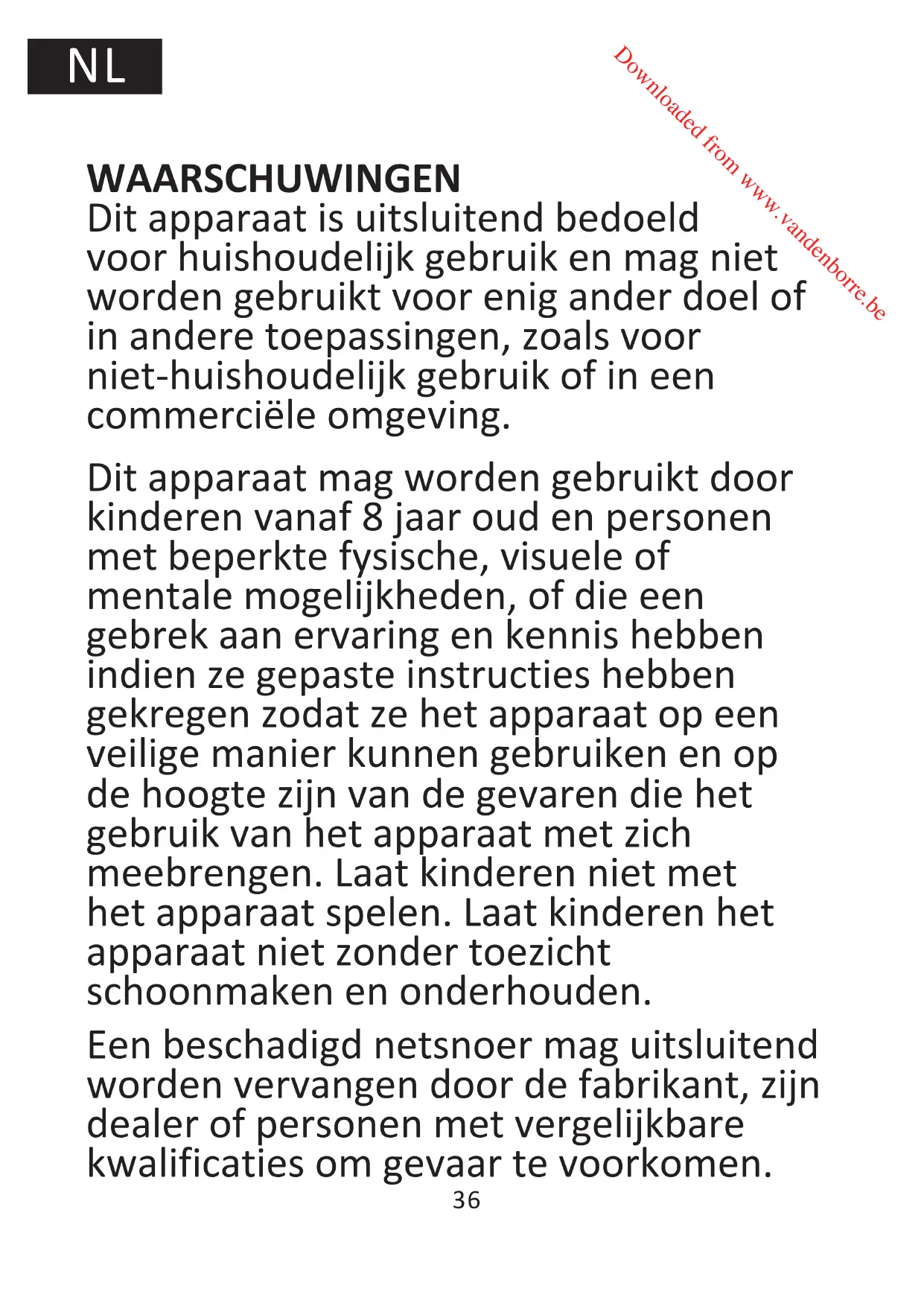 WAARSCHUWINGEN Dit apparaat is uitsluitend bedoeld voor huishoudelijk gebruik en mag niet worden gebruikt voor enig ander doel of in andere toepassingen, zoals voor niet-huishoudelijk gebruik of in een commerciële omgeving. Dit apparaat mag worden gebruikt door kinderen vanaf 8 jaar oud en personen met beperkte fysische, visuele of mentale mogelijkheden, of die een gebrek aan ervaring en kennis hebben indien ze gepaste instructies hebben gekregen zodat ze het apparaat op een veilige manier kunnen gebruiken en op de hoogte zijn van de gevaren die het gebruik van het apparaat met zich meebrengen. Laat kinderen niet met het apparaat spelen. Laat kinderen het apparaat niet zonder toezicht schoonmaken en onderhouden. Een beschadigd netsnoer mag uitsluitend worden vervangen door de fabrikant, zijn dealer of personen met vergelijkbare kwalificaties om gevaar te voorkomen. Downloaded from www.vandenborre.beNL