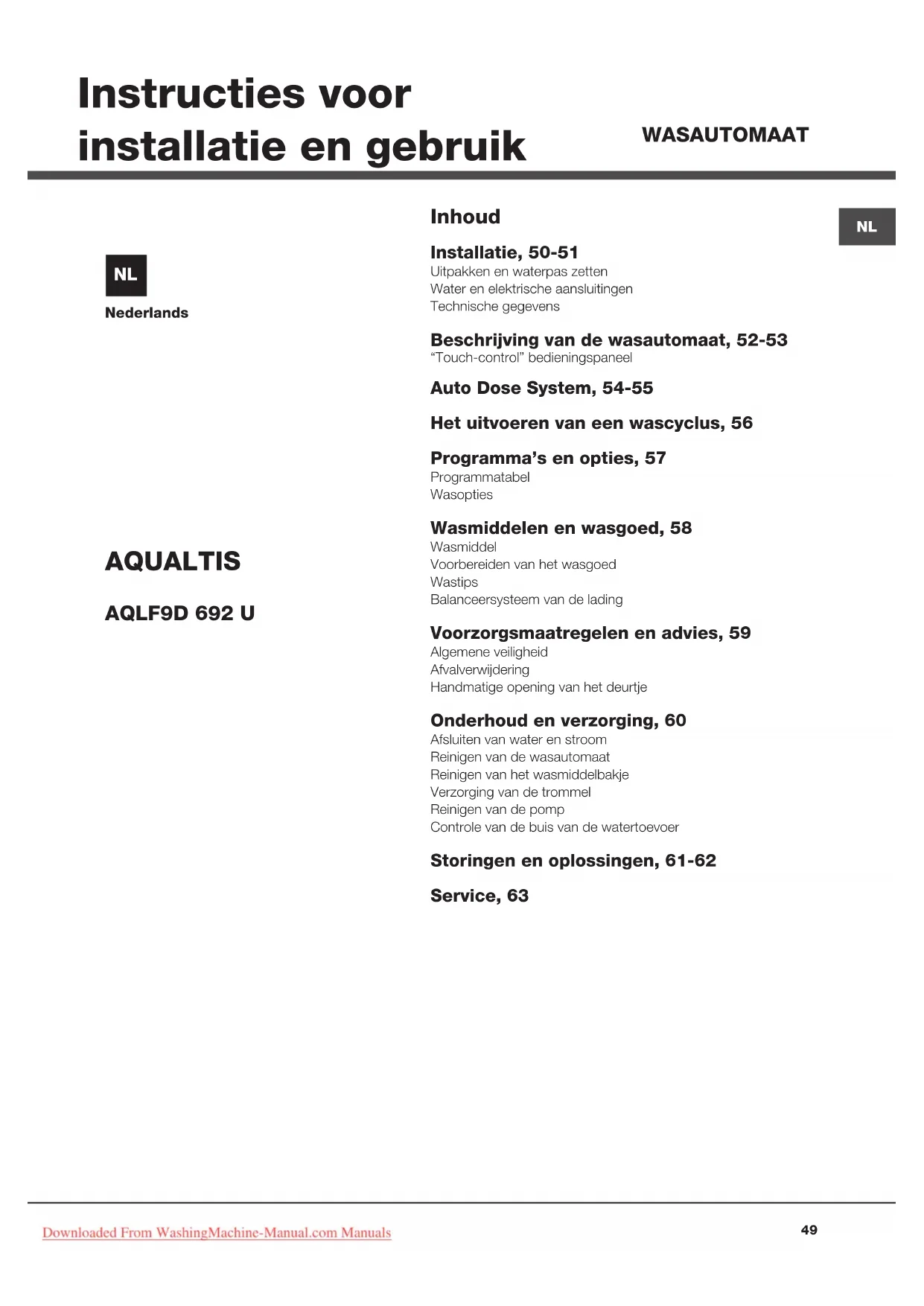 Nederlands Inhoud Installatie, 50-51 Uitpakken en waterpas zettenWater en elektrische aansluitingenTechnische gegevens Beschrijving van de wasautomaat, 52-53 “Touch-control” bedieningspaneel Auto Dose System, 54-55 Het uitvoeren van een wascyclus, 56 Programma’s en opties, 57 ProgrammatabelWasopties Wasmiddelen en wasgoed, 58 WasmiddelVoorbereiden van het wasgoedWastipsBalanceersysteem van de lading Voorzorgsmaatregelen en advies, 59 Algemene veiligheidAfvalverwijderingHandmatige opening van het deurtje Onderhoud en verzorging, 60 Afsluiten van water en stroomReinigen van de wasautomaatReinigen van het wasmiddelbakjeVerzorging van de trommelReinigen van de pompControle van de buis van de watertoevoer Storingen en oplossingen, 61-62 Service, 63