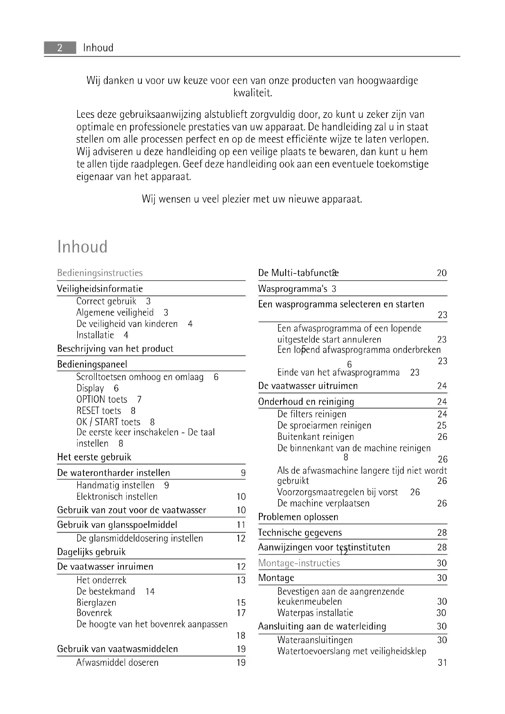 InhoudAansluiting waterafvoerslang 31 Aansluiting aan het elektriciteitsnet 33 Milieubescherming 33 Verpakkingsmateriaal 33 Wijzigingen voorbehouden Bedieningsinstructies Veiligheidsinformatie In het belang van uw veiligheid en om een correct gebruik te kunnen waarborgen is het van belang dat u, alvorens het apparaat te installeren en in gebruik te nemen, deze ge- bruiksaanwijzing, inclusief de tips en waarschuwingen, grondig doorleest. Om onnodige vergissingen en ongevallen te voorkomen is het belangrijk te waarborgen dat alle mensen die het apparaat gebruiken, volledig bekend zijn met de werking ervan en de veiligheids- voorzieningen. Bewaar deze instructies en zorg ervoor dat zij bij het apparaat blijven als het wordt verplaatst of verkocht, zodat iedereen die het apparaat gedurende zijn hele levensduur gebruikt, naar behoren is geïnformeerd over het gebruik en de veiligheid van het apparaat. Correct gebruik
