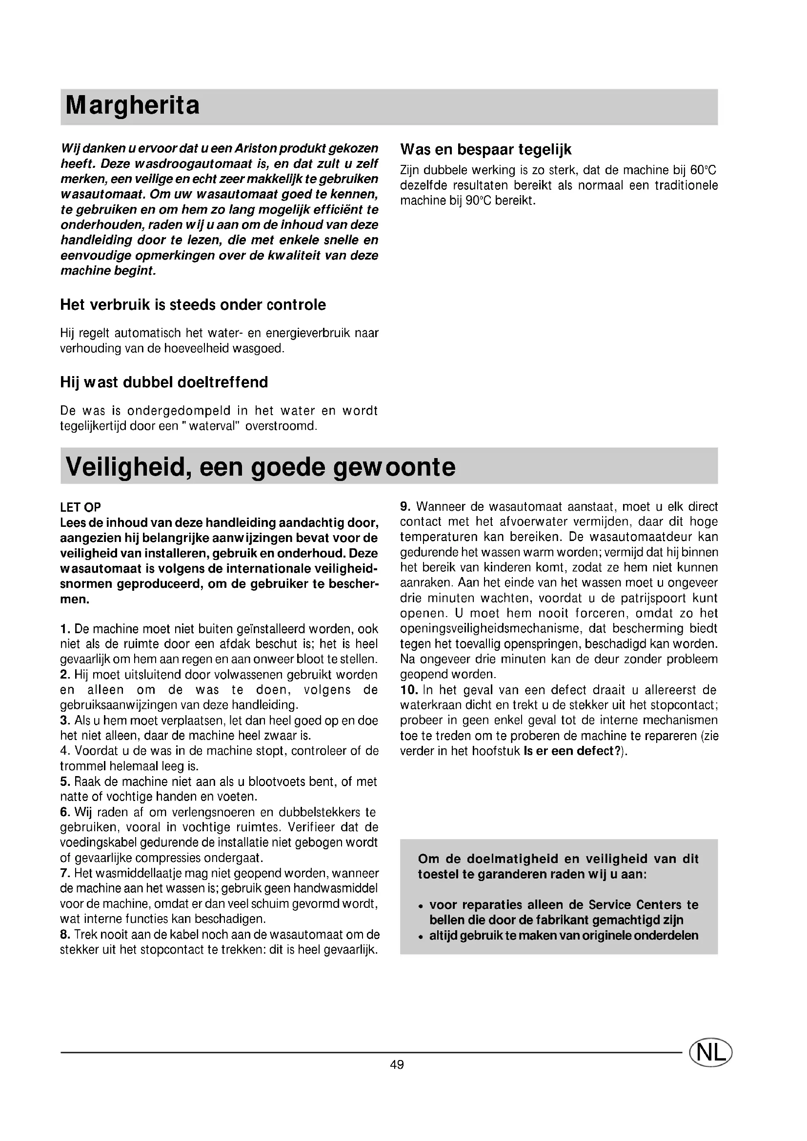 waterkraan dicht en trekt u de stekker uit het stopcontact; probeer in geen enkel geval tot de interne mechanismen toe te treden om te proberen de machine te repareren (zie verder in het hoofstuk Is er een defect?). Was en bespaar tegelijk Zijn dubbele werking is zo sterk, dat de machine bij 60°C dezelfde resultaten bereikt als normaal een traditionele machine bij 90°C bereikt. Margherita Om de doelmatigheid en veiligheid van dit toestel te garanderen raden wij u aan: voor reparaties alleen de Service Centers te bellen die door de fabrikant gemachtigd zijn altijd gebruik te maken van originele onderdelen