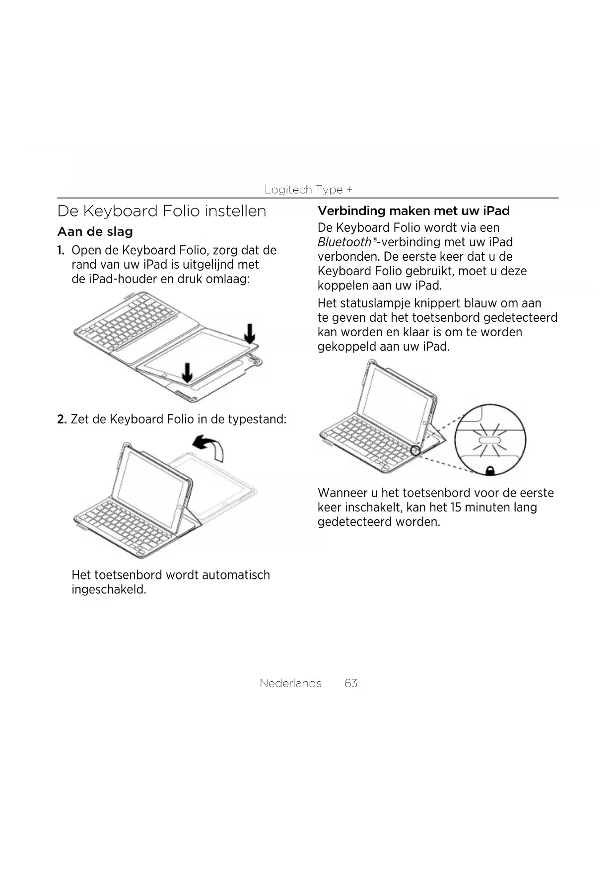 voert u deze in op het toetsenbord van de folio (niet op uw iPad). Wanneer verbinding tot stand is gebracht, brandt het statuslampje even blauw en daarna gaat het weer uit.Logitech Type + Nederlands 65 De Keyboard Folio gebruiken Twee weergavestanden De Keyboard Folio heeft twee weergavestanden: één voor typen en één voor browsen. Als u wilt typen, zet u de Keyboard Folio in de typestand. Lijn de houder uit met de ingebouwde magneet om deze stevig te bevestigen. Het toetsenbord wordt automatisch ingeschakeld wanneer u de Keyboard Folio in de typestand plaatst. Als u wilt browsen, zet u de Keyboard Folio in de browsestand: Het toetsenbord schakelt automatisch uit wanneer u de Keyboard Folio uit de typestand haalt.Logitech Type + 66 Nederlands Uw iPad losmaken Buig een van de hoeken van de iPad- houder naar achteren om uw iPad uit het folio los te maken: Uw iPad wordt nu vrijgegeven: Uw iPad opbergen om mee te nemen