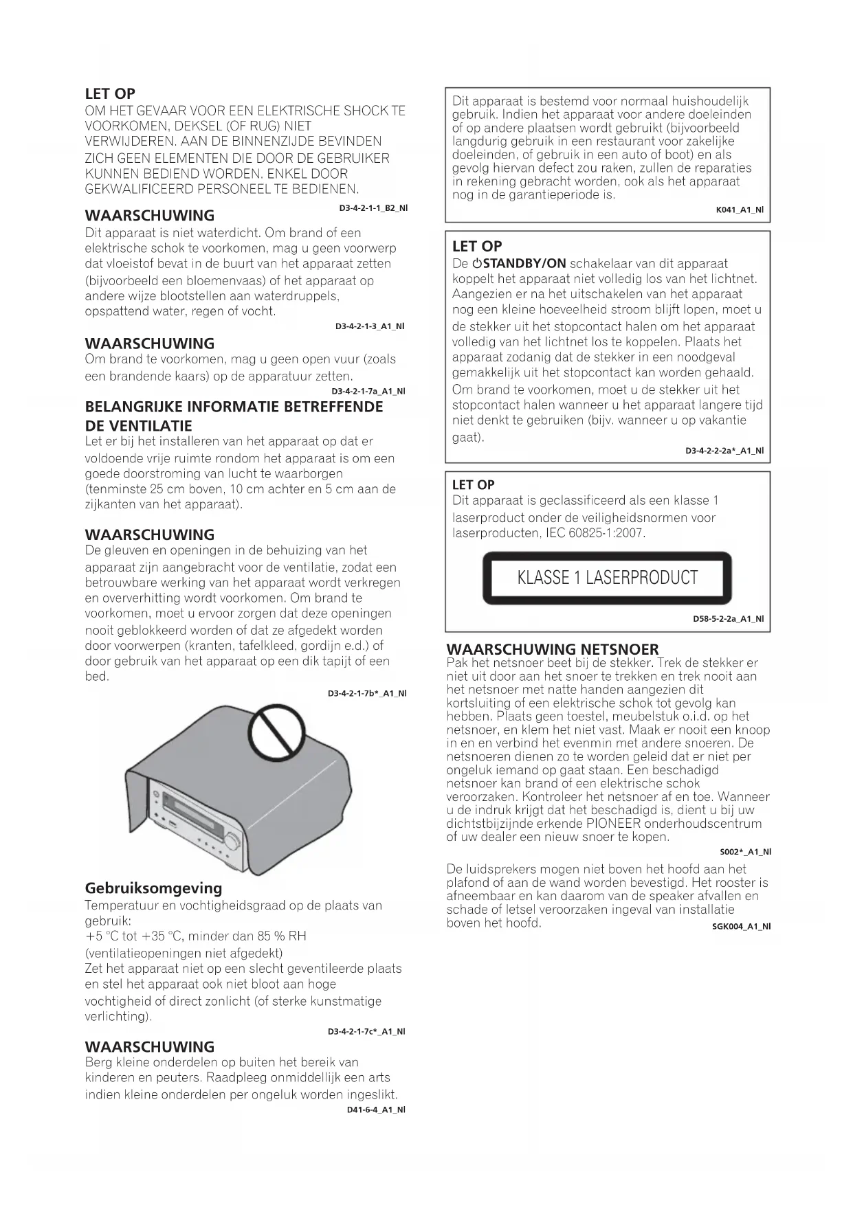 English Français Deutsch Nederlands Italiano Español Pyccкий ;+09B<;(B,WERRN࣮࣌ࢪ㸰㸮㸯㸲ᖺ㸱᭶㸰㸶᪥ࠉ㔠᭙᪥ࠉ༗ᚋ㸯㸰㸮ศDe luidsprekers mogen niet boven het hoofd aan het plafond of aan de wand worden bevestigd. Het rooster is afneembaar en kan daarom van de speaker afvallen en schade of letsel veroorzaken ingeval van installatie boven het hoofd.SGK004_A1_Nl WAARSCHUWING NETSNOER Pak het netsnoer beet bij de stekker. Trek de stekker er niet uit door aan het snoer te trekken en trek nooit aan het netsnoer met natte handen aangezien dit kortsluiting of een elektrische schok tot gevolg kan hebben. Plaats geen toestel, meubelstuk o.i.d. op het netsnoer, en klem het niet vast. Maak er nooit een knoop in en en verbind het evenmin met andere snoeren. De netsnoeren dienen zo te worden geleid dat er niet per ongeluk iemand op gaat staan. Een beschadigd netsnoer kan brand of een elektrische schok veroorzaken. Kontroleer het netsnoer af en toe. Wanneer u de indruk krijgt dat het beschadigd is, dient u bij uw dichtstbijzijnde erkende PIONEER onderhoudscentrum of uw dealer een nieuw snoer te kopen.S002*_A1_NlDit apparaat is bestemd voor normaal huishoudelijk gebruik. Indien het apparaat voor andere doeleinden of op andere plaatsen wordt gebruikt (bijvoorbeeld langdurig gebruik in een restaurant voor zakelijke doeleinden, of gebruik in een auto of boot) en als gevolg hiervan defect zou raken, zullen de reparaties in rekening gebracht worden, ook als het apparaat nog in de garantieperiode is.K041_A1_NlLET OPDit apparaat is geclassificeerd als een klasse 1 laserproduct onder de veiligheidsnormen voor laserproducten, IEC 60825-1:2007. KLASSE 1 LASERPRODUCT D58-5-2-2a_A1_Nl WAARSCHUWING Berg kleine onderdelen op buiten het bereik van kinderen en peuters. Raadpleeg onmiddellijk een arts indien kleine onderdelen per ongeluk worden ingeslikt.D41-6-4_A1_Nl LET OP De STANDBY/ON schakelaar van dit apparaat koppelt het apparaat niet volledig los van het lichtnet. Aangezien er na het uitschakelen van het apparaat nog een kleine hoeveelheid stroom blijft lopen, moet u de stekker uit het stopcontact halen om het apparaat volledig van het lichtnet los te koppelen. Plaats het apparaat zodanig dat de stekker in een noodgeval gemakkelijk uit het stopcontact kan worden gehaald. Om brand te voorkomen, moet u de stekker uit het stopcontact halen wanneer u het apparaat langere tijd niet denkt te gebruiken (bijv. wanneer u op vakantie gaat).D3-4-2-2-2a*_A1_Nl Gebruiksomgeving Temperatuur en vochtigheidsgraad op de plaats van gebruik:+5 °C tot +35 °C, minder dan 85 % RH (ventilatieopeningen niet afgedekt)Zet het apparaat niet op een slecht geventileerde plaats en stel het apparaat ook niet bloot aan hoge vochtigheid of direct zonlicht (of sterke kunstmatige verlichting).D3-4-2-1-7c*_A1_Nl