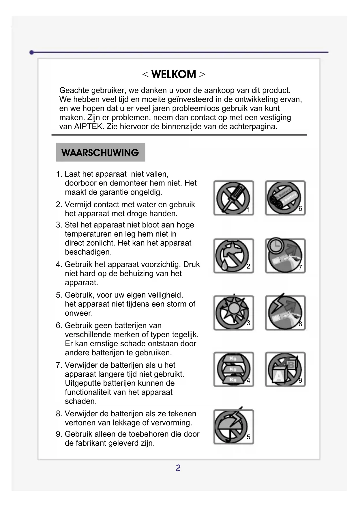 Ga in de DELETE mode (VERWIJDERSTAND) met de knop naar DEMO. Druk op de MENU-knop om te bevestigen. Selecteer het spoor met of . Druk op knop A-B om te bevestigen. Gebruik of om te kiezen tussen “Yes?” (Ja?) en “No?Nee?”. (Bij Ja wordt er verwijderd, bij Nee gaat u terug naar het hogere menu). Druk op knop A-B om te bevestigen. Houd, nadat het Demospoor verwijderd is, de AFSPEEL-knop ingedrukt tot het afspelen stopt om de DELETE mode (VERWIJDERSTAND) de beëindigen. Del ... No? Yes? DELETE DEMO GEAVANCEERDE FUNCTIES27 VERDERE INFORMATIE Aanduiding van het batterijniveau Aan de indicator van het batterijniveau ziet u hoe lang u de batterijen nog kunt gebruiken. Meer dan 90 %. Meer dan 70 %. Meer dan 40 %. Meer dan 10 %. Vervang de batterijen direct. Bijna leeg. Het pictogram zal 5 à 10 seconden knipperen waarna de MP3-speler automatisch uitschakelt.28 Afmetingen van LCD-scherm 10 mm (H) bij 27 mm (B) LCD-scherm Met blauwe verlichting Interface Voldoet aan USB 1.1 Muziekindeling MP3 (MPEG-1 Laag 3) WMA (5Kb/s ~ 192Kb/s) Taalondersteuning Engels, Duits Digitale spraakopname 6.3Kb/s (G723.1) 32Kb/s (ADPCM) Opnamekwaliteit: MIC (Mono) 8kHz 6.3Kb/s (ASF) 8kHz 32Kb/s (WAV) Opnametijd 8 uur bij 32Kb/s (bijvoorbeeld 128 MB) Aansluiting voor oortelefoon φ3.5 mm Continu speeltijd Meer dan 14 uur Audio-uitgang 5mW Uitgangsfrequentie 20Hz ~ 20kHz Voeding 2 x AAA-batterijen Afmetingen 91 x 30 x 23 mm Gewicht 40 g (zonder batterijen) FAT bestandssysteem ondersteunt FAT16 Specificaties VERDERE INFORMATIE29 PROBLEMEN OPLOSSEN Vraag Antwoord Kan niet ingeschakeld worden. ► Controleer of er batterijen geplaatst zijn. ► Controleer of de batterijen nog goed zijn. ► Controleer of de Blokkeerschakelaar uitstaat. De MP3-speler kan geen muziek- en spraakbestanden afspelen. ► Controleer of er MP3-bestanden in de speler zijn. Zo niet, sluit hem dan op de computer aan om bestanden over te sturen. ► Controleer of de monsterfrequentie van WMA minder is dan 192Kb/s. De knoppen reageren niet. ► Controleer of de Blokkeerschakelaar uitstaat. ► In de ALARM-stand kan de Geluidssterkte (+) en (-) niet geregeld worden. ► In de subdirectory van het Menu kan de Geluidssterkte (+) en (-) niet geregeld worden. De naam van het spoor is niet leesbaar. ► Controleer of de juiste taal is ingesteld. ► Negeer dit probleem. Het kan veroorzaakt zijn door onbruikbare bestandsnamen of een ID3-tag, doordat de speler alleen Engels en Duits herkent. Kan de speler muziek en bestanden in de map afspelen? ► De speler werkt met bestanden in de hoofdmap en ook met bestanden in een andere map. Lcd toont verkeerd bericht bij het inschakelen. ► Zorg ervoor dat het bestandssysteem “FAT16” is.Manual do utilizador2 Caro utilizador, obrigado por ter adquirido este produto. Foi feito um grande investimento em tempo e em esforços para desenvolver este produto. Além disso, esperamos que este dispositivo funcione durante muitos anos sem qualquer tipo de problemas. Se ocorrerem problemas, contacte os escritórios da AIPTEK indicados no interior da contra-capa. < BOAS-VINDAS >