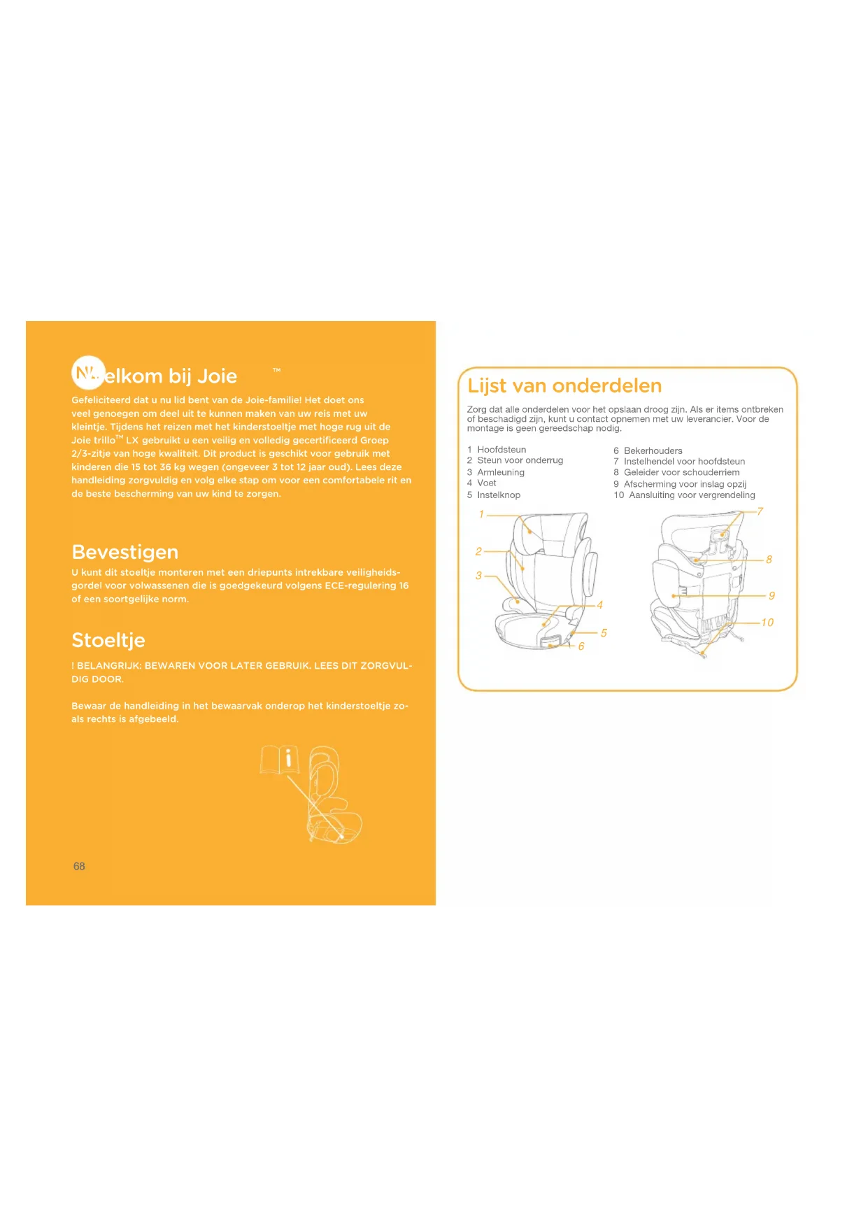 gebruikt u een veilig en volledig gecertificeerd Groep 2/3-zitje van hoge kwaliteit. Dit product is geschikt voor gebruik met kinderen die 15 tot 36 kg wegen (ongeveer 3 tot 12 jaar oud). Lees deze handleiding zorgvuldig en volg elke stap om voor een comfortabele rit en de beste bescherming van uw kind te zorgen. Bevestigen U kunt dit stoeltje monteren met een driepunts intrekbare veiligheids-gordel voor volwassenen die is goedgekeurd volgens ECE-regulering 16 of een soortgelijke norm. Stoeltje ! BELANGRIJK: BEWAREN VOOR LATER GEBRUIK. LEES DIT ZORGVUL-DIG DOOR. Bewaar de handleiding in het bewaarvak onderop het kinderstoeltje zo-als rechts is afgebeeld.6 Bekerhouders7 Instelhendel voor hoofdsteun8 Geleider voor schouderriem9 Afscherming voor inslag opzij10 Aansluiting voor vergrendeling Lijst van onderdelen Zorg dat alle onderdelen voor het opslaan droog zijn. Als er items ontbreken of beschadigd zijn, kunt u contact opnemen met uw leverancier. Voor de montage is geen gereedschap nodig.1 Hoofdsteun2 Steun voor onderrug3 Armleuning4 Voet5 Instelknop