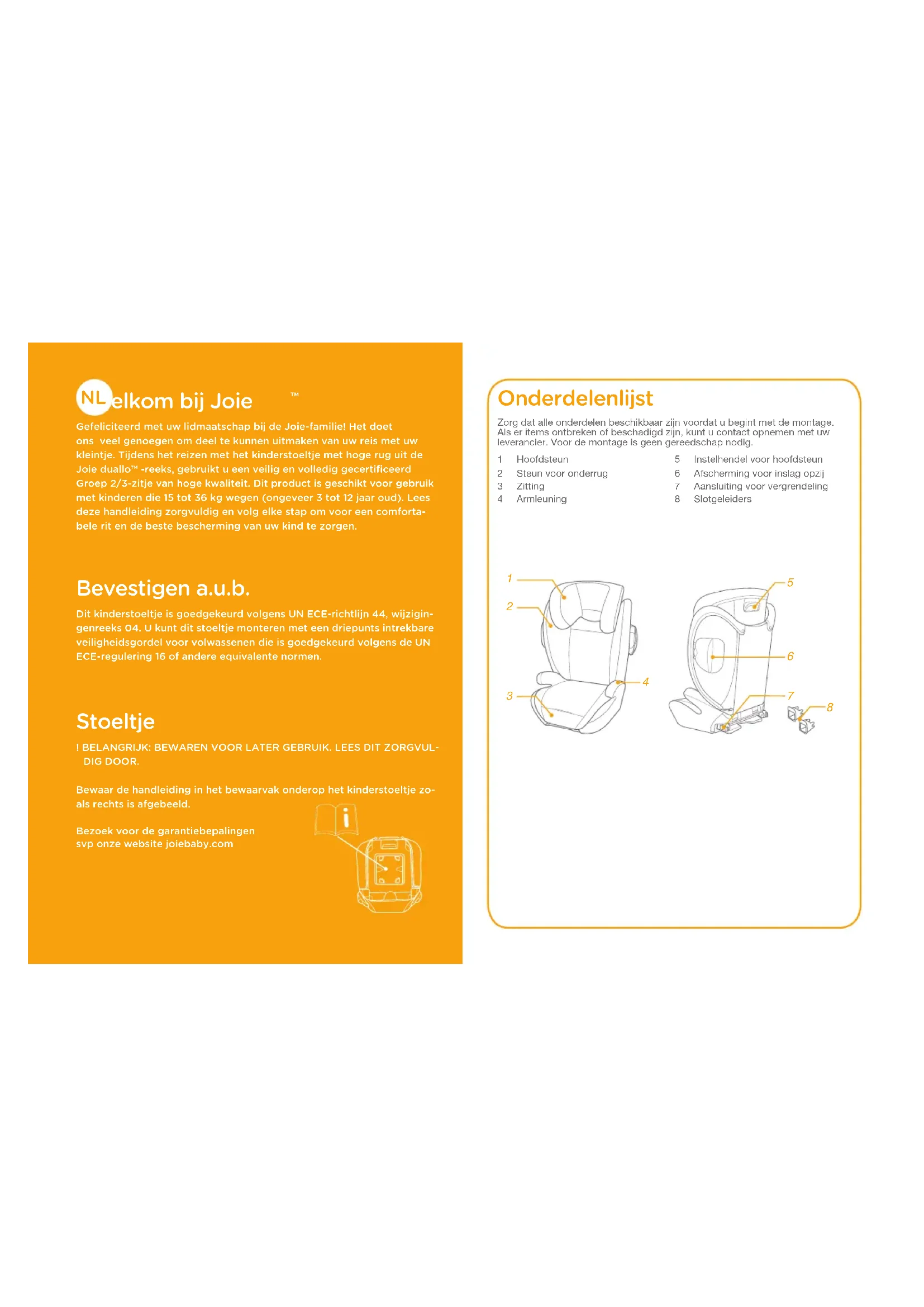 Gefeliciteerd met uw lidmaatschap bij de Joie-familie! Het doet ons veel genoegen om deel te kunnen uitmaken van uw reis met uw kleintje. Tijdens het reizen met het kinderstoeltje met hoge rug uit de Joie duallo™ -reeks, gebruikt u een veilig en volledig gecertificeerd Groep 2/3-zitje van hoge kwaliteit. Dit product is geschikt voor gebruik met kinderen die 15 tot 36 kg wegen (ongeveer 3 tot 12 jaar oud). Lees deze handleiding zorgvuldig en volg elke stap om voor een comforta-bele rit en de beste bescherming van uw kind te zorgen. Bevestigen a.u.b. Dit kinderstoeltje is goedgekeurd volgens UN ECE-richtlijn 44, wijzigin-genreeks 04. U kunt dit stoeltje monteren met een driepunts intrekbare veiligheidsgordel voor volwassenen die is goedgekeurd volgens de UN ECE-regulering 16 of andere equivalente normen. Stoeltje ! BELANGRIJK: BEWAREN VOOR LATER GEBRUIK. LEES DIT ZORGVUL-DIG DOOR.Bewaar de handleiding in het bewaarvak onderop het kinderstoeltje zo-als rechts is afgebeeld.Bezoek voor de garantiebepalingen svp onze website joiebaby.com