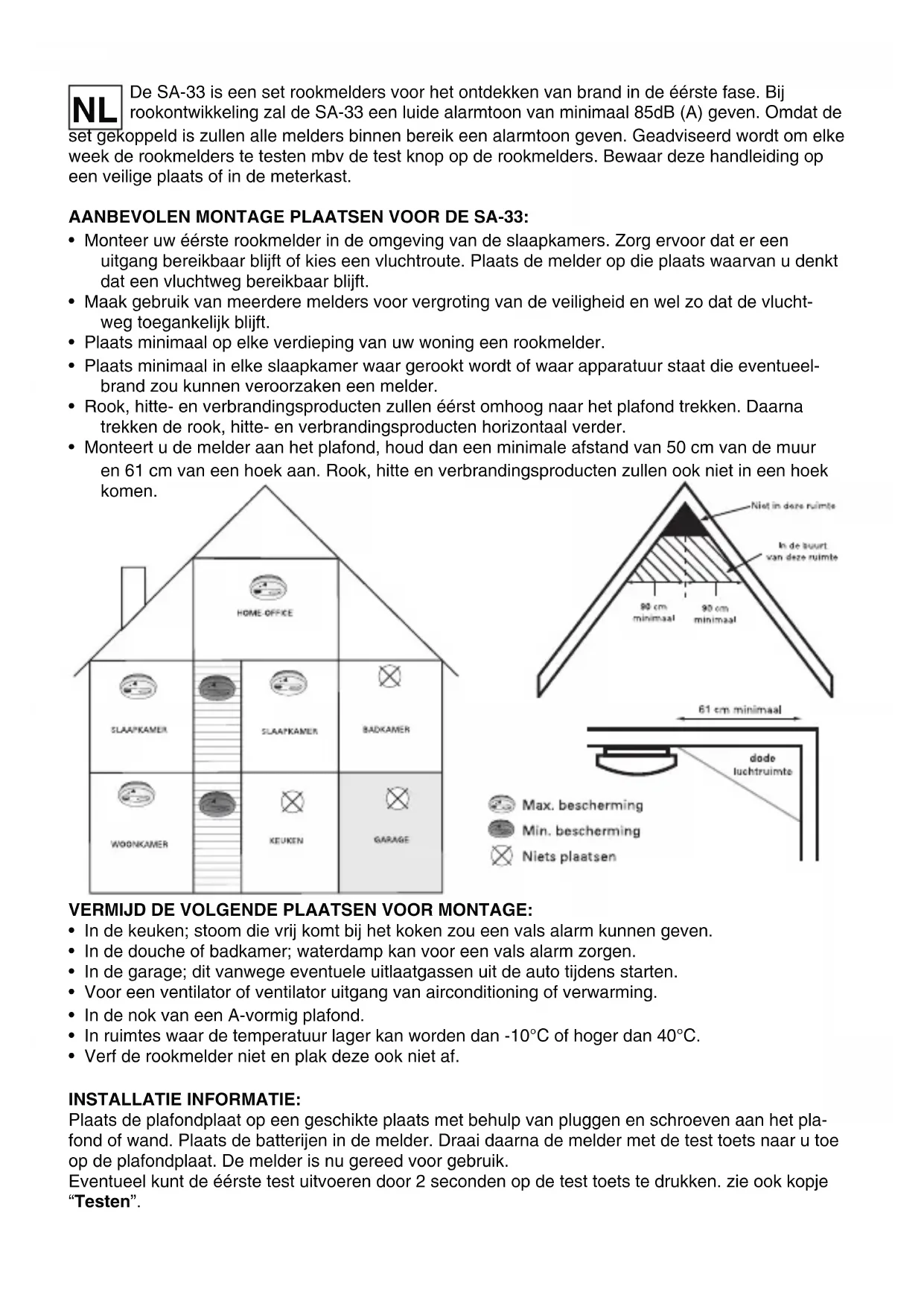 SA-33 Rookmelders voor gebruik in huiselijke omgeving Détecteur de fumée pour l’usage dans l’entourage domestique Rauchmelder zum Gebrauch im Heimbereich Detector de humo para uso en el hogar Interlinkable Brancher plusieurs Koppelbar EnlazadosDe SA-33 is een set rookmelders voor het ontdekken van brand in de éérste fase. Bij rookontwikkeling zal de SA-33 een luide alarmtoon van minimaal 85dB (A) geven. Omdat de set gekoppeld is zullen alle melders binnen bereik een alarmtoon geven. Geadviseerd wordt om elke week de rookmelders te testen mbv de test knop op de rookmelders. Bewaar deze handleiding op een veilige plaats of in de meterkast. AANBEVOLEN MONTAGE PLAATSEN VOOR DE SA-33: