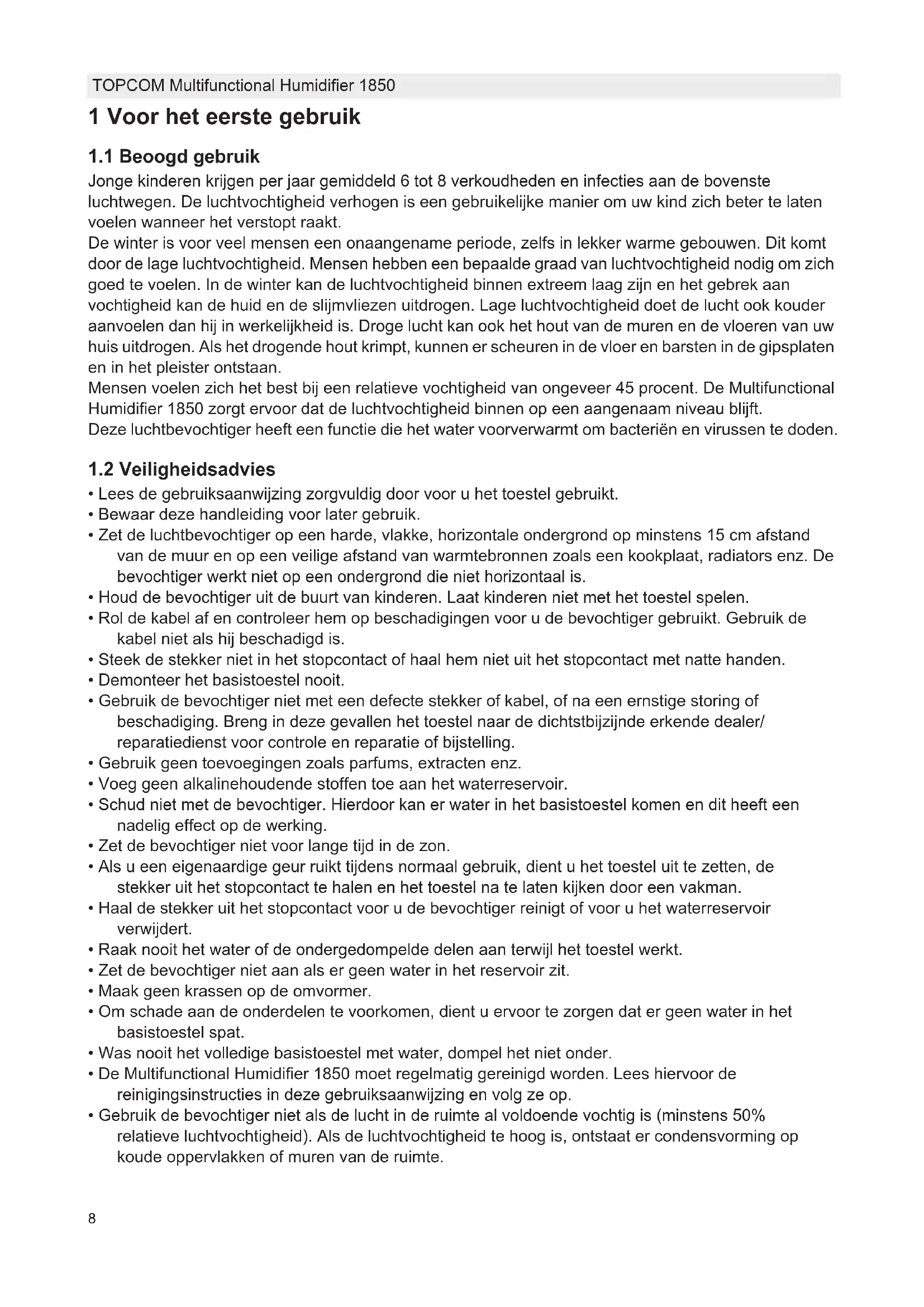 - Gebruik de bevochtiger niet als de lucht in de ruimte al voldoende vochtig is (minstens 50% relatieve luchtvochtigheid). Als de luchtvochtigheid te hoog is, ontstaat er condensvorming op koude oppervlakken of muren van de ruimte.9 NEDERLANDS TOPCOM Multifunctional Humidifier 1850 2 Technische specificaties – Bevochtigingscapaciteit: 400ml/u (warme nevel) / 300ml/u (koude nevel) – Volume waterreservoir: 6 l – Nominaal voltage: 230 V AC – Nominale frequentie: 50 Hz – Nominaal vermogen: 130 W – Bescherming tegen elektrische schokken: klasse II 3 Beschrijving