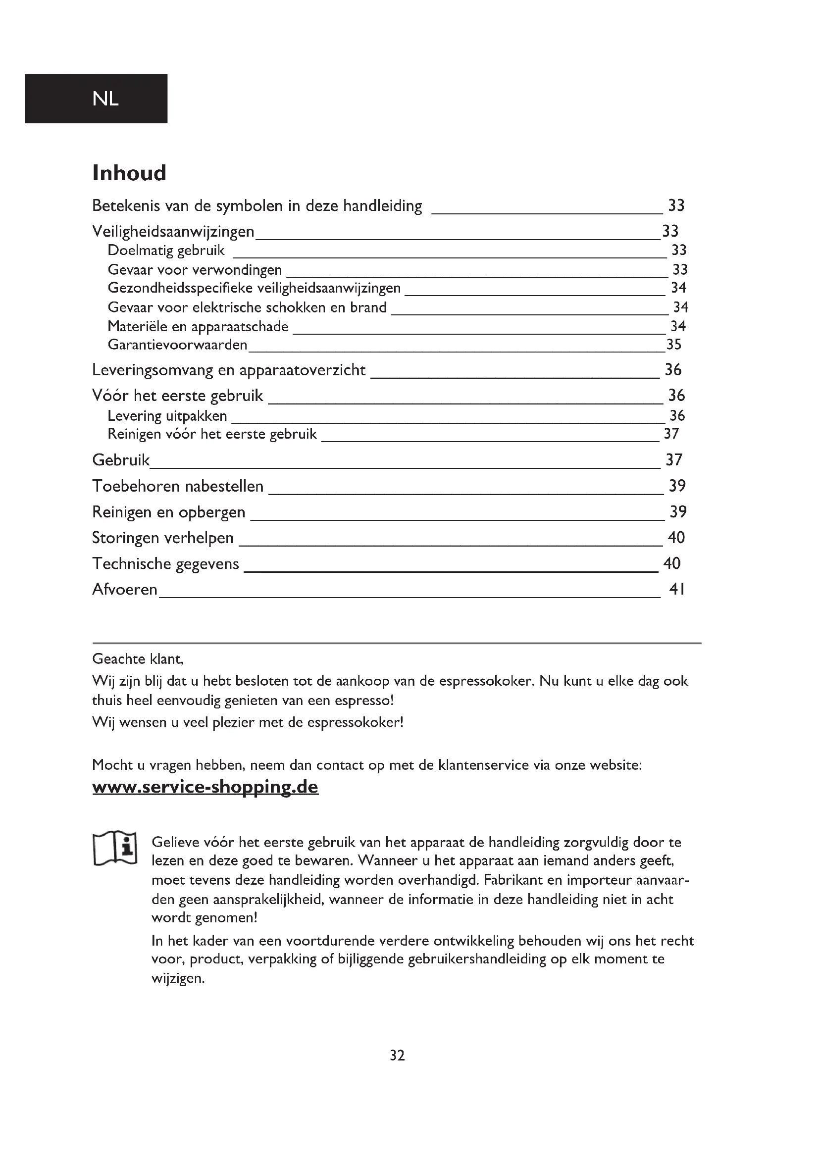 Inhoud Betekenis van de symbolen in deze handleiding ________________________ 33 Veiligheidsaanwijzingen __________________________________________ 33 Doelmatig gebruik __________________________________________________ 33 Gevaar voor verwondingen ____________________________________________ 33 Gezondheidsspecifi eke veiligheidsaanwijzingen ______________________________ 34 Gevaar voor elektrische schokken en brand ________________________________ 34 Materiële en apparaatschade ___________________________________________ 34 Garantievoorwaarden ________________________________________________ 35 Leveringsomvang en apparaatoverzicht ______________________________ 36 Vóór het eerste gebruik _________________________________________ 36 Levering uitpakken __________________________________________________ 36 Reinigen vóór het eerste gebruik _______________________________________ 37 Gebruik_____________________________________________________ 37 Toebehoren nabestellen _________________________________________ 39 Reinigen en opbergen ___________________________________________ 39 Storingen verhelpen ____________________________________________ 40 Technische gegevens ___________________________________________ 40 Afvoeren ____________________________________________________ 4133 Betekenis van de symbolen in deze handleiding Alle veiligheidsaanwijzingen zijn voorzien van dit symbool. Lees deze aandachtig door en houd u aan de veiligheidsaanwijzingen om lichamelijk letsel en materiële schade te voorkomen. Tips en adviezen zijn voorzien van dit symbool. Geschikt voor levensmiddelen. Veiligheidsaanwijzingen Doelmatig gebruik ❐ Het apparaat is uitsluitend geschikt voor het zetten van koffi e en espresso. ❐ Het apparaat is niet geschikt voor het zetten van chocolademelk of thee. ❐ Gebruik alleen zuiver, niet te fi jn gemalen espresso-/koffi epoeder. Koffi esurrogaat of koffi e-extract bevatten kleverige stoffen die de zeven van de expressokoker kunnen verstoppen. ❐ Het apparaat is uitsluitend bestemd voor particulier gebruik, niet voor commerciële doel- einden. ❐ Gebruik het apparaat uitsluitend zoals beschreven in de handleiding. Elk ander gebruik geldt als niet-doelmatig. Gevaar voor verwondingen ❐ Houd kinderen en dieren uit de buurt van het verpakkingsmateriaal. Er bestaat verstik- kingsgevaar! ❐ Dit apparaat is niet bedoeld voor gebruik door personen (inclusief kinderen) met beperkte sensorische of geestelijke vermogens of met een gebrek aan ervaring en/of gebrek aan kennis, tenzij een persoon die belast is met hun veiligheid toezicht op hen houdt of hen instructies heeft gegeven, hoe het apparaat moet worden gebruikt. Kinderen moeten onder toezicht staan, om ervoor te zorgen dat zij niet met het apparaat spelen. ❐ Berg het apparaat op een voor kinderen ontoegankelijke plaats op! ❐ Verbrandingsgevaar! De espressokoker wordt tijdens het gebruik zeer heet! Pak het ap- paraat alleen beet bij de grepen en gebruik eventueel keukenhandschoenen om verwon- dingen te voorkomen. ❐ Verbrandingsgevaar! De espressokoker stoot hete damp uit! Hals, gezicht en handen tijdens het espresso of koffi e zetten uit de gevarenzone houden! ❐ Verbrandingsgevaar! Let erop, dat de veiligheidsklep bij het waterreservoir niet in de richting van de gebruiker wijst. Bij activering van de veiligheidsklep ontsnapt uit de ope- ning hete damp!34 Gezondheidsspecifi eke veiligheidsaanwijzingen ❐ Er kunnen mogelijkerwijs productieresten op het apparaat zijn achtergebleven. Om schade aan de gezondheid te voorkomen, dient u het grondig te reinigen alvorens het voor de eerste keer te gebruiken (zie hoofdstuk ‘Reinigen en opbergen’). Gevaar voor elektrische schokken en brand ❐ Sluit het apparaat uitsluitend aan op een contactdoos, die volgens de voorschriften is geïnstalleerd en overeenstemt met de technische gegevens van het apparaat (zie hoofdstuk ‘Technische gegevens’). ❐ Leg het snoer zo, dat het niet bekneld raakt of wordt geknikt en niet met hete oppervlak- ken in aanraking komt (dit geldt ook voor de hete oppervlakken van de espressokoker!). ❐ Trek de netstekker uit de contactdoos: – vóórdat u de espressokoker van het basisstation neemt, – wanneer u het apparaat niet gebruikt, – vóór een onweersbui of – voordat u het apparaat reinigt. ❐ Trek, als u de netstekker uit de contactdoos wilt trekken, aan de stekker en nooit aan het snoer. ❐ Dompel het basisstation en het onderste deel van het waterreservoir nooit in water of andere vloeistoffen! Zorg ervoor, dat het basisstation, de onderzijde van het waterreser- voir, het snoer of de stekker niet in het water kunnen vallen of nat worden. ❐ Mocht het basisstation in het water vallen, onderbreekt u direct de stroomtoevoer. ❐ Raak het basisstation, de onderzijde van het waterreservoir, het snoer of de stekker nooit aan met vochtige handen. Let erop, dat het basisstation en de onderzijde van het waterreservoir tijdens het gebruik absoluut droog zijn. Er kan anders kortsluiting van het apparaat ontstaan. ❐ Houd voldoende afstand tot warmtebronnen, zoals kookplaten en kachels. Materiële en apparaatschade ❐ Controleer het apparaat op beschadigingen, elke keer voordat u het in gebruik neemt. Het apparaat mag niet worden gebruikt, wanneer de espressokoker, het basisstation, het snoer of de stekker zichtbare schade vertoont. ❐ Wanneer het apparaat of onderdelen van het apparaat defect zijn, probeer dan niet om het apparaat zelf te repareren. Neem in geval van schade contact op met de klantenservice. ❐ Gebruik uitsluitend accessoires die bij de leveringsomvang zijn inbegrepen of uitdrukkelijk door de fabrikant worden aanbevolen. Gebruik uitsluitend originele (reserve-)onderdelen van de fabrikant. ❐ Gebruik het apparaat uitsluitend wanneer het volledig is gemonteerd, onbeschadigd is en goed functioneert!35 ❐ De rubberen afdichting van de espressokan moet schoon worden gehouden en regel- matig worden vervangen. Om reser