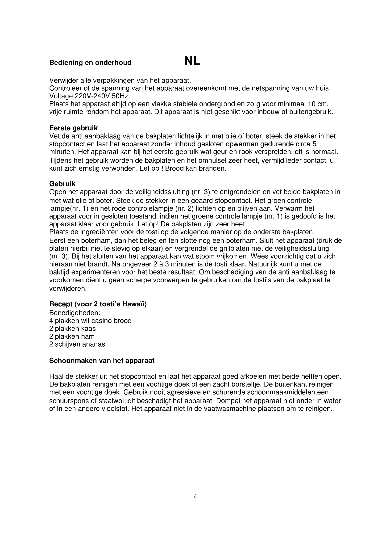 Door eventuele reparatie wordt de oorspronkelijke garantieperiode van 2 jaar niet verlengd. Deze garantie is slechts geldig op Europees grondgebied. Deze garantie heft de gebruikersrechten volgens Europese richtlijn 1944/44CE niet op. Voor vragen of klachten kunt zich melden bij uw verkooppunt. Bewaar altijd uw aankoopbewijs, zonder dit aankoopbewijs kunt u geen aanspraak maken op enige vorm van garantie. Aanwijzingen ter bescherming van het milieu Dit product mag aan het einde van zijn levensduur niet bij het normale huisafval worden gedeponeerd, maar dient bij een speciaal inzamelpunt voor het hergebruik van elektrische en elektronische apparaten te worden aangeboden. Het symbool op artikel, gebruiksaanwijzing en verpakking attendeert u hier op. De gebruikte grondstoffen zijn geschikt voor hergebruik. Met het hergebruik van gebruikte apparaten of grondstoffen levert u een belangrijke bijdrage voor de bescherming van ons milieu. Informeer bij uw lokale overheid naar het bedoelde inzamelpunt. Verpakking Het verpakkingsmateriaal is 100% recyclebaar, lever het verpakkingsmateriaal gescheiden in. Product Dit apparaat is voorzien van het merkteken volgens de Europese richtlijn 2002/96/EG Inzake Afgedankte elektrische en elektronische apparaten(AEEA). Door ervoor te zorgen dat dit product op de juiste manier als afval wordt verwerkt, helpt u mogelijk negatieve consequenties voor het milieu en de menselijke gezondheid te voorkomen. EG-conformiteitsverklaring Dit apparaat is ontworpen om in contact te komen met levensmiddelen en is ontworpen in overeenstemming met de EG-richtlijn 89/109/EEC Dit apparaat is ontworpen, vervaardigd en in de handel gebracht in overeenstemming met: de veiligheidsdoeleinden van de “laagspanningsrichtlijn”nr. 2006/95/EC, de beschermingsvoorschriften van de EMC-richtlijn 2004/108/EC “Electromagnetische compatibiliteit” en de vereiste van richtlijn 93/68/EG.7 Operation and maintenance UK Remove all packaging of the device. Check if the voltage of the appliance corresponds to the main voltage of your home. Rated voltage : AC220-240V 50Hz. First use Grease the anti stick coating slightly of the baking trays with oil or butter, plug the socket in the outlet and leave it without content closed for about 5 minutes warming up. The device may spread some smell and smoke at first use, this is normal. During use, the trays and the shell is very hot, avoid any contact, you can seriously injure Caution! Bread can burn. Use Open the device by the safety lock (No. 3) to unlock and grease two baking trays with a little oil or butter. The green light (No. 1) and the red light (No. 2) and continue to light up. Preheat the device when closed, if the green light (No. 1) is extinguished, the device is ready for use. Caution! The baking plates are very hot. Place the ingredients for the sandwich in the following way on the lower baking trays; First a sandwich, then the siege and finally another sandwich. Close the device (this is not to press the sheets firmly together) and lock the grill plates with safety lock (No. 3). When closing the device can release some steam. Be careful that you do not burn this. After about 2 to 3 minutes, the sandwich is ready. Of course you can experiment with the baking time for best results. To prevent to damage the anti-stick coating you should not use sharp objects to remove the sandwiches from the plate. Recipe (for 2 sandwiches Hawaïi) Amenities: 4 slices white bread 2 slices cheese 2 slices ham 2 discs pineapple Cleaning and maintenance Remove the plug from the wall outlet and allow the device to cool both halves open. Clean the baking plates with a damp cloth or soft brush. Clean the exterior with a damp cloth. Never use harsh and abrasive cleaners, scouring pad or steel wool, which damages the device. Never immerse the device in water or any other liquid. The device in not dishwasher proof.8 IMPORTANT SAFEGUARDS
