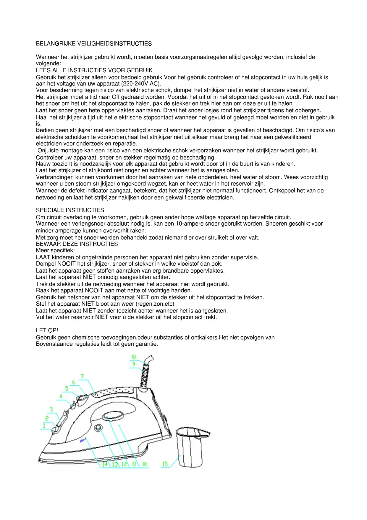 Gebruik het strijkijzer alleen voor bedoeld gebruik.Voor het gebruik,controleer of het stopcontact in uw huis gelijk is aan het voltage van uw apparaat (220-240V AC). Voor bescherming tegen risico van elektrische schok, dompel het strijkijzer niet in water of andere vloeistof. Het strijkijzer moet altijd naar Off gedraaid worden. Voordat het uit of in het stopcontact gestoken wordt. Ruk nooit aan het snoer om het uit het stopcontact te halen, pak de stekker en trek hier aan om deze er uit te halen. Laat het snoer geen hete oppervlaktes aanraken. Draai het snoer losjes rond het strijkijzer tijdens het opbergen. Haal het strijkijzer altijd uit het elektrische stopcontact wanneer het gevuld of geleegd moet worden en niet in gebruik is. Bedien geen strijkijzer met een beschadigd snoer of wanneer het apparaat is gevallen of beschadigd. Om risico’s van elektrische schokken te voorkomen,haal het strijkijzer niet uit elkaar maar breng het naar een gekwalificeerd electricien voor onderzoek en reparatie. Onjuiste montage kan een risico van een elektrische schok veroorzaken wanneer het strijkijzer wordt gebruikt. Controleer uw apparaat, snoer en stekker regelmatig op beschadiging. Nauw toezicht is noodzakelijk voor elk apparaat dat gebruikt wordt door of in de buurt is van kinderen. Laat het strijkijzer of strijkbord niet ongezien achter wanneer het is aangesloten. Verbrandingen kunnen voorkomen door het aanraken van hete onderdelen, heet water of stoom. Wees voorzichtig wanneer u een stoom strijkijzer omgekeerd wegzet, kan er heet water in het reservoir zijn. Wanneer de defekt indicator aangaat, betekent, dat het strijkijzer niet normaal functioneert. Ontkoppel het van de netvoeding en laat het strijkijzer nakijken door een gekwalificeerde electricien. SPECIALE INSTRUCTIES Om circuit overlading te voorkomen, gebruik geen ander hoge wattage apparaat op hetzelfde circuit. Wanneer een verlengsnoer absoluut nodig is, kan een 10-ampere snoer gebruikt worden. Snoeren geschikt voor minder amperage kunnen oververhit raken. Met zorg moet het snoer worden behandeld zodat niemand er over struikelt of over valt.
